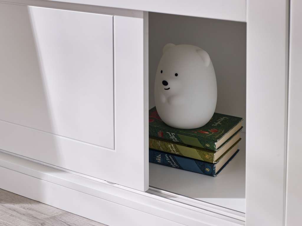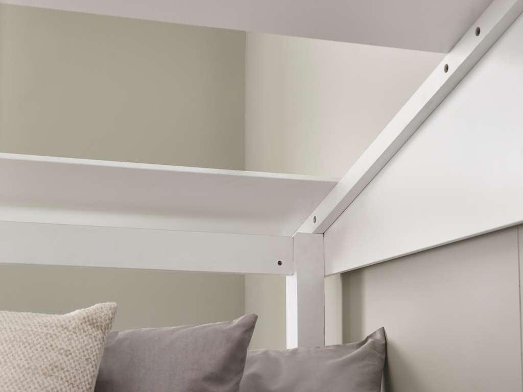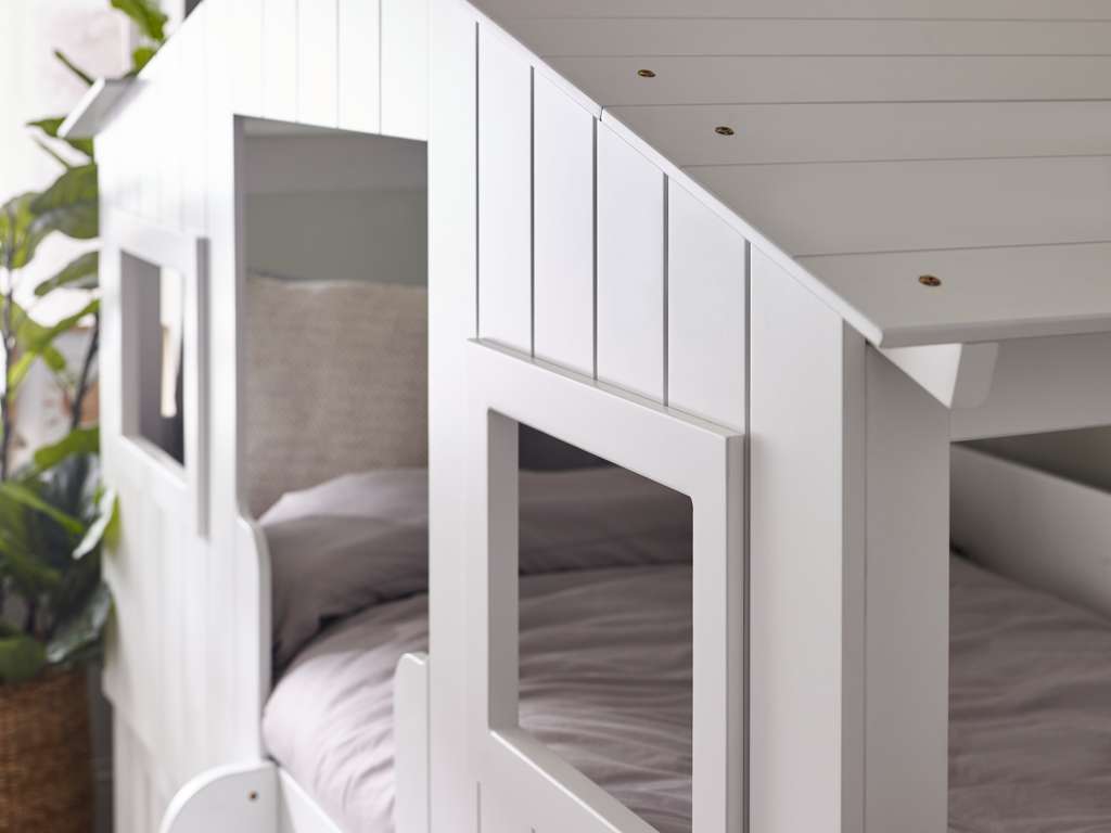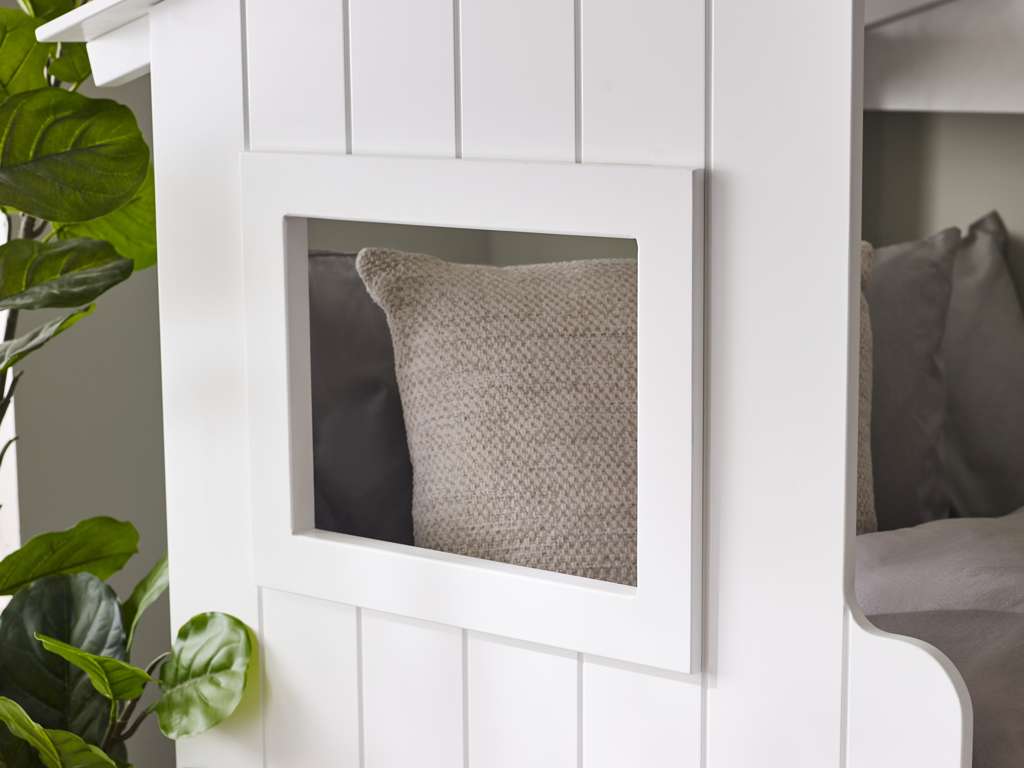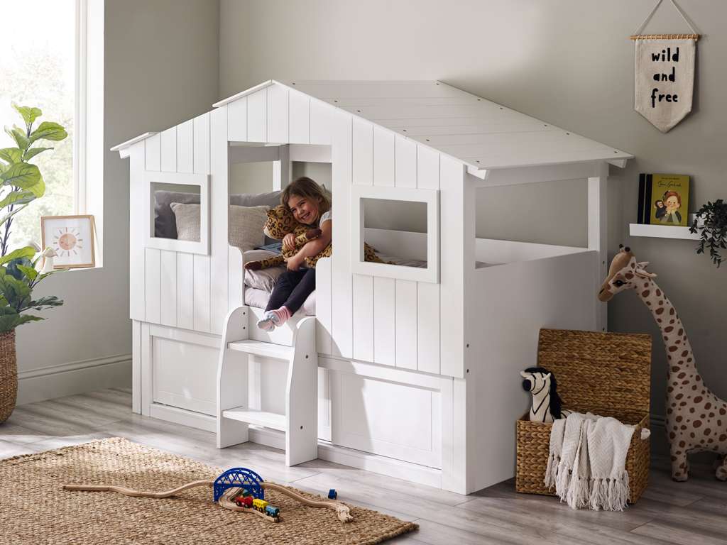 Step into a whimsical woodland wonderland with the Acorn Treehouse Midsleeper & Storage Unit, transforming your child's bedroom into an enchanting escape. This magical treehouse-style bed boasts a charming white panelled front and rooftop adorned with two square windows, sparking imaginative adventures. Watch as your little explorer climbs into their cosy retreat using the two small step ladder and gets lost in endless daydreams while peering out of the roof gap. Below awaits a slide-door storage unit, the perfect hideaway for stowing books and toys - ensuring a tidy and organised space.