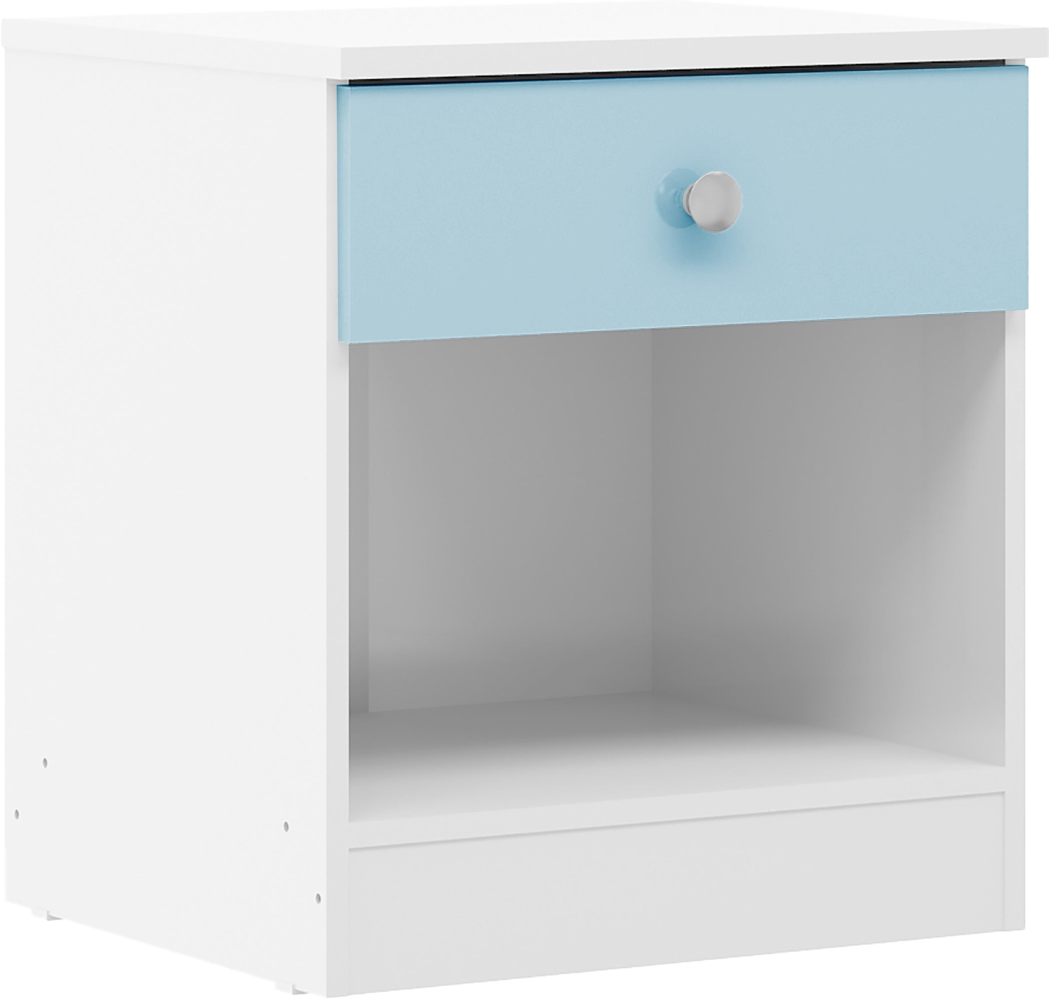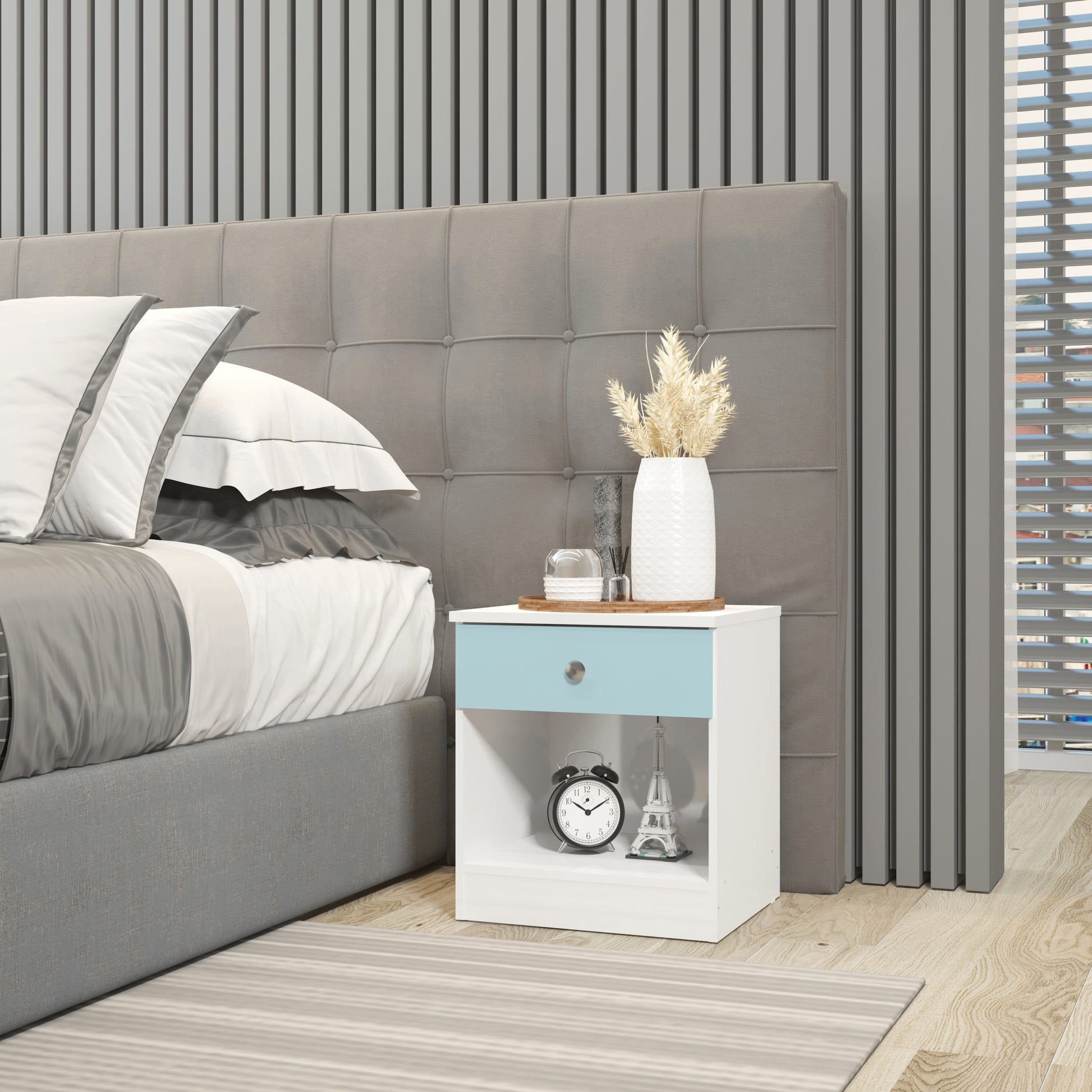 Make space feel calm and considered with the Denver 1 Drawer Bedside finished in White/Blue Gloss. Thoughtfully designed for busy family spaces, it offers smart storage that keeps things tidy to keep life neatly organised. Sturdy by design, it pairs simple lines with a quality feel that lasts.