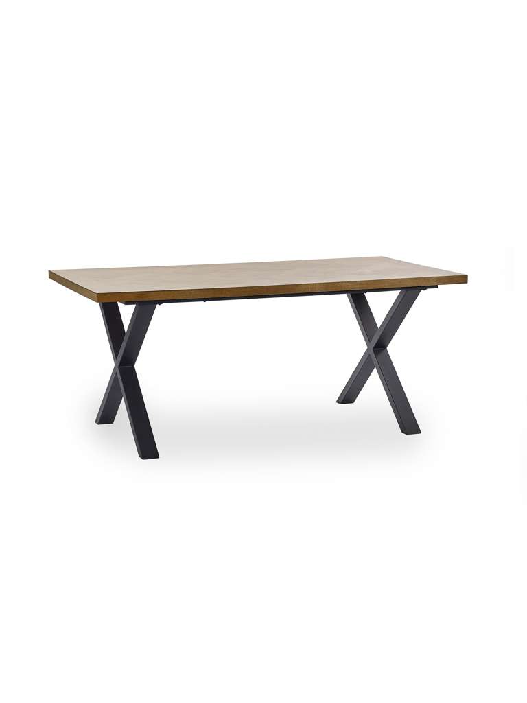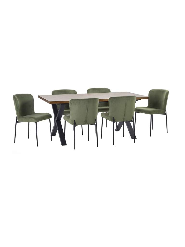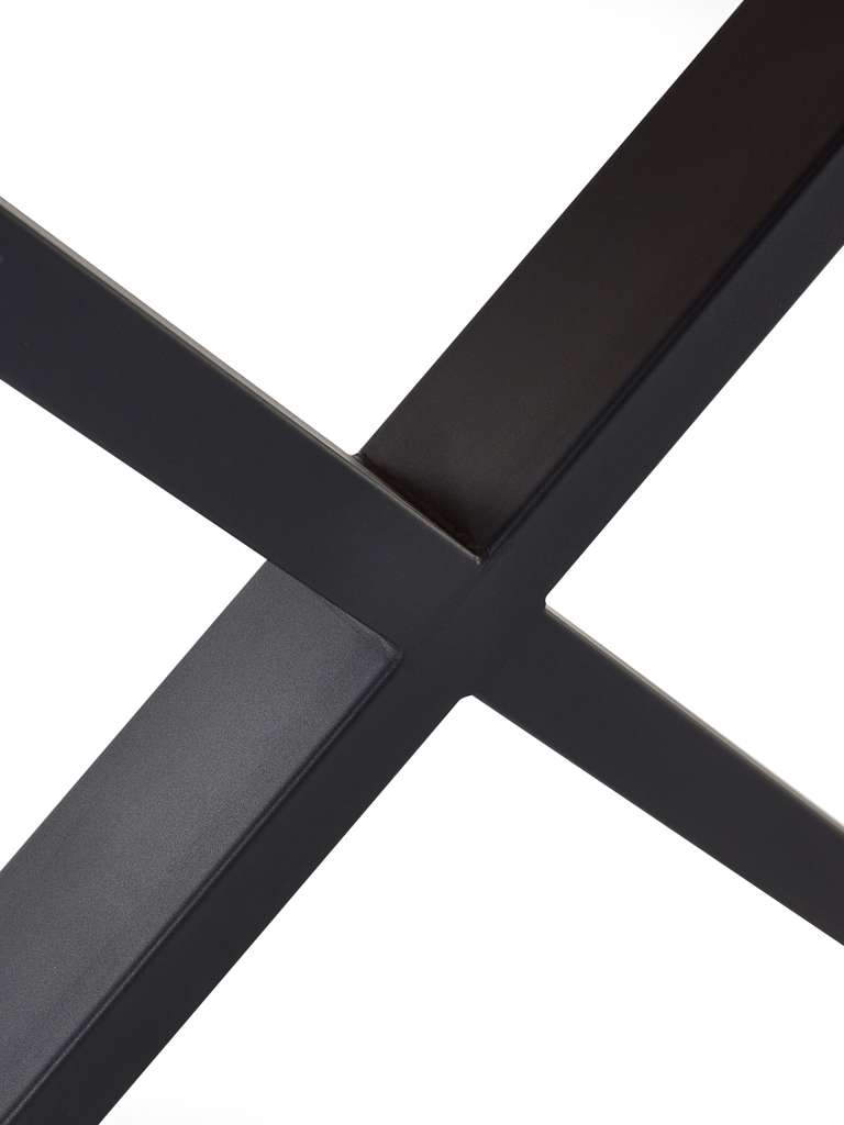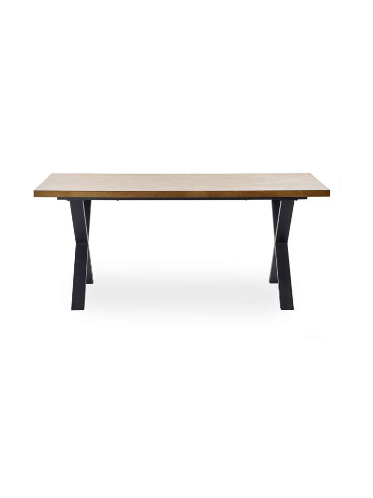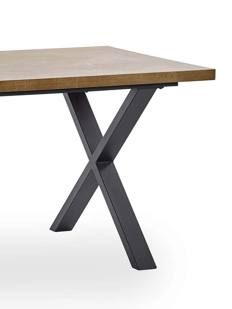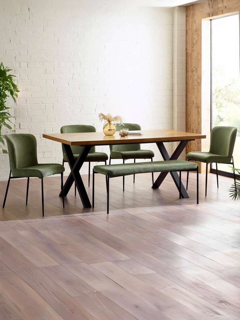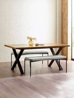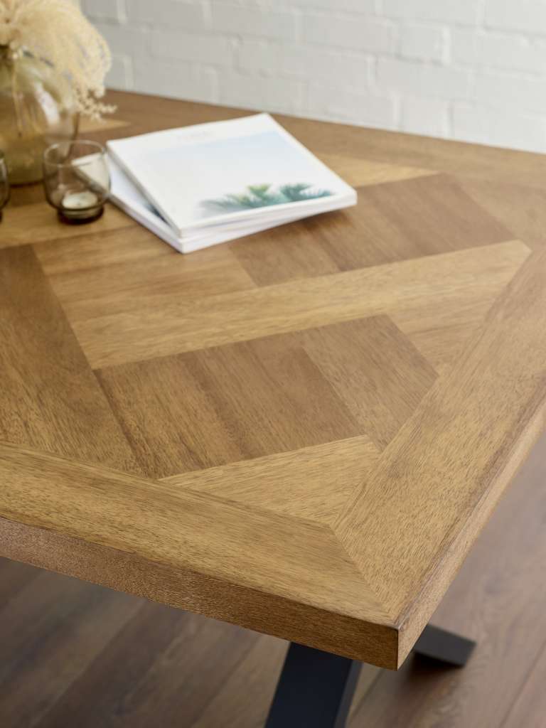 The Aron Dining Table blends craftsmanship with contemporary style. Its wooden top showcases an intricate herringbone pattern, adding texture and visual interest to your dining space. The rich wood grain, paired with the detailed pattern, creates a timeless look that complements both modern and traditional interiors. Supported by bold, crossed black metal legs, the piece offers robust durability with an industrial edge. Whether hosting gatherings or enjoying everyday meals, it serves as the perfect centerpiece. Minimal assembly is required, ensuring a seamless setup for your home.