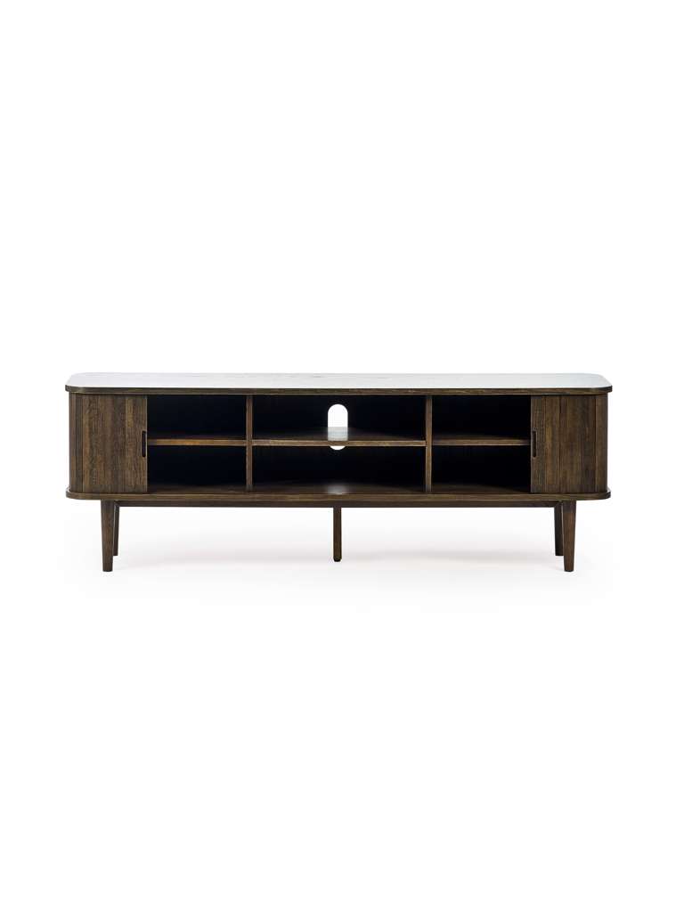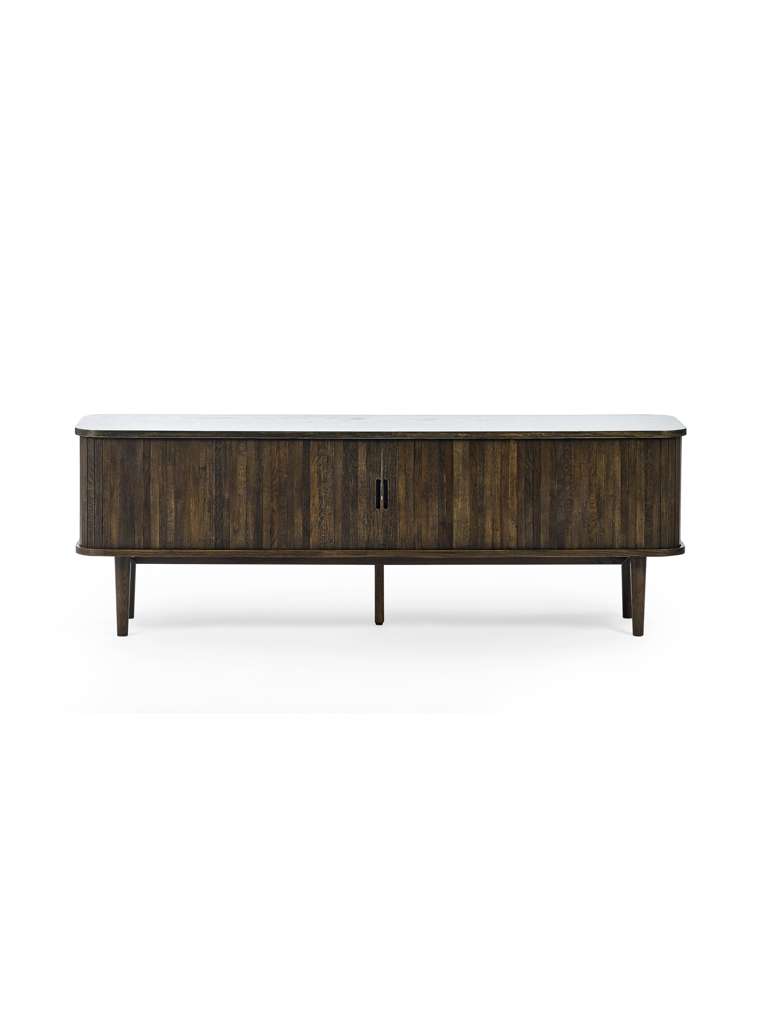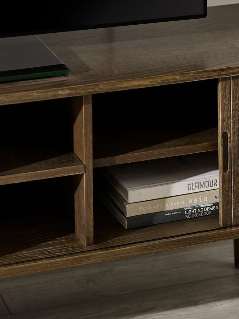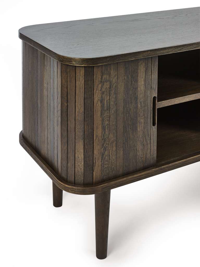 Make a statement in your living space with the Arya Media Unit, combining both style and functionality. Crafted in a rich dark oak effect with striking slatted sliding tambour doors. Inside, you'll find ample storage with six shelves and additional smaller side shelvesâideal for organizing CDs, DVDs, game boxes, and displaying decorative pieces. The two cut-out handles and four sleek Nordic tapered legs add a modern touch, elevating the look of any room. Whether you're tidying up or showcasing your favorite items, this versatile piece offers the perfect blend of design and practicality. Simple assembly required to have it functional and ready quickly.