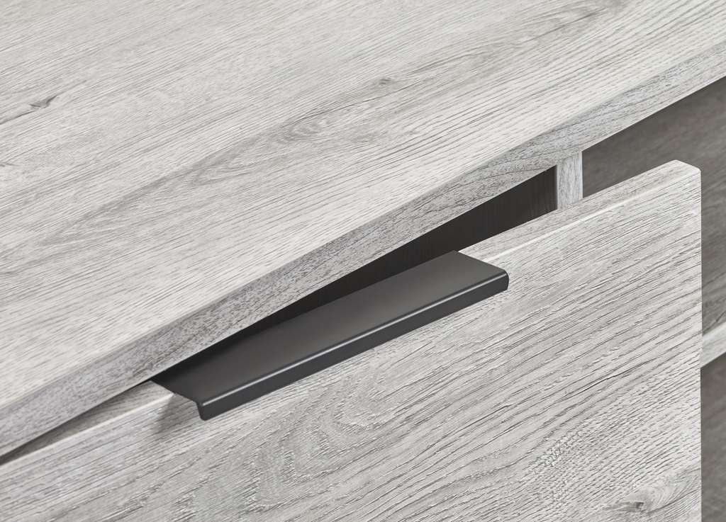 Discover the seamless blend of style and simplicity with the Bali TV Unit in Grey Oak. Crafted using revolutionary click furniture technology, this unit seamlessly combines high-quality craftsmanship with effortless assembly. The modern grey oak finish, complemented by contrasting black legs and handles, brings a classic industrial aesthetic to your living room. Featuring a spacious cupboard and two pull-out drawers for organised storage, along with center shelving for additional storage and display options.