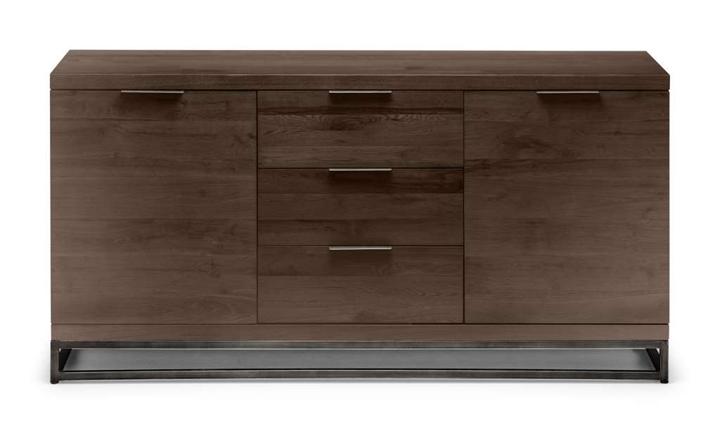 Made from solid oak, this Sideboard offers a rustic dark oak finish emphasising the stunning natural wood grain. The Brooklyn Sideboard offers a vintage edge featuring industrial style metal legs. Featuring two spacious cupboards with shelves, and three drawers, this sideboard is perfect for a wide range of modern decor. Part of the Julian Bowen Brooklyn Dining and Occasional Collection.