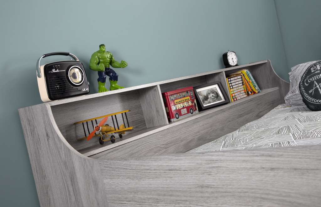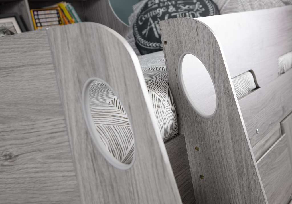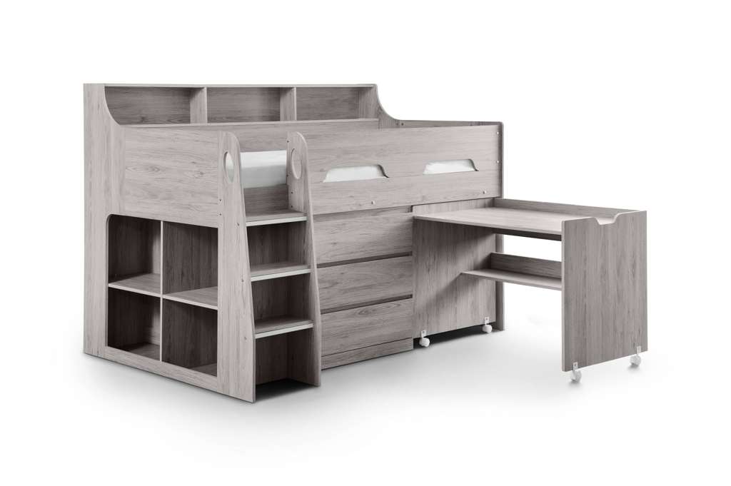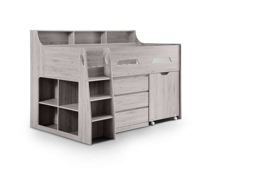 The Jupiter Midsleeper is an ideal space saver, featuring a chest of drawers, various shelves and a pull out desk. Available in three colour options, White, Grey Oak or Anthracite, the Jupiter is the perfect match for any kids bedroom, creating a fresh modern design. The robust ladder features beautiful cut out handles, with glow in the dark strips on the steps for added safety.