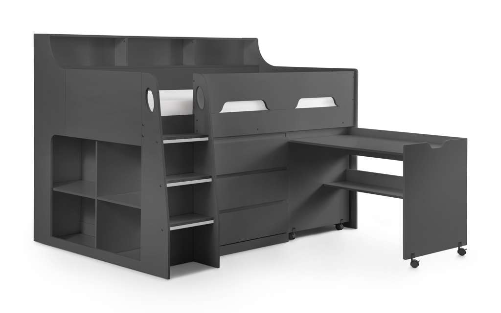 The Jupiter Midsleeper is an ideal space saver, featuring a chest of drawers, various shelves and a pull out desk. Available in three colour options, White, Grey Oak or Anthracite, the Jupiter is the perfect match for any kids bedroom, creating a fresh modern design. The robust ladder features beautiful cut out handles, with glow in the dark strips on the steps for added safety.
