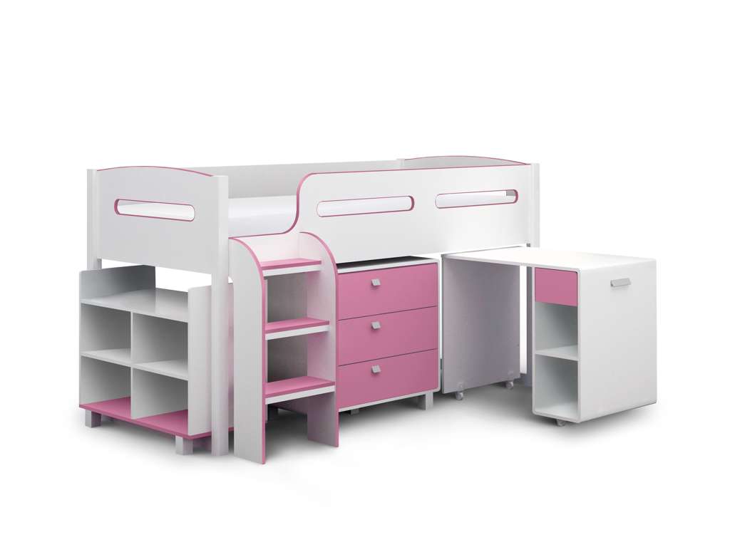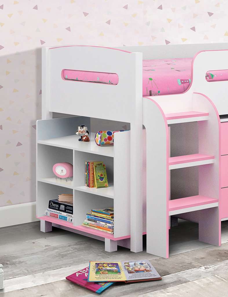 The Kimbo Cabin Bed is available in a choice of colours to suit all styles. The Kimbo has been designed with a pull out desk, a 3 drawer chest and shelving unit for books etc. The product also takes a standard UK single mattress (90cm x 190cm).