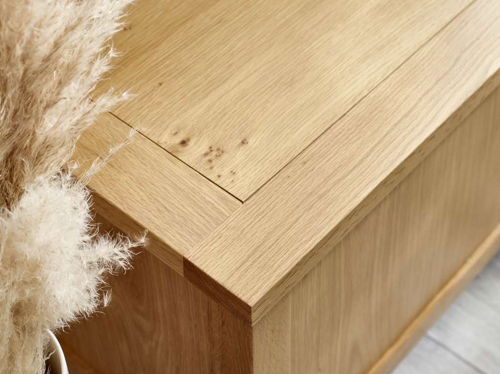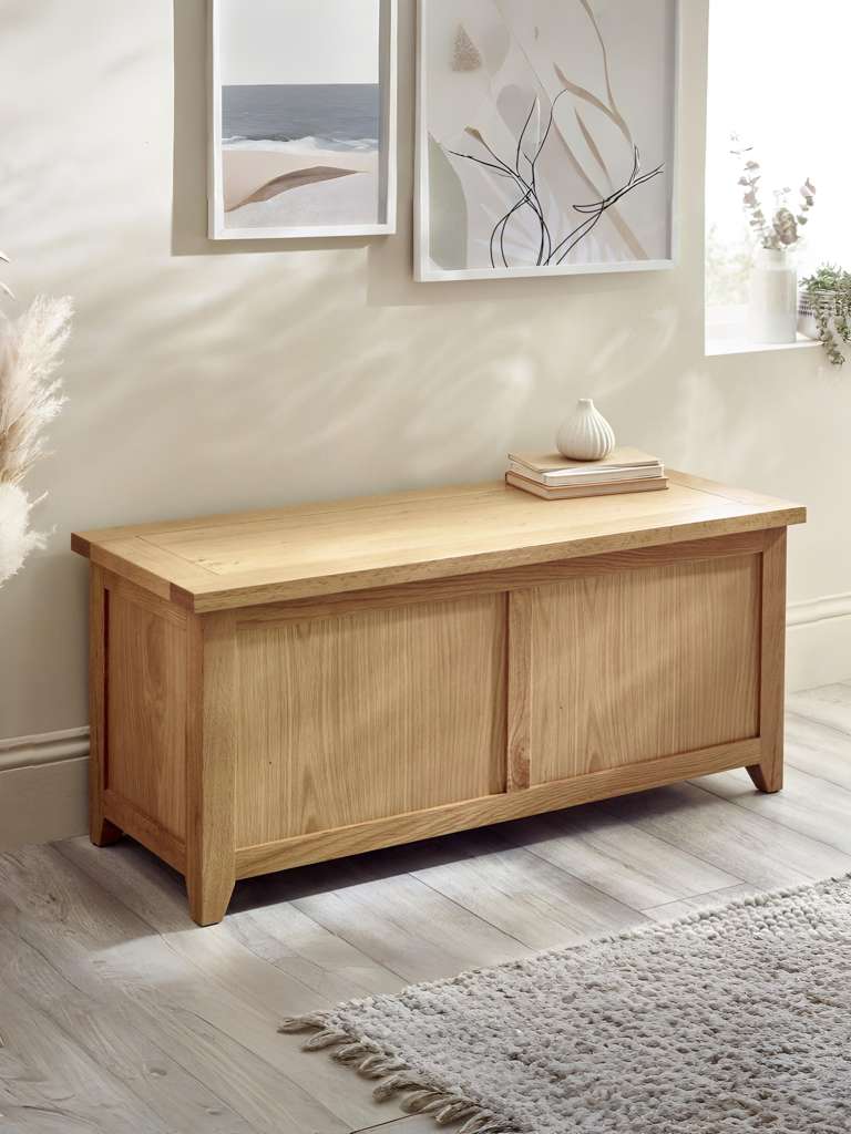 Experience both style and functionality with the Mallory Storage Bench. Crafted from solid oak and oak veneers, this bench boasts a clean and simple design that effortlessly complements any decor. Its seamless opening mechanism allows for easy access, while the generous storage space inside provides ample room for all your essentials. Whether placed in the entryway, bedroom, or living room, this versatile piece adds both charm and practicality to your space. Minimal assembly is required, ensuring a hassle-free setup.