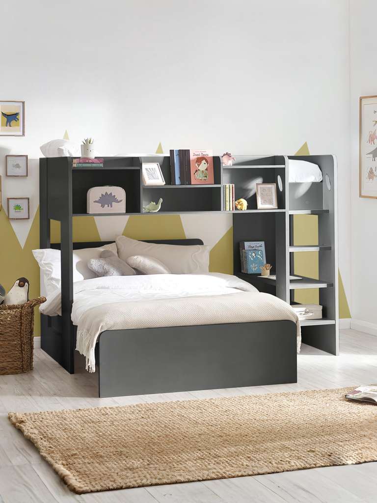 Experience the perfect blend of style, functionality, and fun with the Owen Bunk Bed in Anthracite. This versatile piece features a cosy single bed perched above a removable small double underbed, offering flexibility for sleepovers or extra lounging space. The built-in shelving, both inside and on the front, provides ample room to showcase decorative items, books, and toys, keeping your child's room organised and vibrant. The study ladder ensures easy access to the top bunk while adding a touch of modern design. Transform any room into a stylish haven of creativity and comfort. Mattress sold separately.