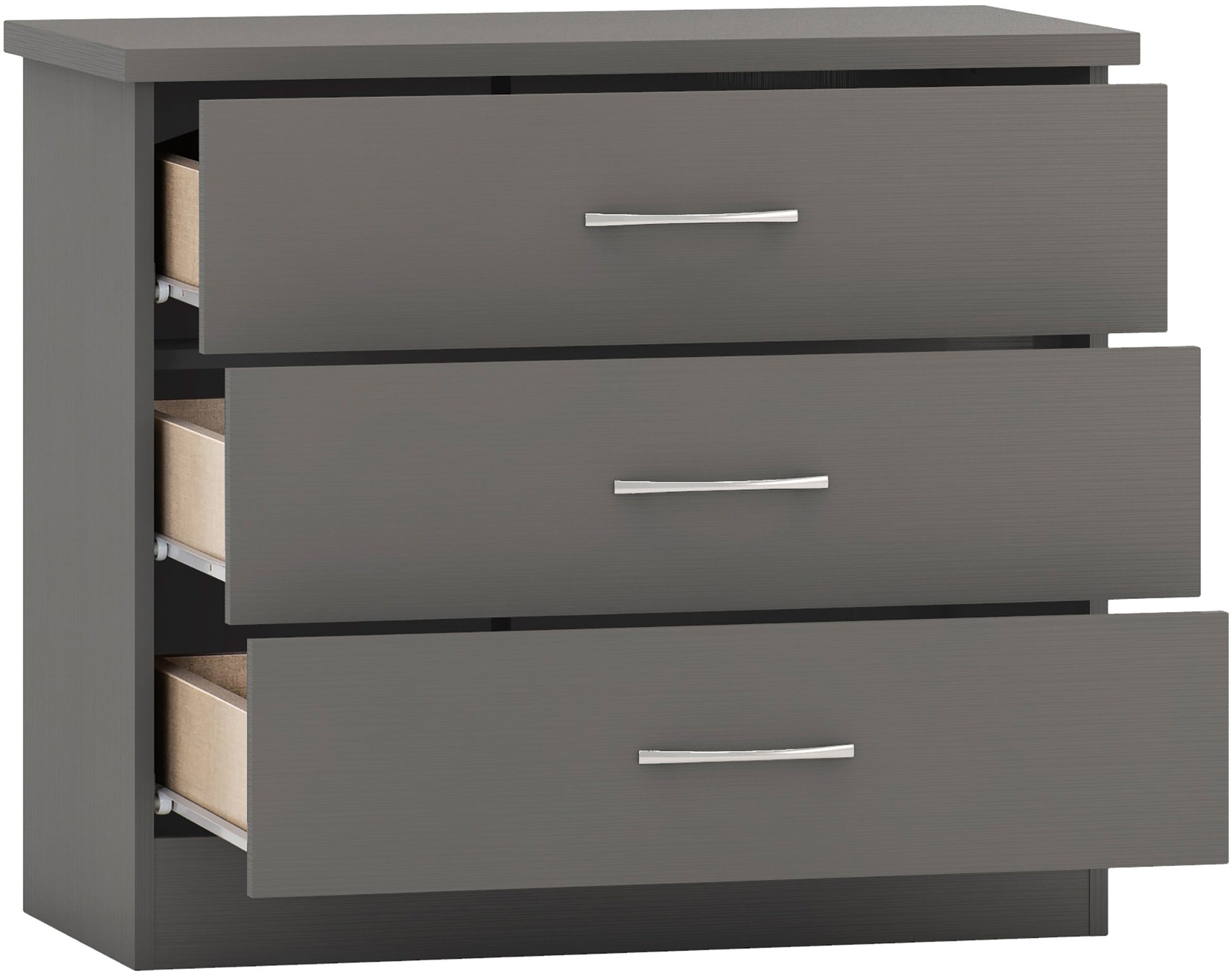 Make space feel calm and considered with the Nevada 3 Drawer Chest in a 3D Effect Grey. Thoughtfully designed for busy family spaces, it offers smart storage that keeps things tidy to keep life neatly organised. Sturdy by design, it pairs simple lines with a quality feel that lasts.
