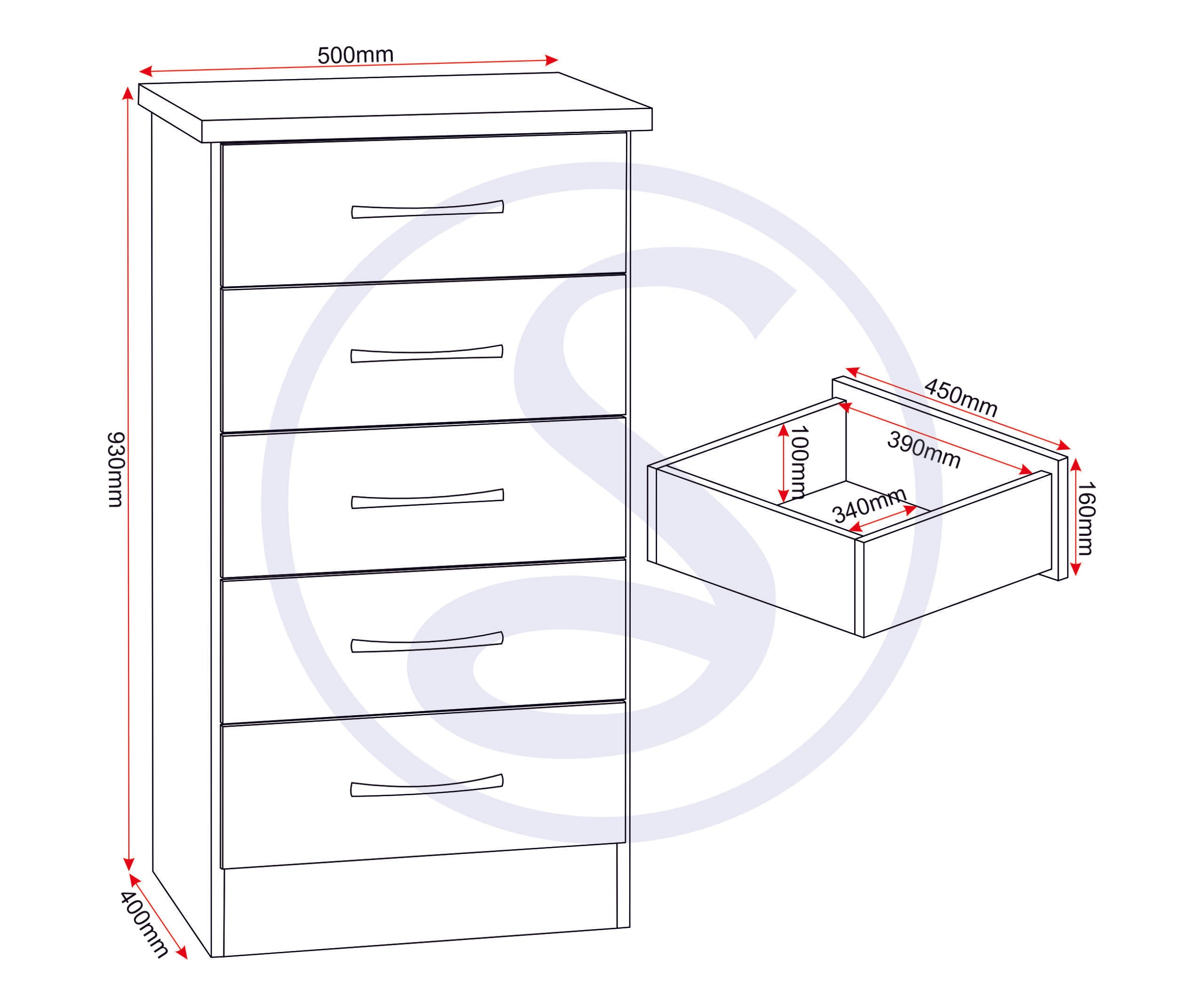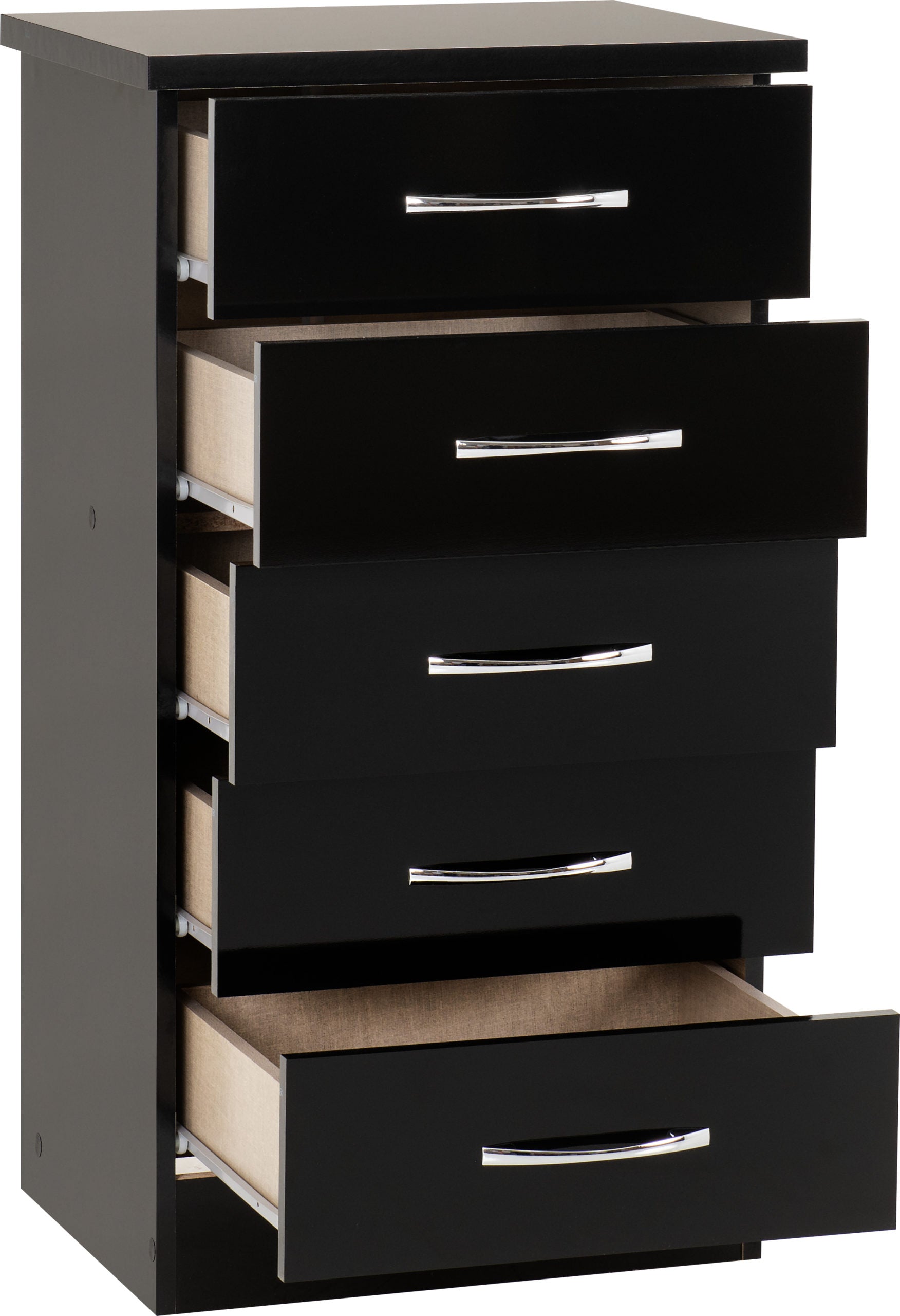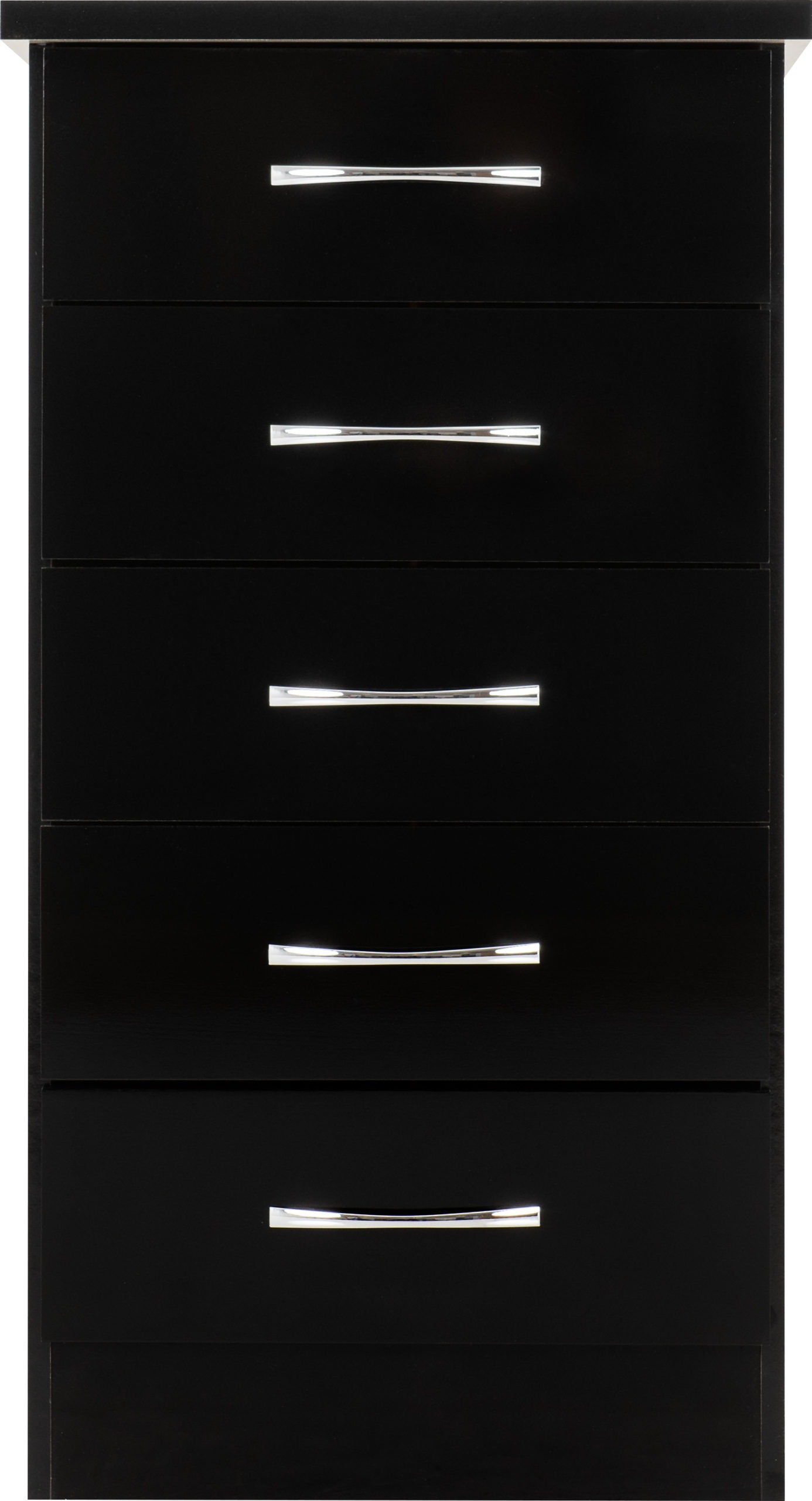 Make space feel calm and considered with the Nevada 5 Drawer Narrow Chest finished in Black Gloss. Thoughtfully designed for busy family spaces, it offers smart storage that keeps things tidy to keep life neatly organised. Its pared-back look sits comfortably with a range of interiors, from cosy to contemporary.