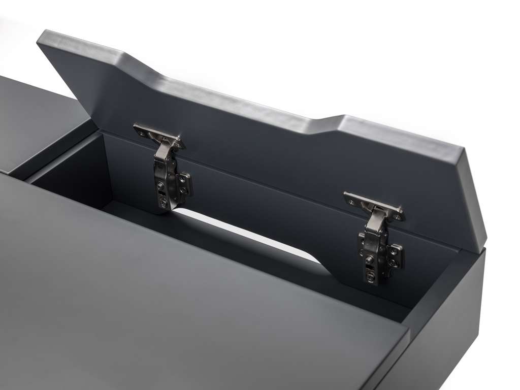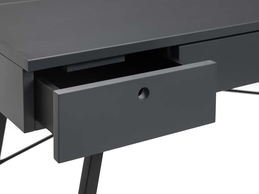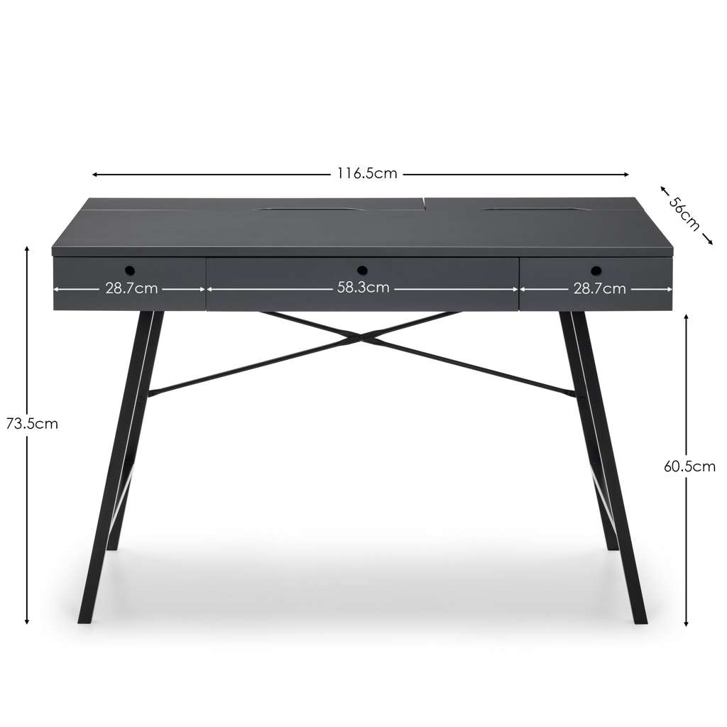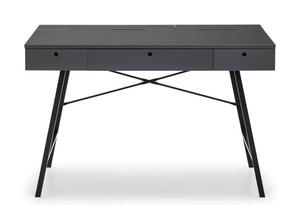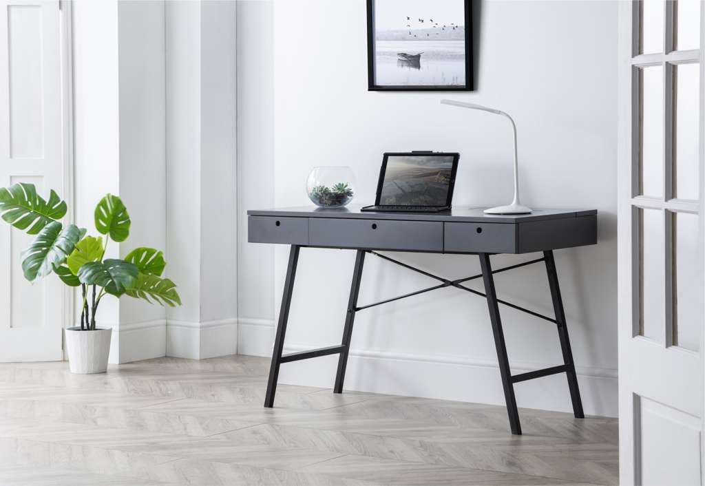 The Trianon Desk is the perfect addition to upgrade your workspace. This simple, Scandinavian design offers copious amounts of storage for your office supplies, featuring pull-out drawers at the front and 3 lift-up storage compartments with stunning recessed handles. The Trianon Desk is available in a grey or white finish upon slender, black metal legs, ideal for smaller working areas