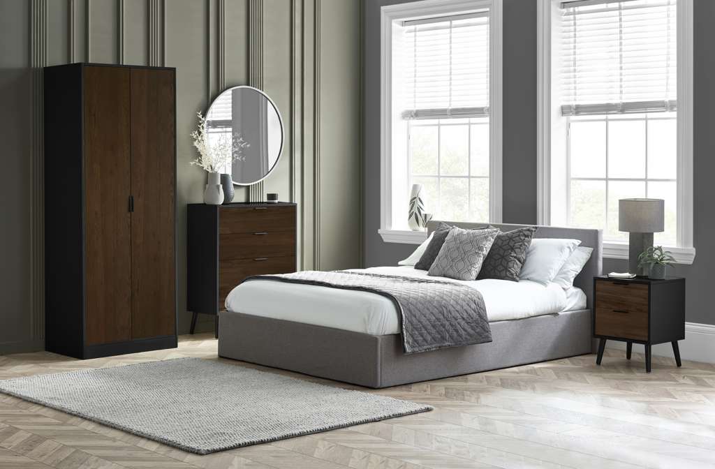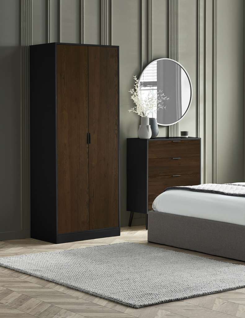 The Alba 2 Door Wardrobe in Walnut and Black offers a modern, sophisticated storage solution for your bedroom. The warm walnut finish on the doors contrasts beautifully with sleek black accents, creating a bold and stylish design. Inside, it provides ample space for organising your clothing and accessories, featuring a full-length hanging rail and spacious shelves. The black handles add a contemporary touch, enhancing its sleek, modern look. Combining practicality and elegance, this wardrobe is a standout addition to any modern bedroom.