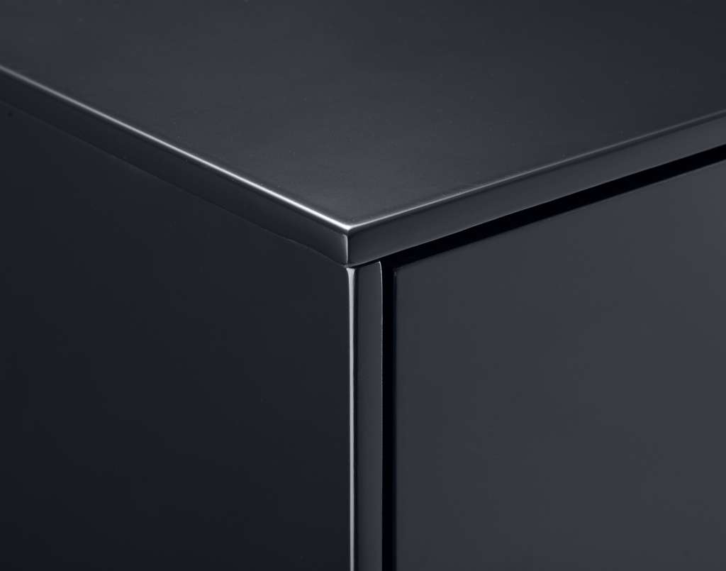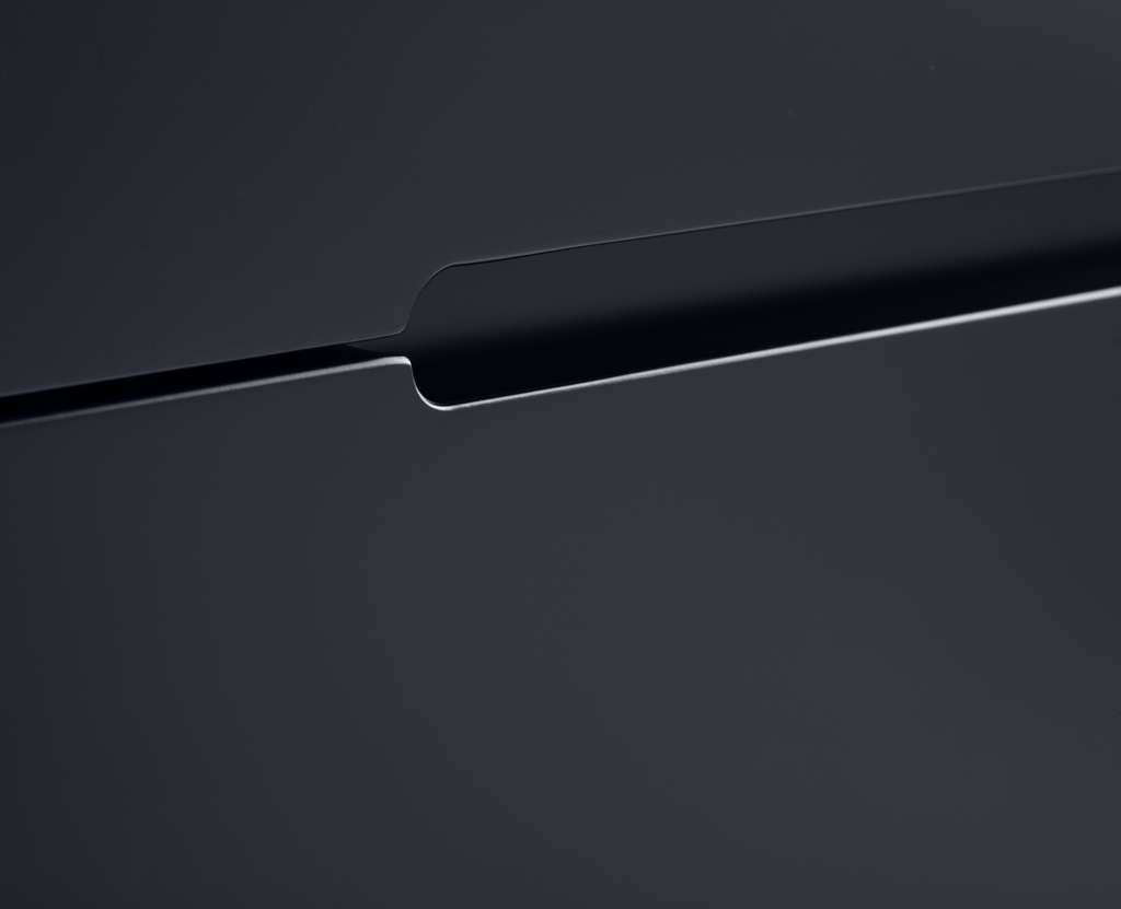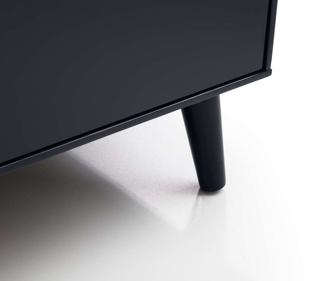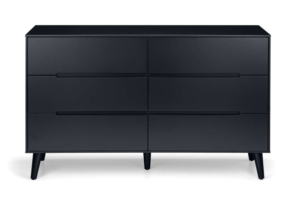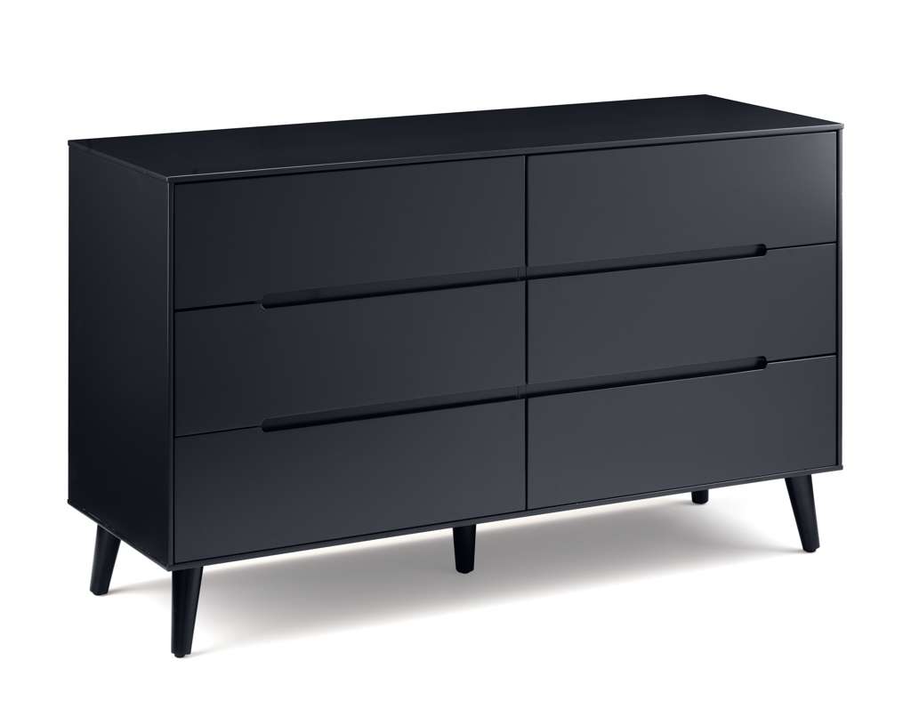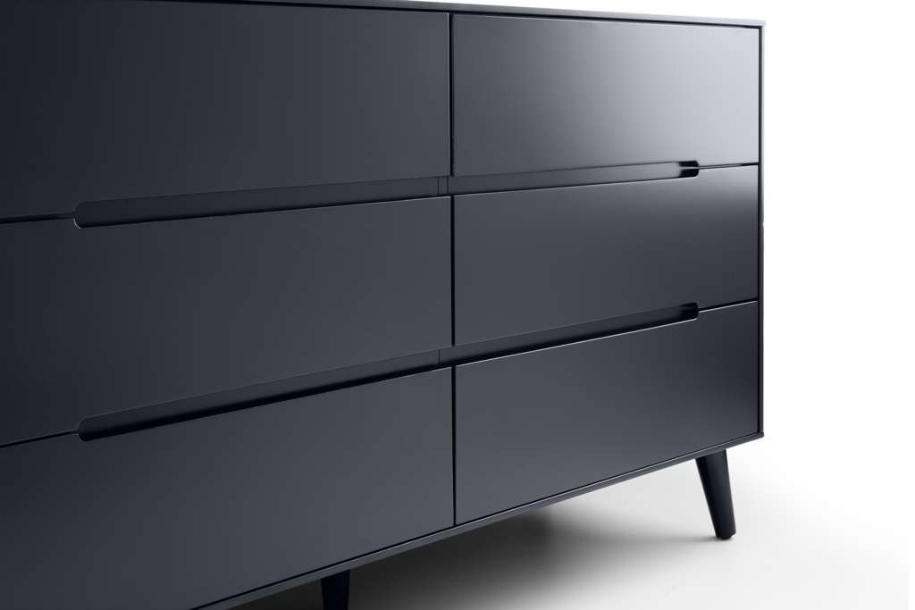 A stylish, retro-inspired wide chest with six large drawers in an immaculate matt anthracite lacquered finish, with complementary tapered oak finish legs and recessed handles to provide easy opening. This beautiful chest can also serve as a stylish dressing table. The sleek Scandinavian feel fits beautifully with any décor.