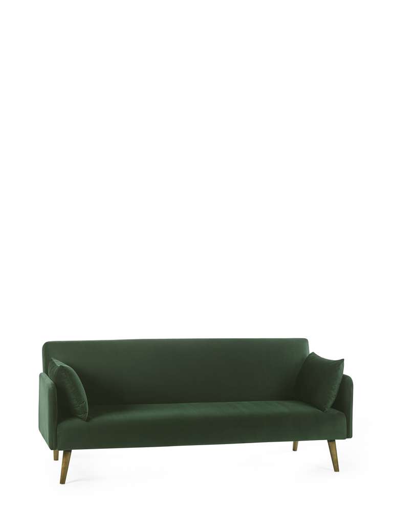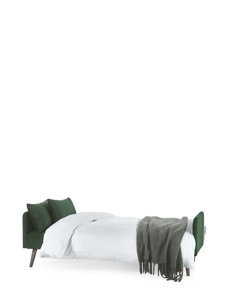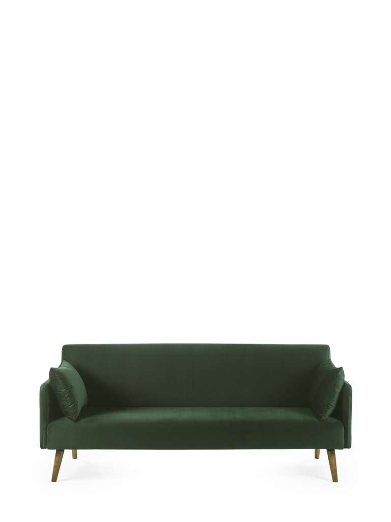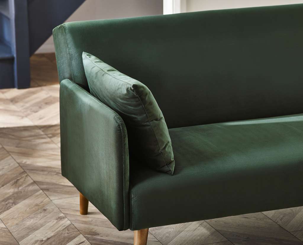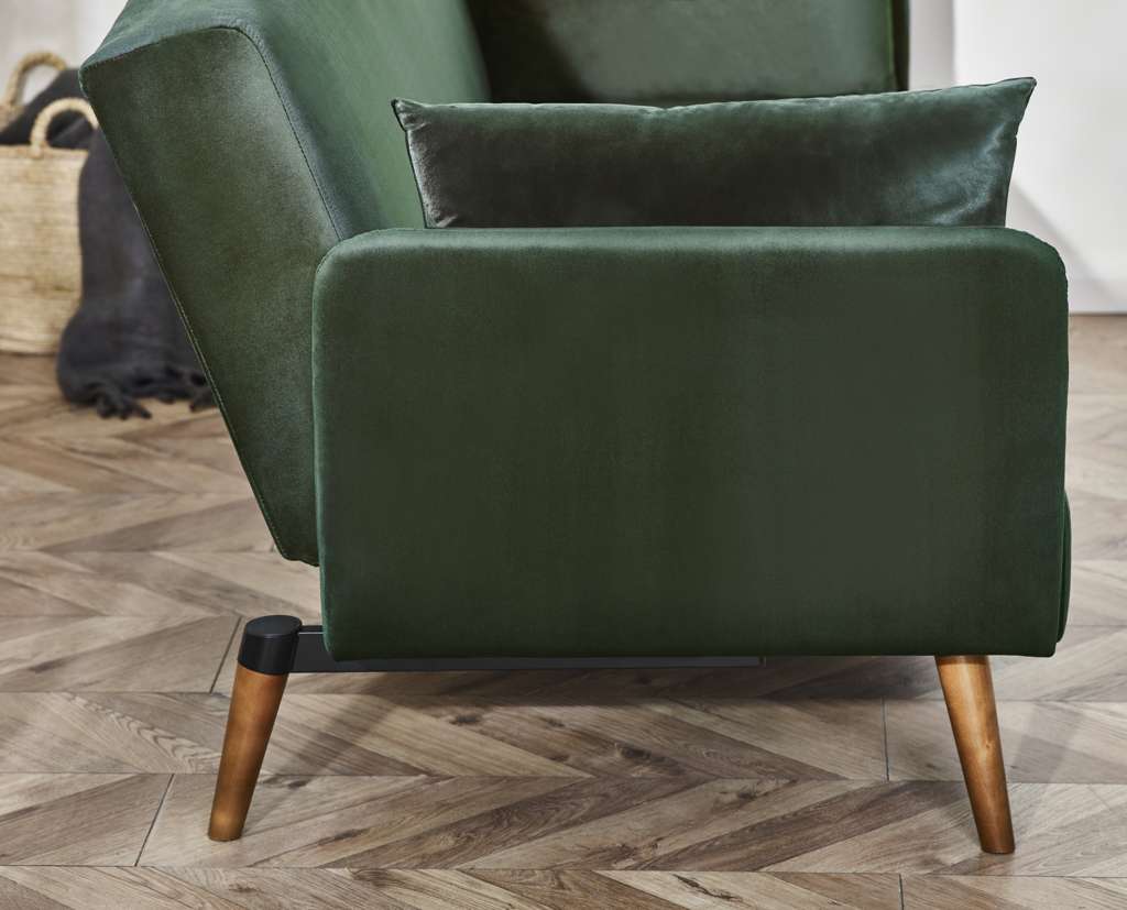 Elevate your space with the Andi Sofa Bed in Dark Greenâa perfect mix of retro style and modern elegance, bringing both comfort and versatility to your home. Wrapped in a rich, dark green fabric, this piece adds a bold touch to any decor. With a simple fold-out design, it quickly transforms into a cosy bed, ideal for overnight guests. Two matching pillows are included for extra comfort and style. Supported by pale wood-effect legs, it brings warmth and sophistication, making it an ideal choice for compact or multipurpose rooms.