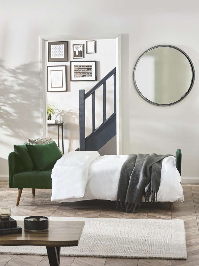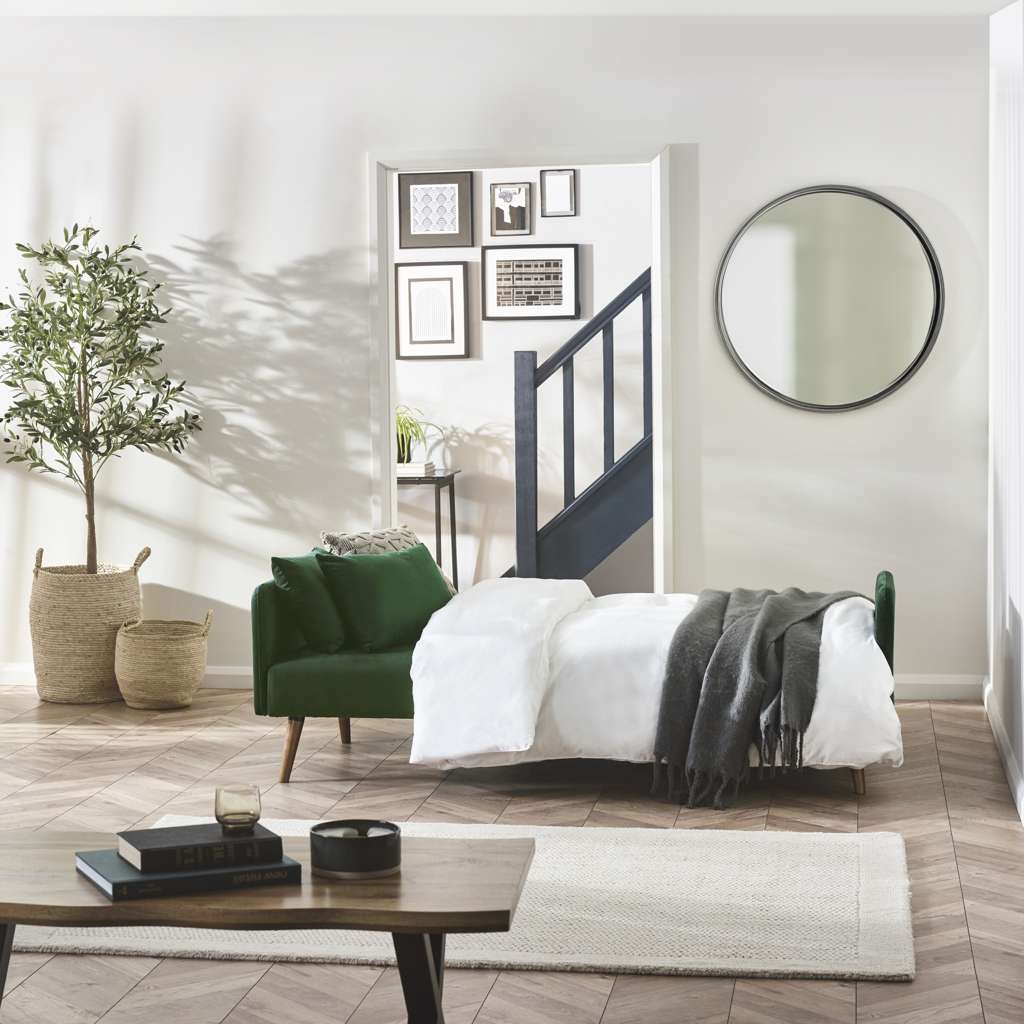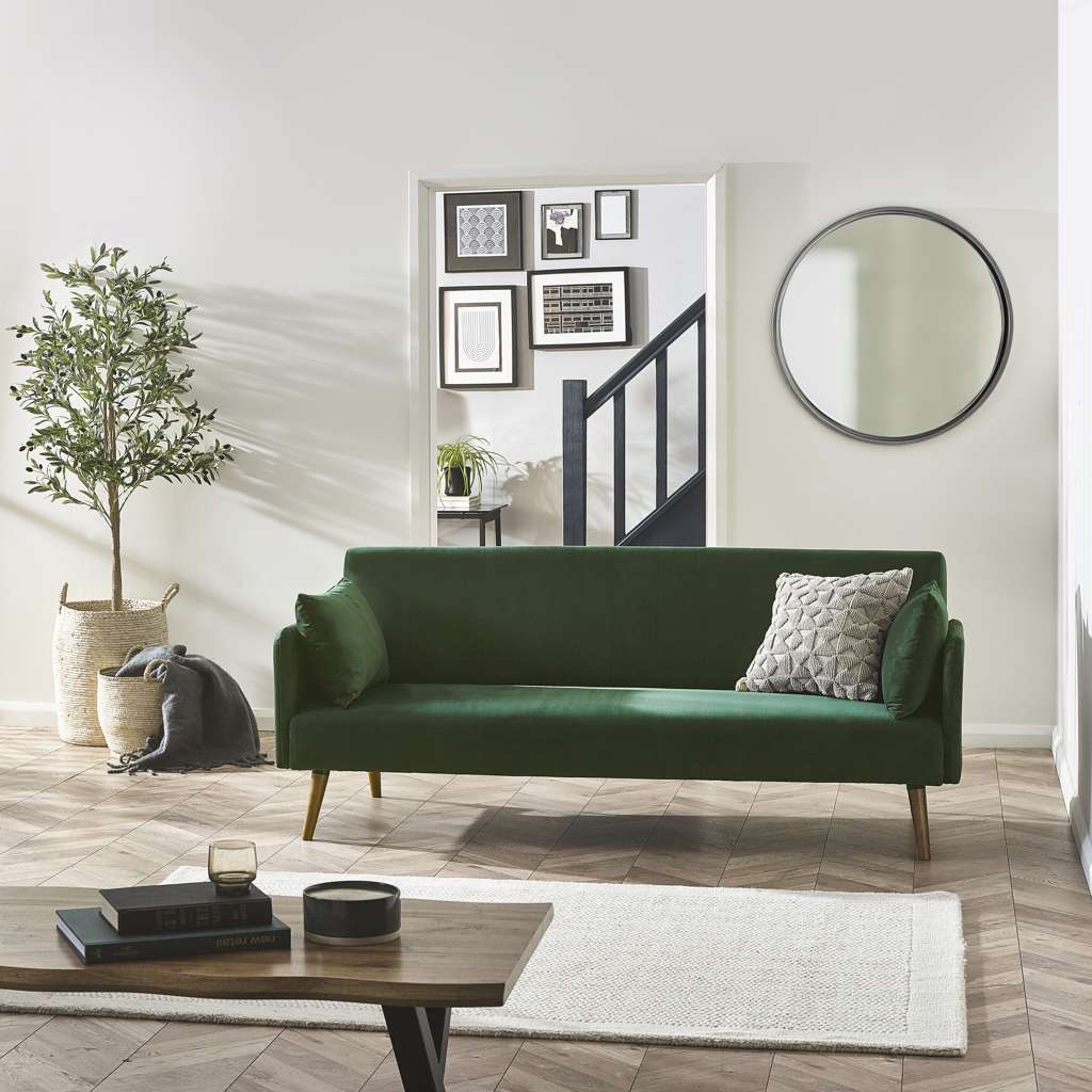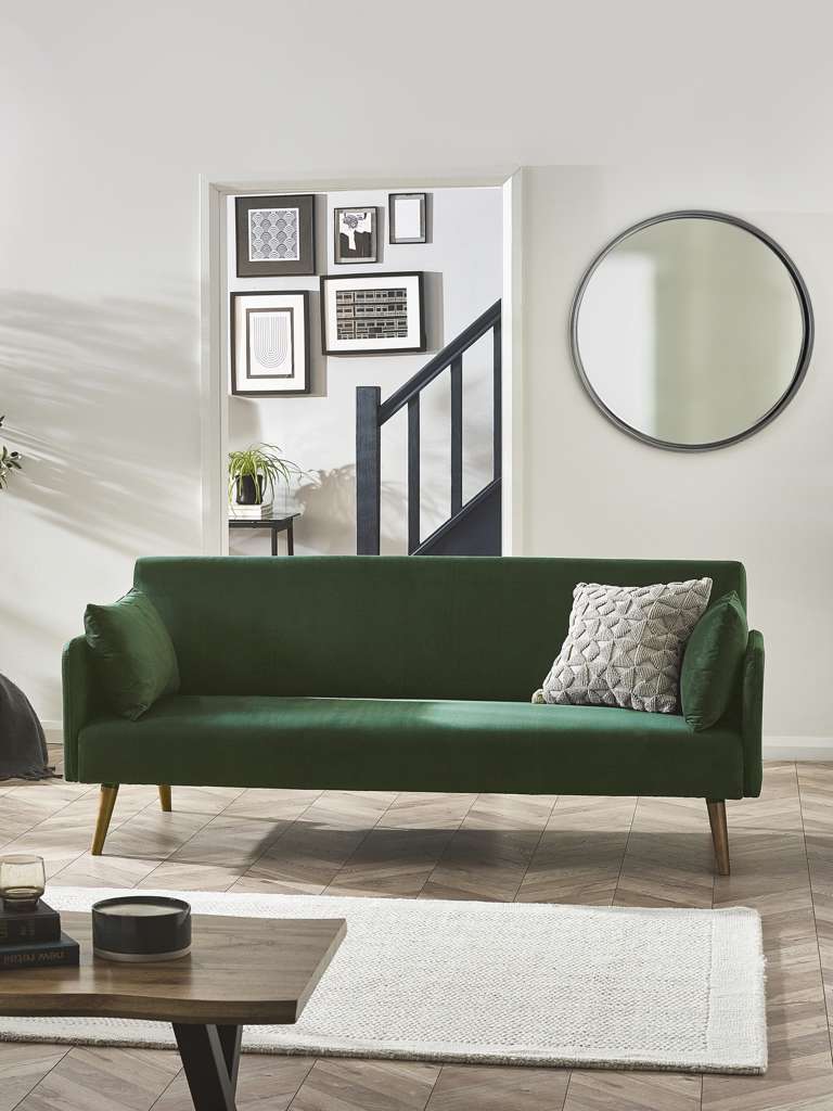 Elevate your space with the Andi Sofa Bed in Dark Greenâa perfect mix of retro style and modern elegance, bringing both comfort and versatility to your home. Wrapped in a rich, dark green fabric, this piece adds a bold touch to any decor. With a simple fold-out design, it quickly transforms into a cosy bed, ideal for overnight guests. Two matching pillows are included for extra comfort and style. Supported by pale wood-effect legs, it brings warmth and sophistication, making it an ideal choice for compact or multipurpose rooms.