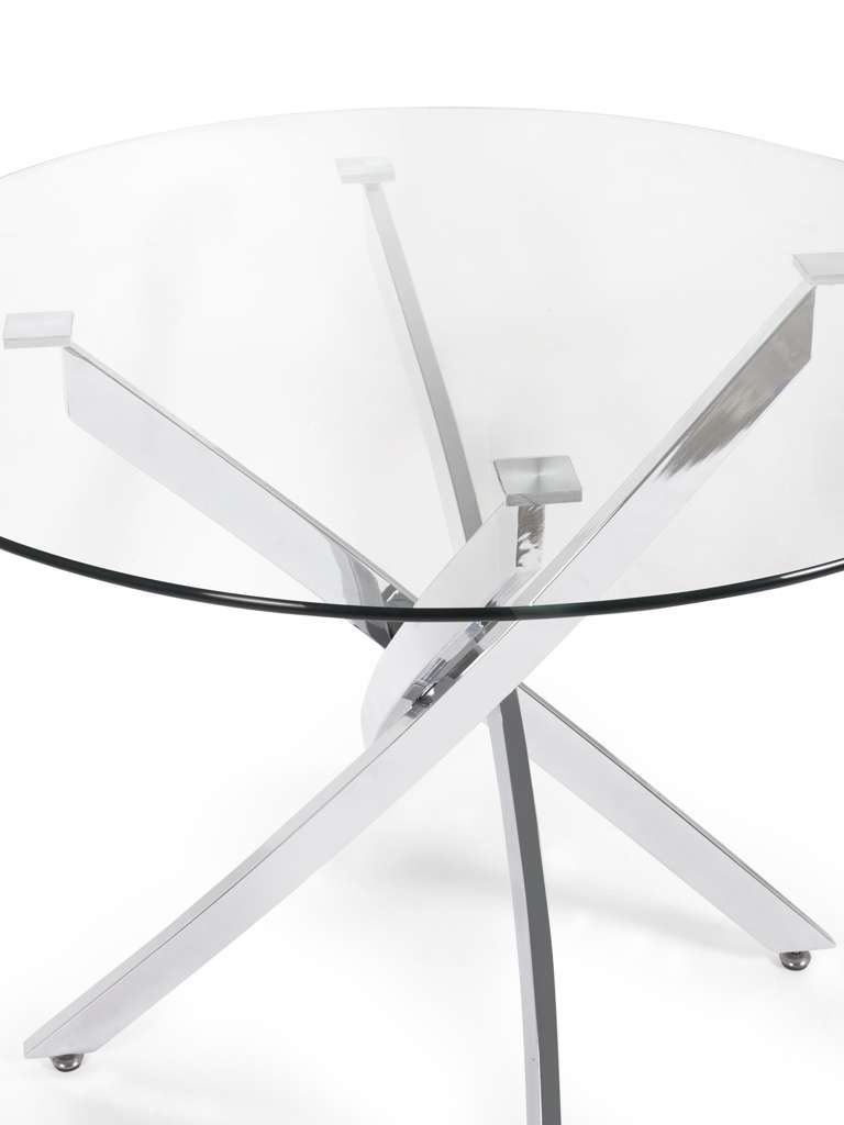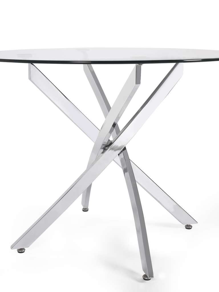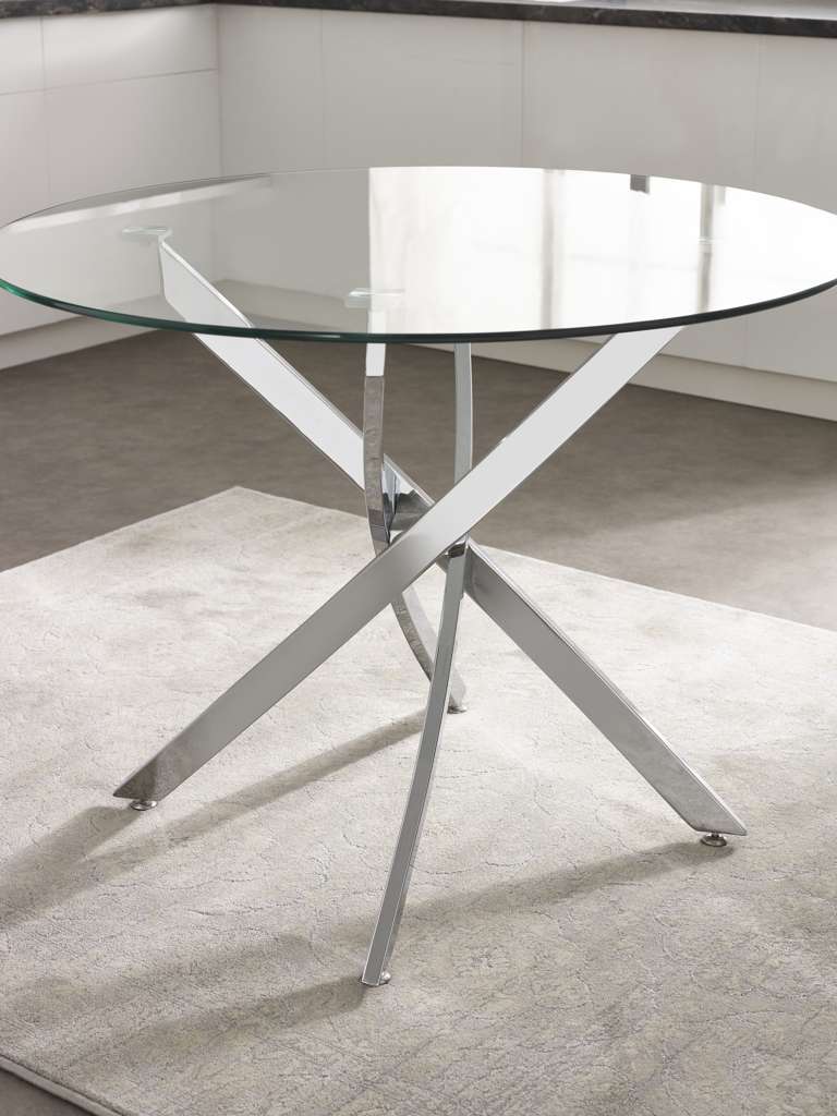 The Anderson Round Glass Dining Table is the perfect combination of sleek style and modern elegance. The clear, circular tempered glass top creates a light and airy feel, highlighting the beauty of your space. A sturdy crossover chrome base adds a bold, contemporary touch while ensuring both stability and visual appeal. Ideal for any dining room or kitchen, this table blends sophistication with functionality, making it an ideal centerpiece for memorable meals and gatherings.
