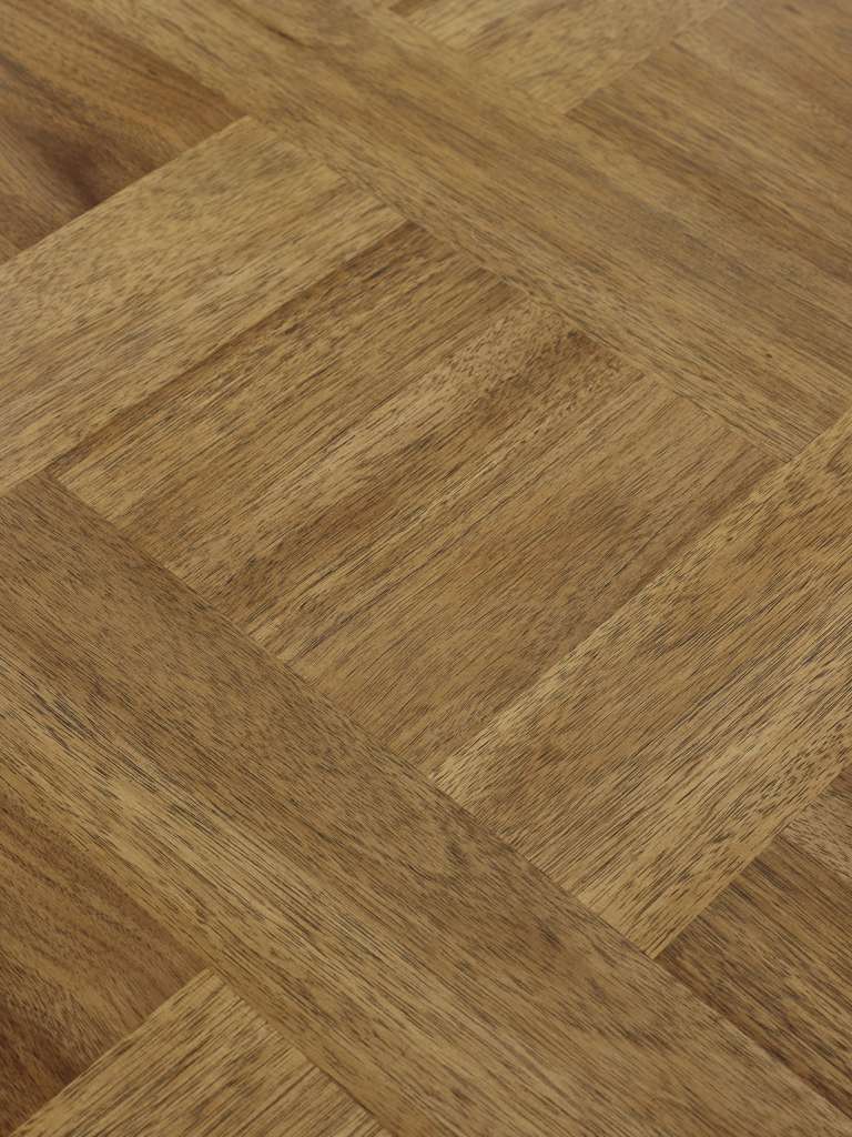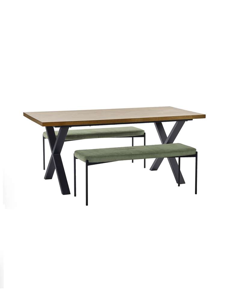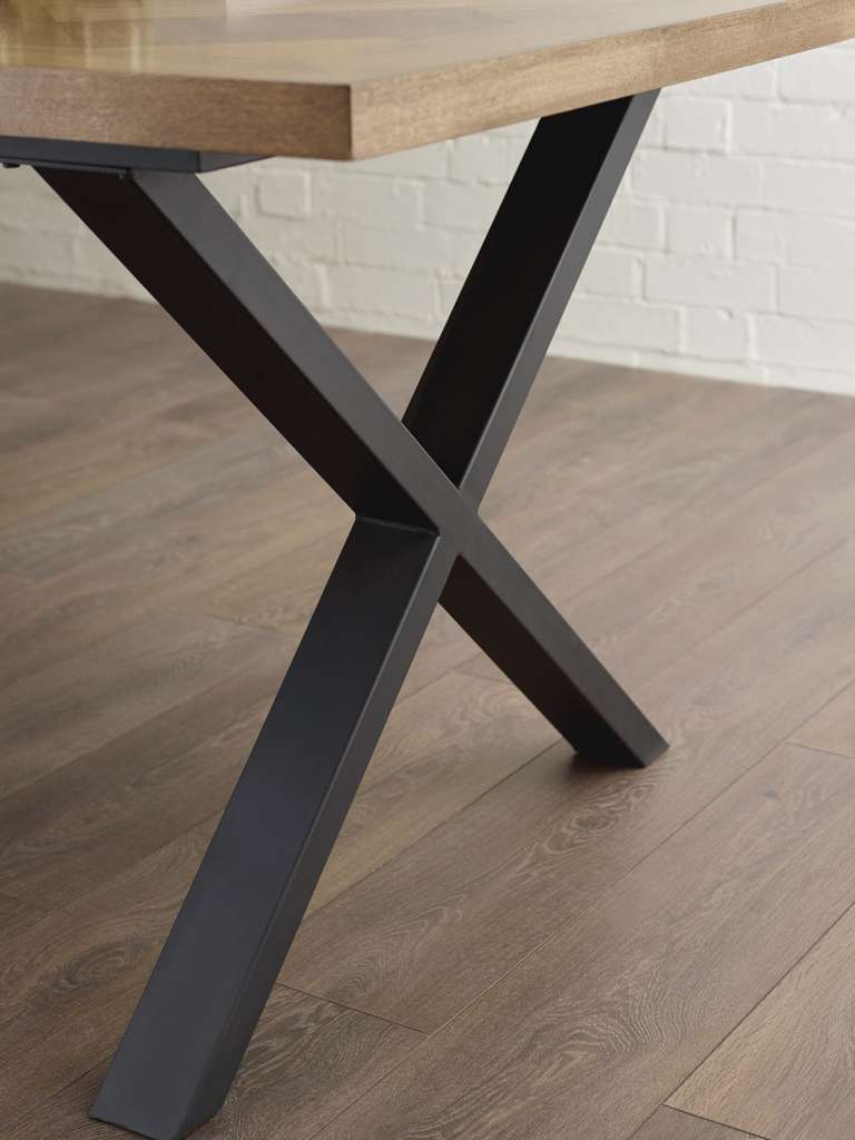 The Aron Dining Table blends craftsmanship with contemporary style. Its wooden top showcases an intricate herringbone pattern, adding texture and visual interest to your dining space. The rich wood grain, paired with the detailed pattern, creates a timeless look that complements both modern and traditional interiors. Supported by bold, crossed black metal legs, the piece offers robust durability with an industrial edge. Whether hosting gatherings or enjoying everyday meals, it serves as the perfect centerpiece. Minimal assembly is required, ensuring a seamless setup for your home.