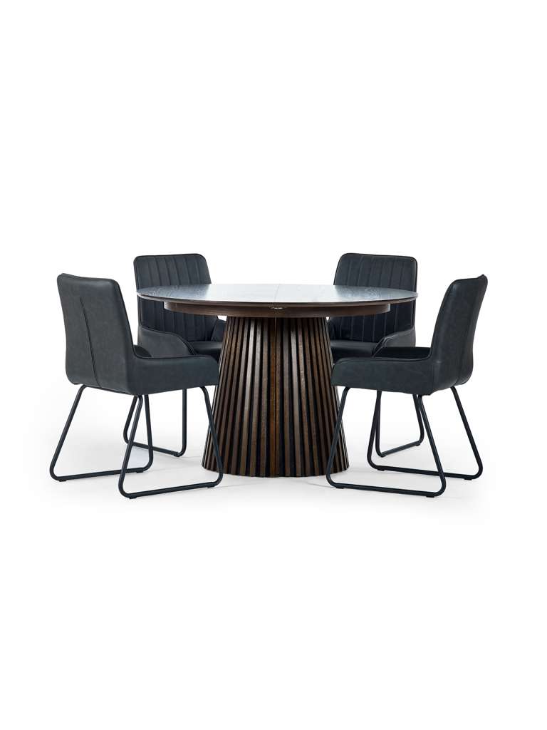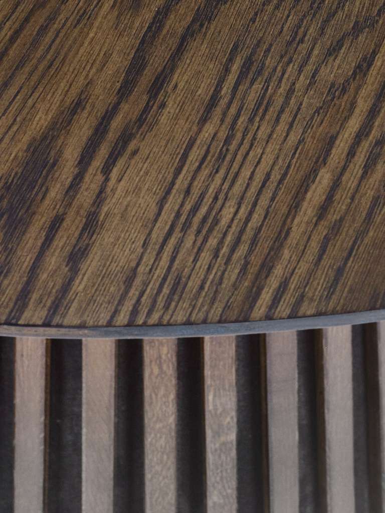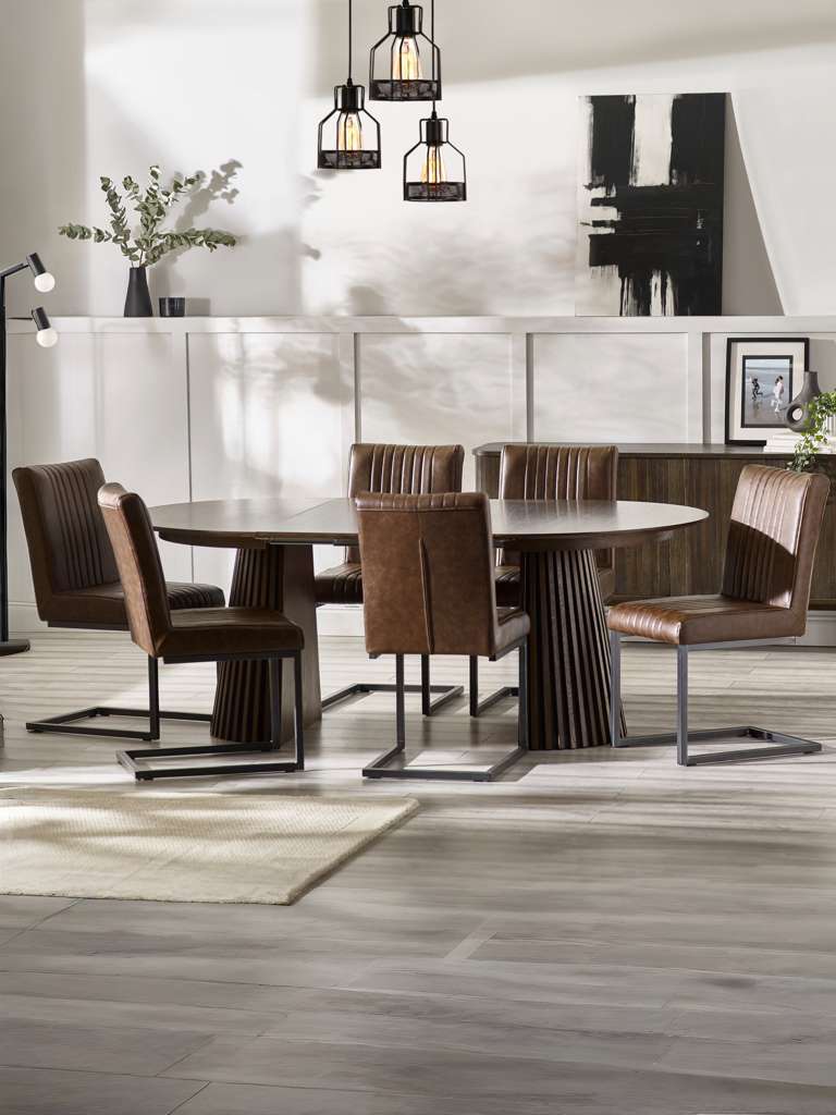 Discover the ultimate dining experience with the Arya Extending Dining Table â a masterpiece of modern design infused with Japandi elegance. Crafted from rich dark oak MDF veneer, it transforms effortlessly from a striking circular shape with a ribbed, coned base to an elongated oval with dual supports, combining sophistication and functionality. Its sleek, adaptable design serves as an elegant focal point, effortlessly adjusting to suit both intimate dinners and larger gatherings. Adding a refined touch to any dining space with its blend of minimalist beauty and luxurious detail.