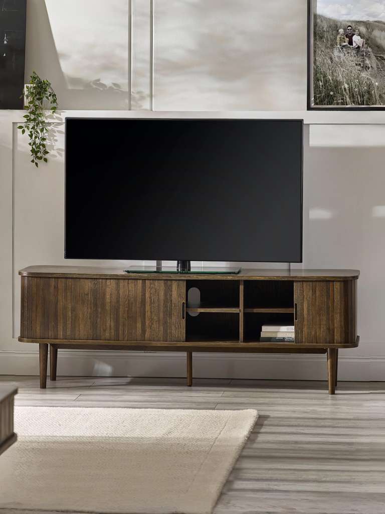Make a statement in your living space with the Arya Media Unit, combining both style and functionality. Crafted in a rich dark oak effect with striking slatted sliding tambour doors. Inside, you'll find ample storage with six shelves and additional smaller side shelvesâideal for organizing CDs, DVDs, game boxes, and displaying decorative pieces. The two cut-out handles and four sleek Nordic tapered legs add a modern touch, elevating the look of any room. Whether you're tidying up or showcasing your favorite items, this versatile piece offers the perfect blend of design and practicality. Simple assembly required to have it functional and ready quickly.