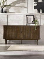 Discover the epitome of luxury and functionality with the Arya Sideboard, a statement piece that combines timeless elegance with modern design. Finished in a rich dark oak effect, its slatted sliding tambour doors reveal two push-out drawers and four central shelves, with additional storage in four smaller side shelves. Featuring sleek cut-out handles and four Nordic tapered legs, adding a touch of mid-century charm to any space. Perfect for elevating your living or dining room. Minimal assembly required for quick and effortless setup.