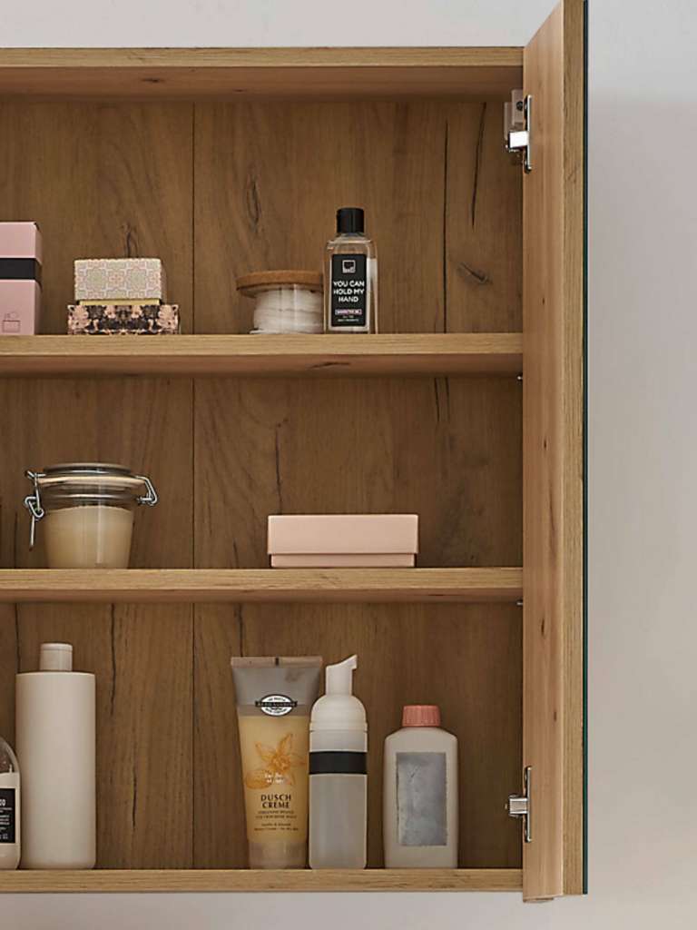 Transform your bathroom with the Austin Mirrored Cabinet, a perfect blend of sophistication and functionality, finished in natural wood tones. This exquisite piece serves as the ideal mirror for your daily routines while cleverly concealing ample storage to help you maintain a sleek and organised space. Featuring a double-shelf design, it provides convenient storage for your essentials, ensuring everything you need is close at hand yet beautifully out of sight. The polished reflective surface brightens your bathroom and creates an illusion of greater space, transforming even the cosiest of areas into an airy oasis.