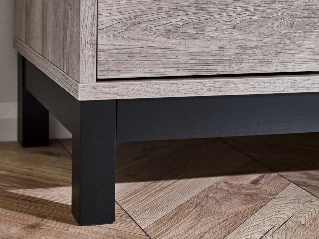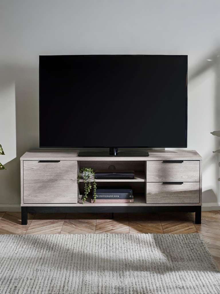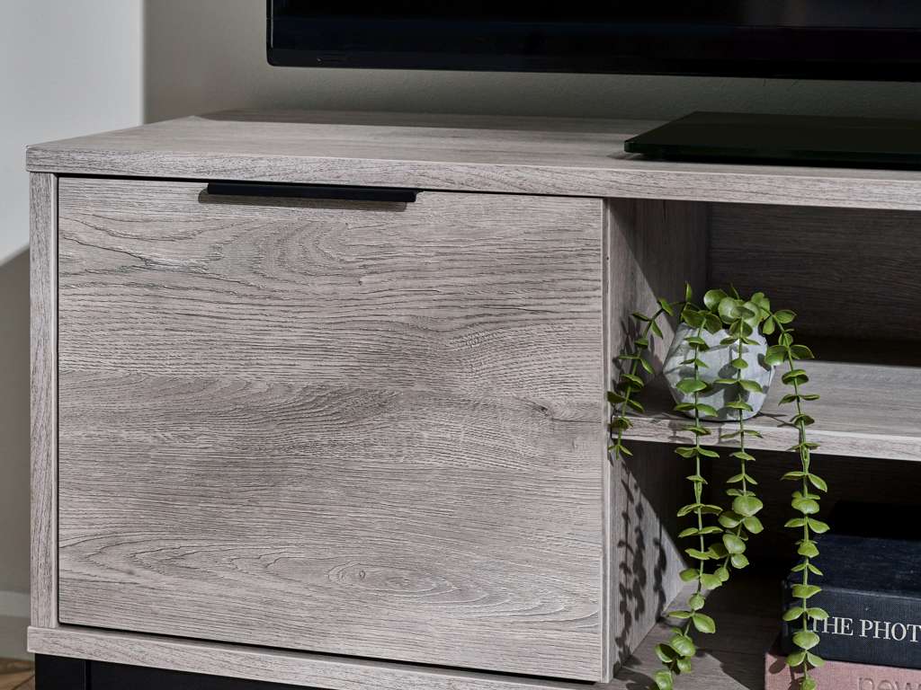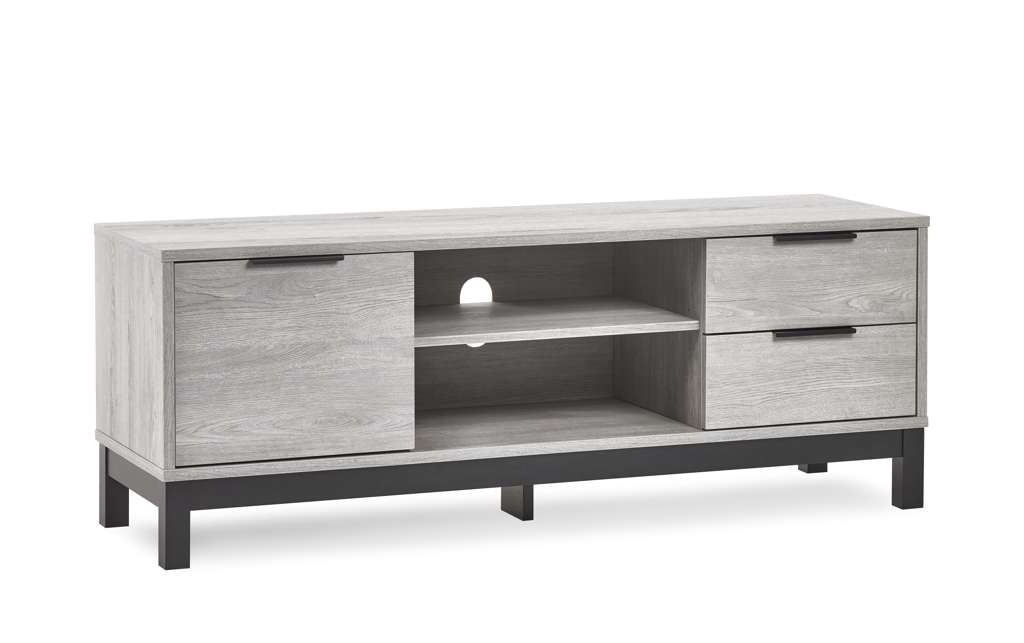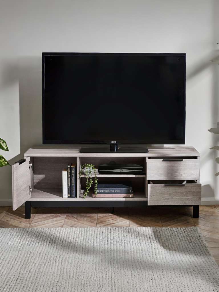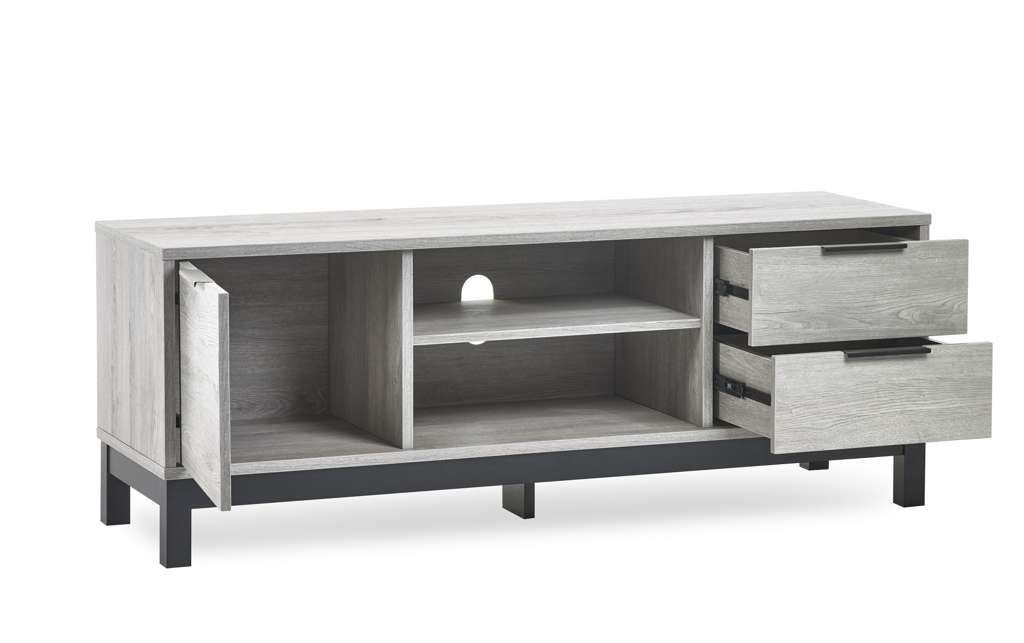 Discover the seamless blend of style and simplicity with the Bali TV Unit in Grey Oak. Crafted using revolutionary click furniture technology, this unit seamlessly combines high-quality craftsmanship with effortless assembly. The modern grey oak finish, complemented by contrasting black legs and handles, brings a classic industrial aesthetic to your living room. Featuring a spacious cupboard and two pull-out drawers for organised storage, along with center shelving for additional storage and display options.
