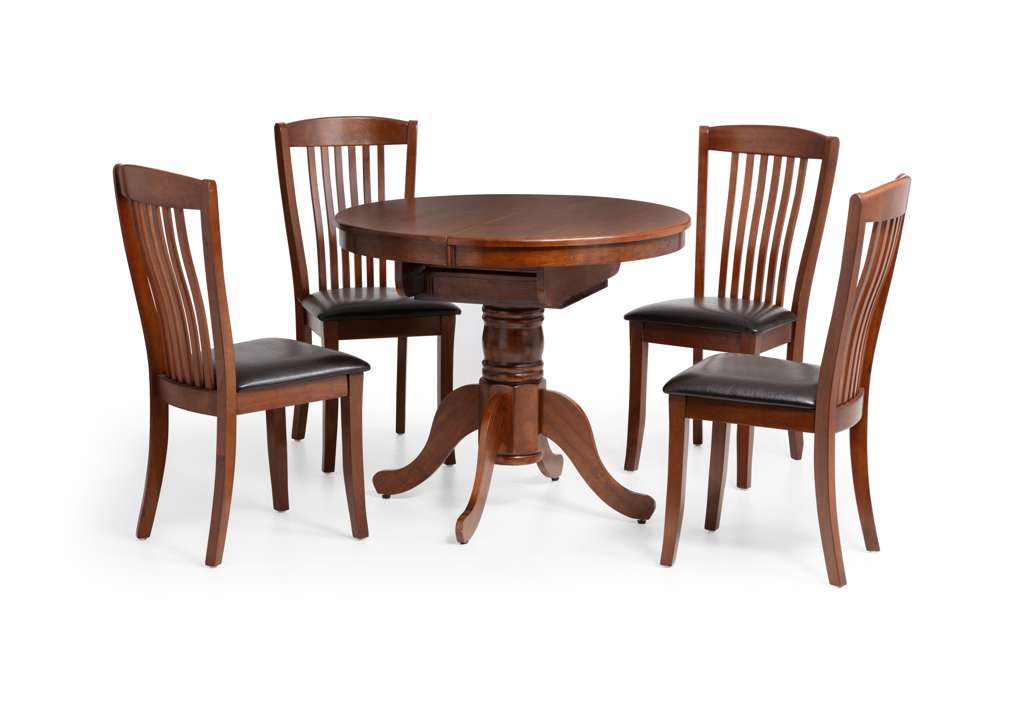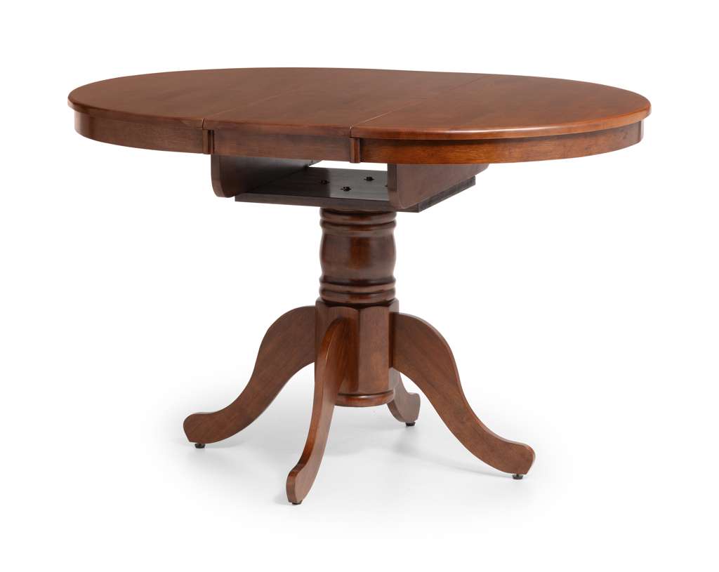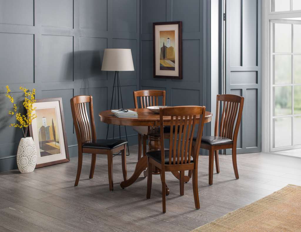 This Canterbury table brings a touch of elegance to any room, with its stylish pedestal base. Finished in a mahogany colour, this Canterbury table offers space saving practicality, extending to an oval table with can fit six people with an easy-to-use butterfly mechanism. Constructed from Solid Malaysian Hardwood, this traditional design will create a statement piece in your dining area.