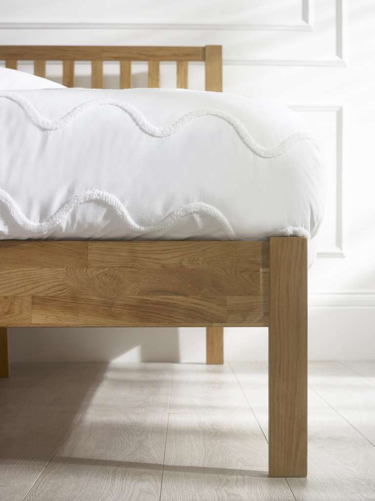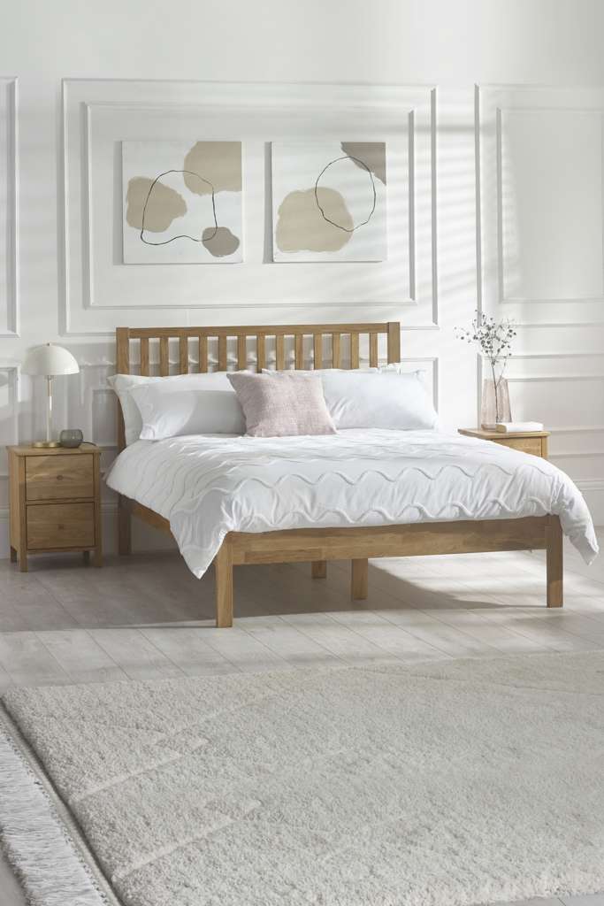 Elevate your bedroom with the Coxmoor 150cm Bed in oak, seamlessly blending comfort and style. Crafted from solid oak with a warm finish, this bed features a stunning paneled oak headboard that adds an element of elegance and texture to your space. Its clean, simple lines offer versatility, allowing it to harmonize beautifully with both modern and traditional decor. Designed for durability and long-lasting comfort, assembly is quick and straightforward, so you can enjoy your new bed with ease.