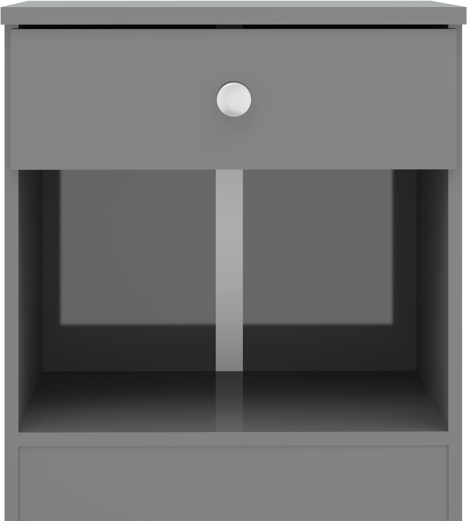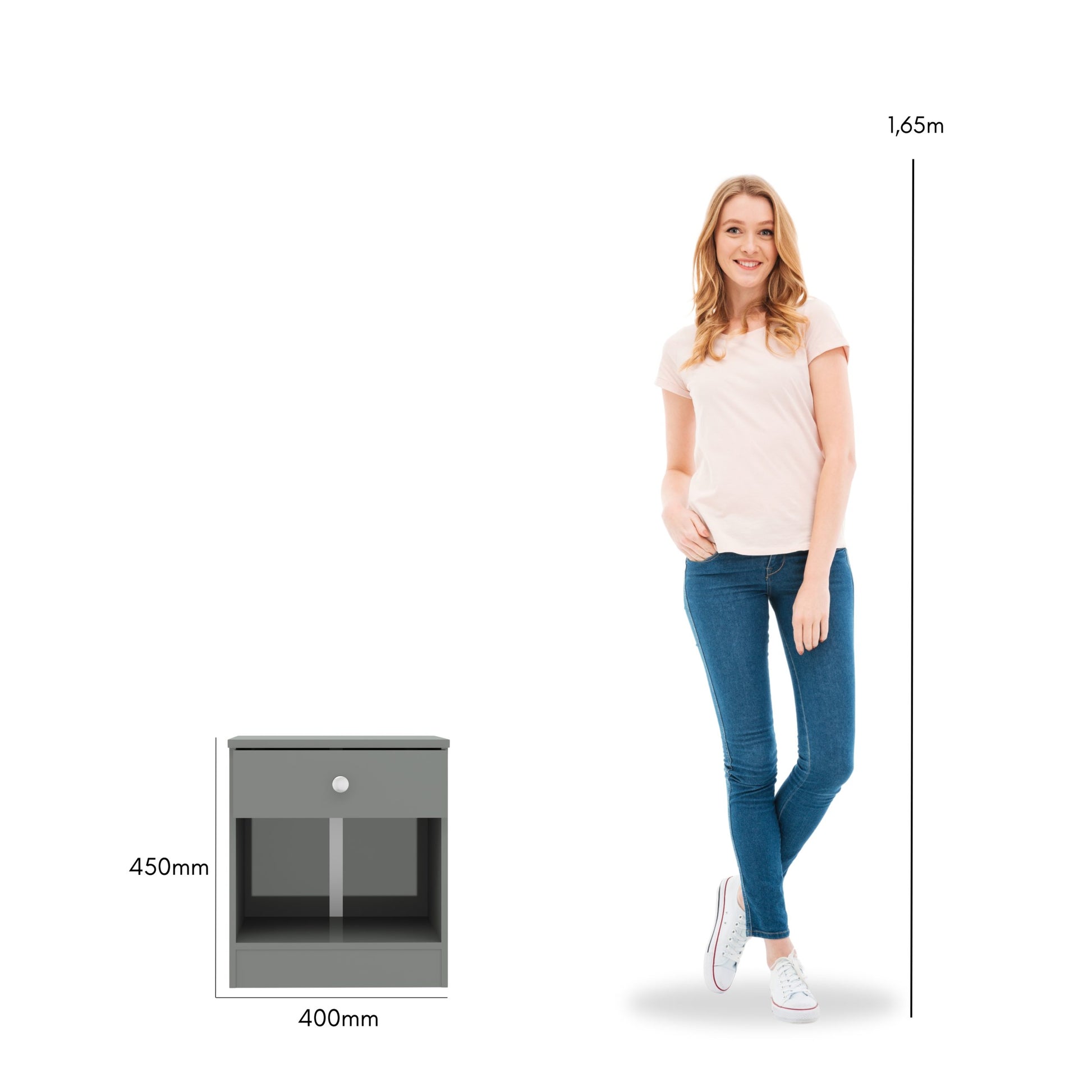 The Denver 1 Drawer Bedside finished in Grey Gloss adds a homely touch with a modern edge. Everyday-friendly and tidy, it offers plenty of room to keep everything organised you'll use from day one. Sturdy by design, it pairs simple lines with a quality feel that lasts.