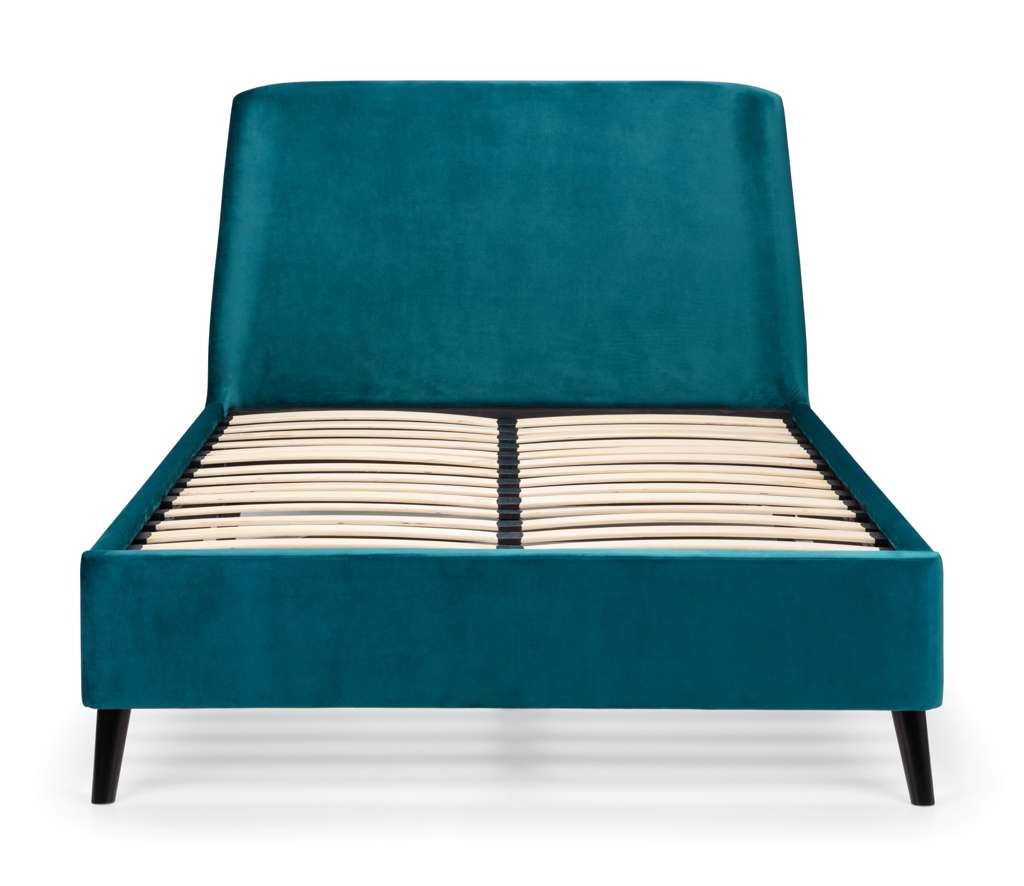 Featuring a gorgeous, curved headboard, the Frida bed exudes elegance and comfort. The black contrasting legs paired with the smooth velvet gives a modern look â and is likely to be the statement piece in any bedroom. It is also available in an ottoman version, perfect for those with smaller bedroom areas as it provides that extra storage space. Available in two beautiful shades of teal and grey.