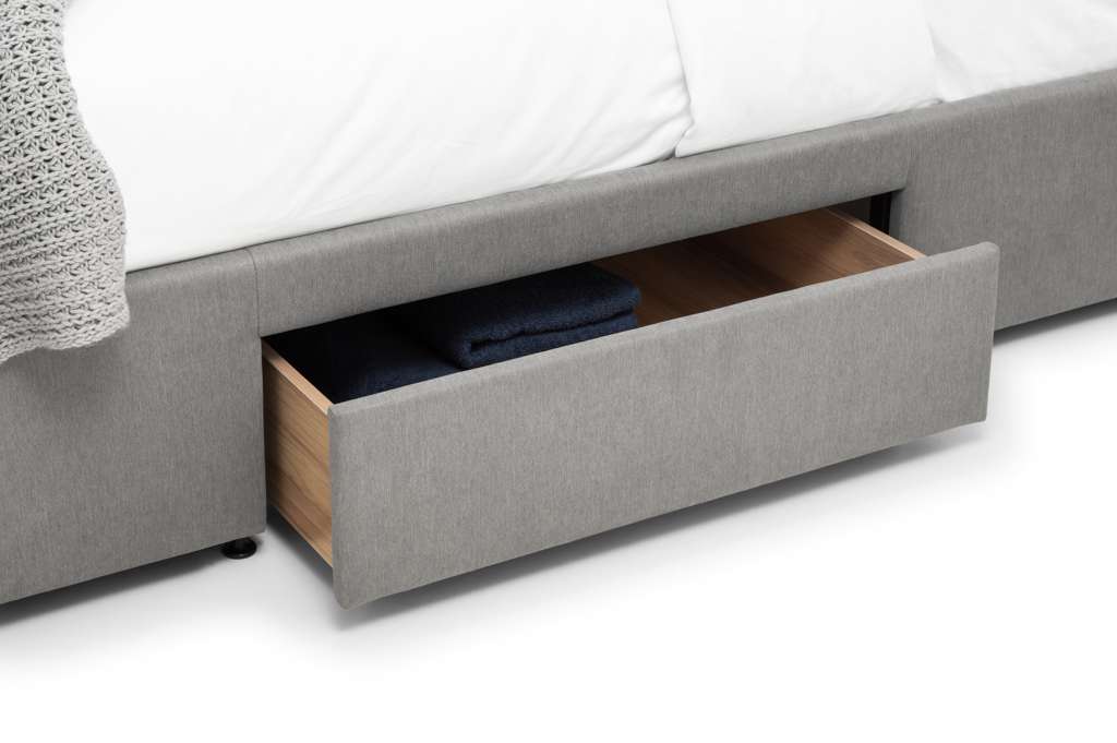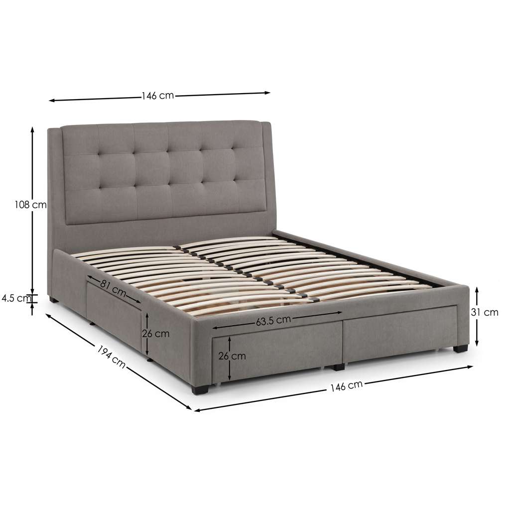 The Fullerton Bed is upholstered in a luxurious grey linen fabric with small black legs. This bed features a deep buttoned headboard, creating a contemporary, modern design suitable for a wide range of décor. Offering 4 spacious drawers, two at the end and one each side, this bed provides practicality with its storage features, allowing you to use the maximum space in your bedroom for other needs. Available in 135cm Double, 150cm King and 180cm Super King sizes.