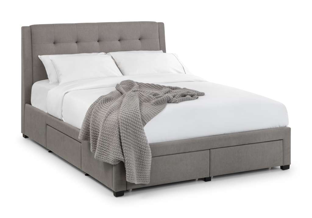 The Fullerton Bed is upholstered in a luxurious grey linen fabric with small black legs. This bed features a deep buttoned headboard, creating a contemporary, modern design suitable for a wide range of décor. Offering 4 spacious drawers, two at the end and one each side, this bed provides practicality with its storage features, allowing you to use the maximum space in your bedroom for other needs. Available in 135cm Double, 150cm King and 180cm Super King sizes.