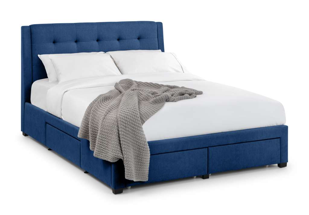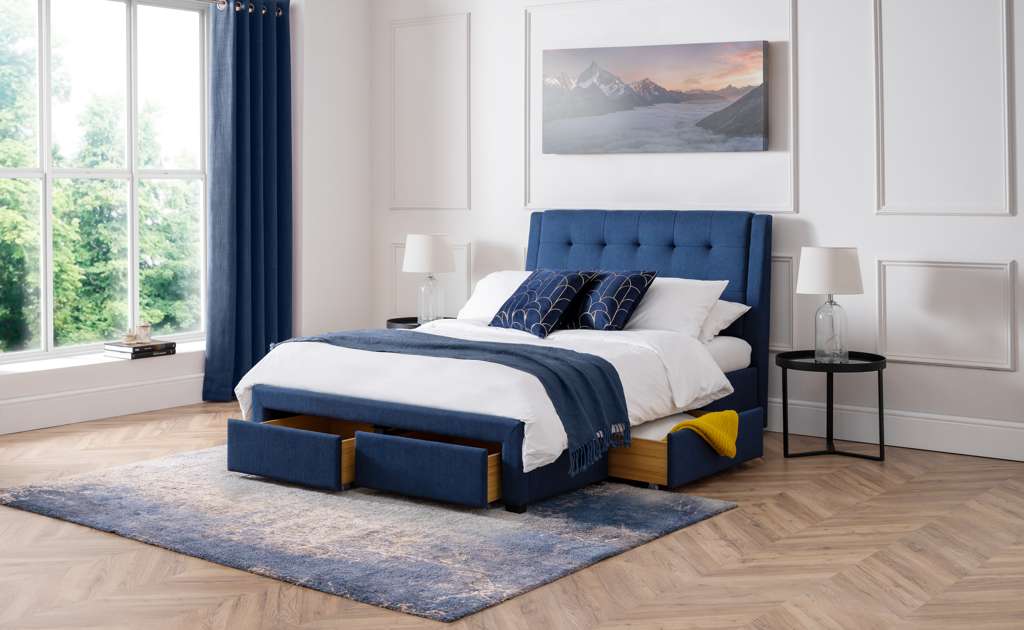 The Fullerton Bed is upholstered in a luxurious blue linen fabric with small black legs. This bed features a deep buttoned headboard, creating a contemporary, modern design suitable for a wide range of décor. Offering 4 spacious drawers, two at the end and one each side, this bed provides practicality with its storage features, allowing you to use the maximum space in your bedroom for other needs. Available in 135cm Double, 150cm King and 180cm Super King sizes.