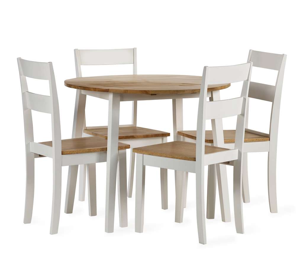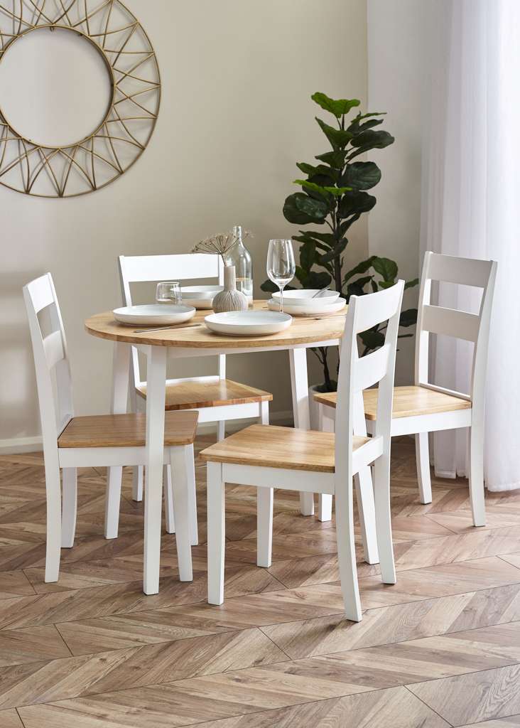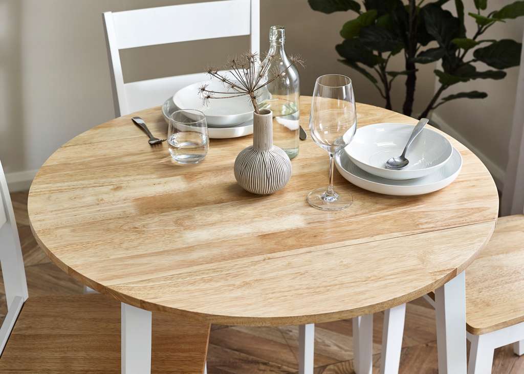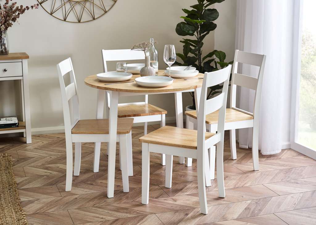 The Linwood Round Drop Leaf Table is a classic and elegant design, beautifully finished in a natural light oak effect table top and stunning white table legs. This Dropleaf table offers extendable leaves which provide ideal extra surface for any occasion and will fit perfectly into any room.