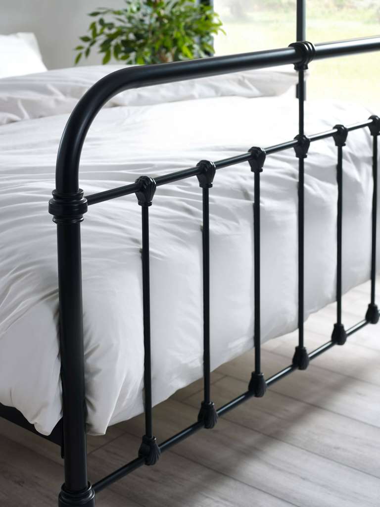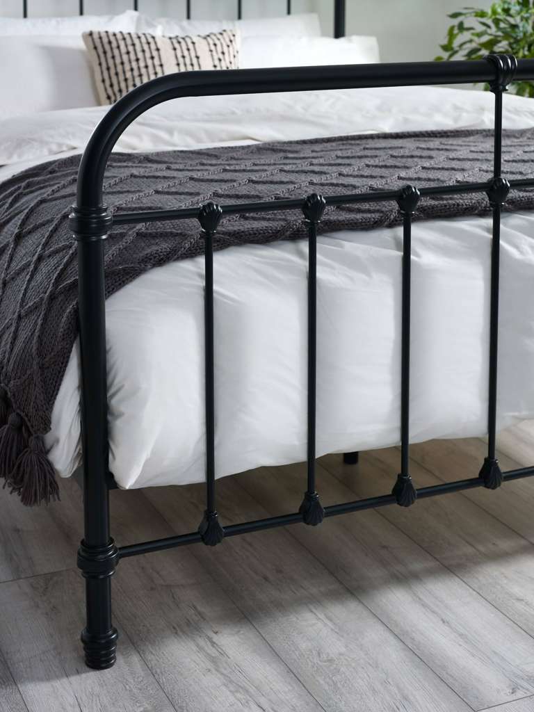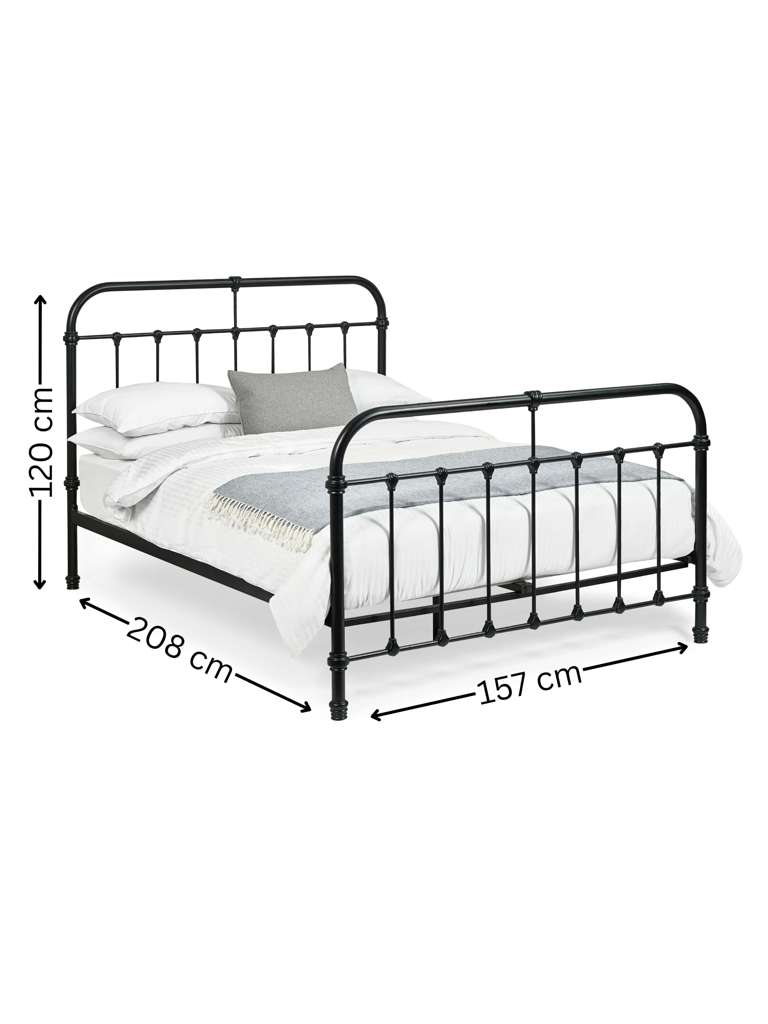 Add a touch of timeless elegance to your bedroom with this 150cm black satin metal bed. Crafted with a beautifully detailed metal frame, it effortlessly combines vintage charm with a sleek, modern design. The sturdy construction ensures lasting durability, while the smooth black satin finish enhances its classic appeal. Designed for both style and support, this bed is the perfect statement piece for those who appreciate the blend of traditional and contemporary design. Minimal assembly required. Mattress sold separately.
