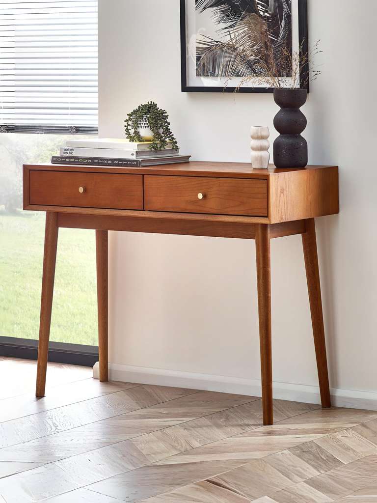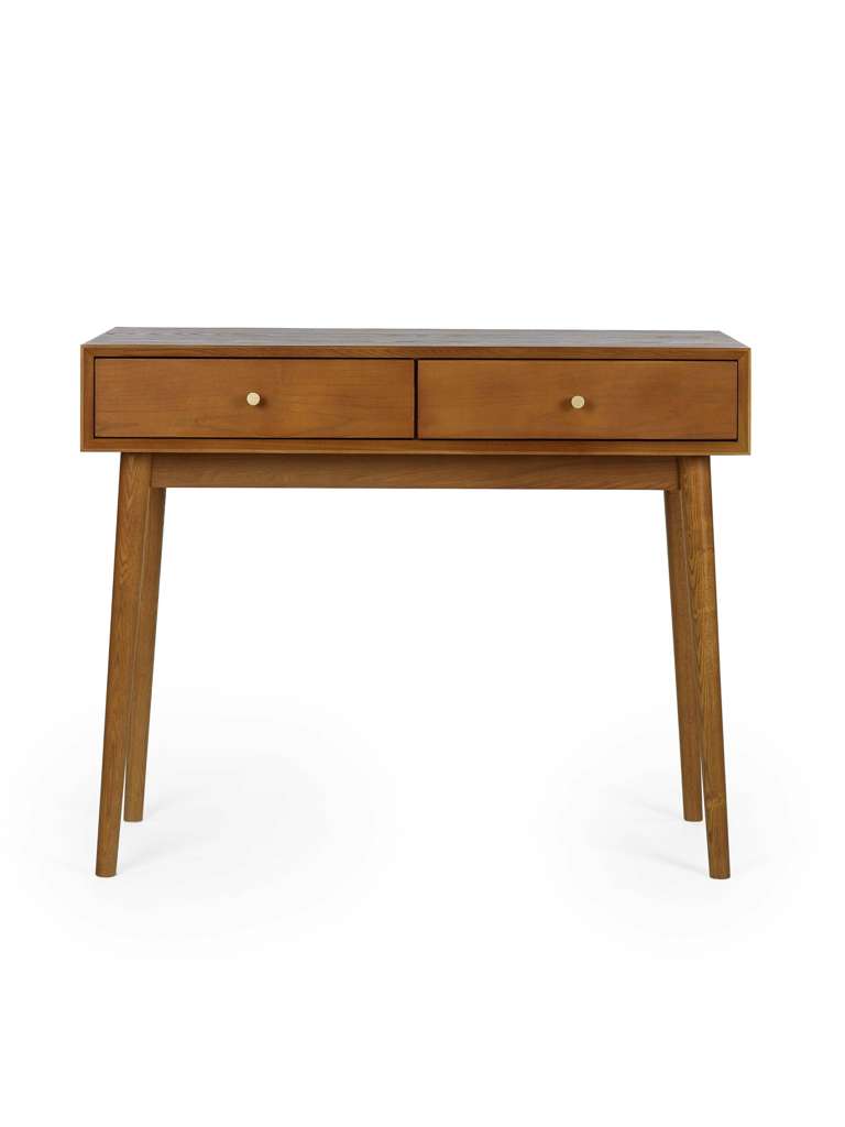 A retro-inspired style with a nostalgic feel, the Lowry Writing Desk will add a timeless look to any home office space. Constructed from an exquisite cherry ash wood veneer with beautifully tapered legs. Featuring 2 pull-out drawers complemented by golden framed knobs. Providing the perfect ample storage space for stationary essentials. Part of the Julian Bowen Lowry Dining and Occasional Collection.