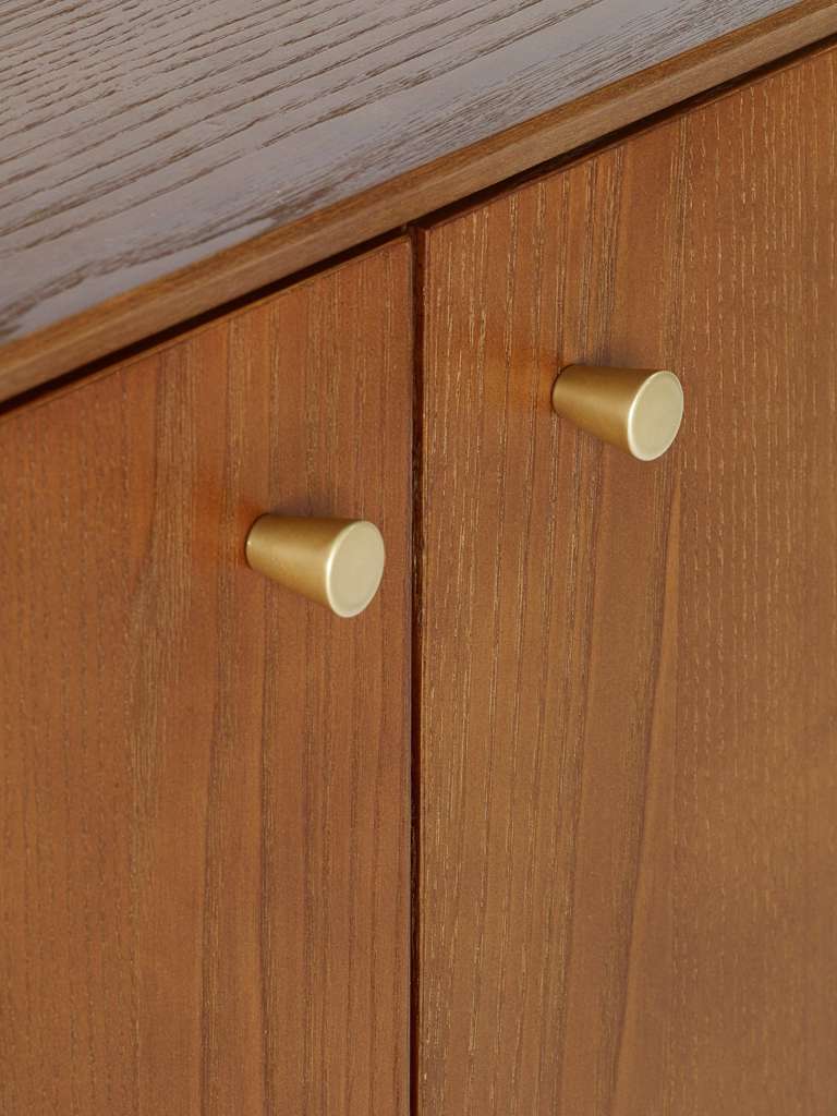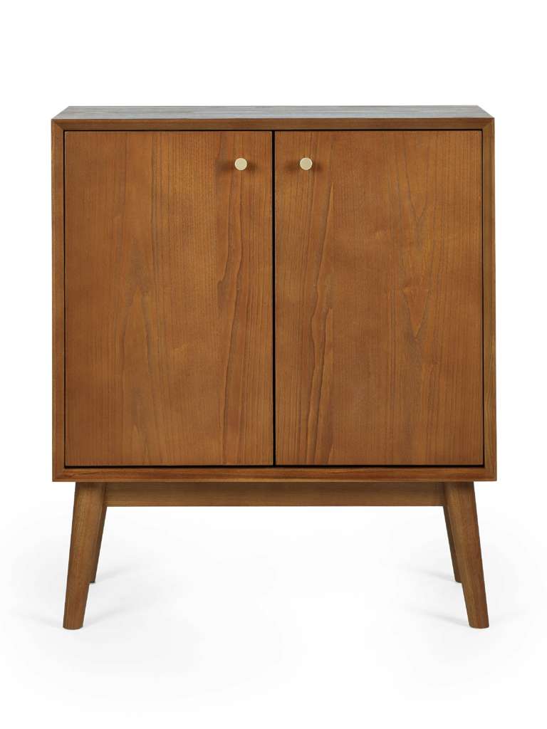 A gorgeous retro-inspired style, the Lowry Small Sideboard is constructed from an exquisite cherry ash wood veneer with beautifully tapered legs. Featuring soft-touch cupboard doors and interior shelving, ideal for storing necessities. Complemented by gold framed knobs, providing the perfect timeless staple to any occasional space.