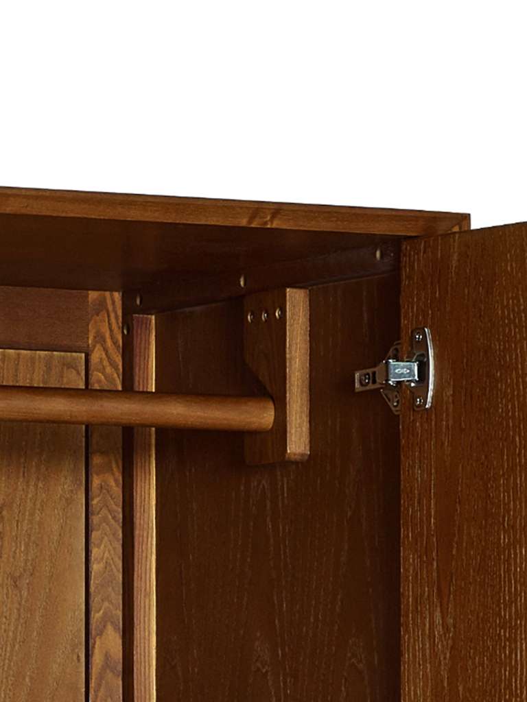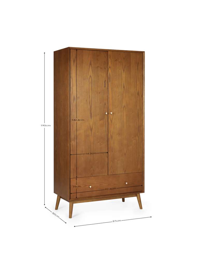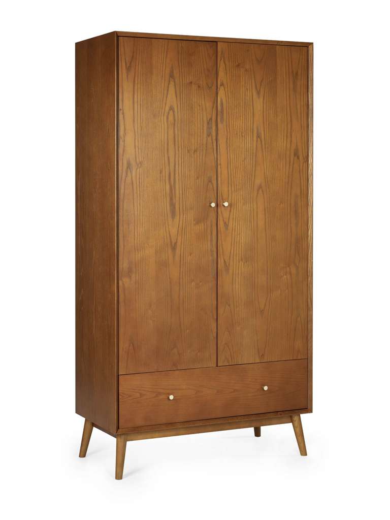 A gorgeous retro-inspired style, the Lowry Wardrobe is constructed from an exquisite cherry ash wood veneer with beautifully tapered legs. Featuring 2 soft-touch doors with 1 drawer offering plenty of hanging and storage space. Complemented by golden framed knobs, providing the perfect timeless staple to any bedroom space.