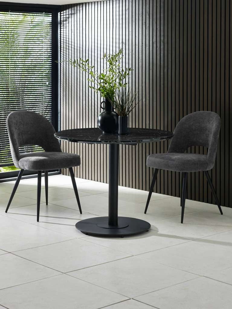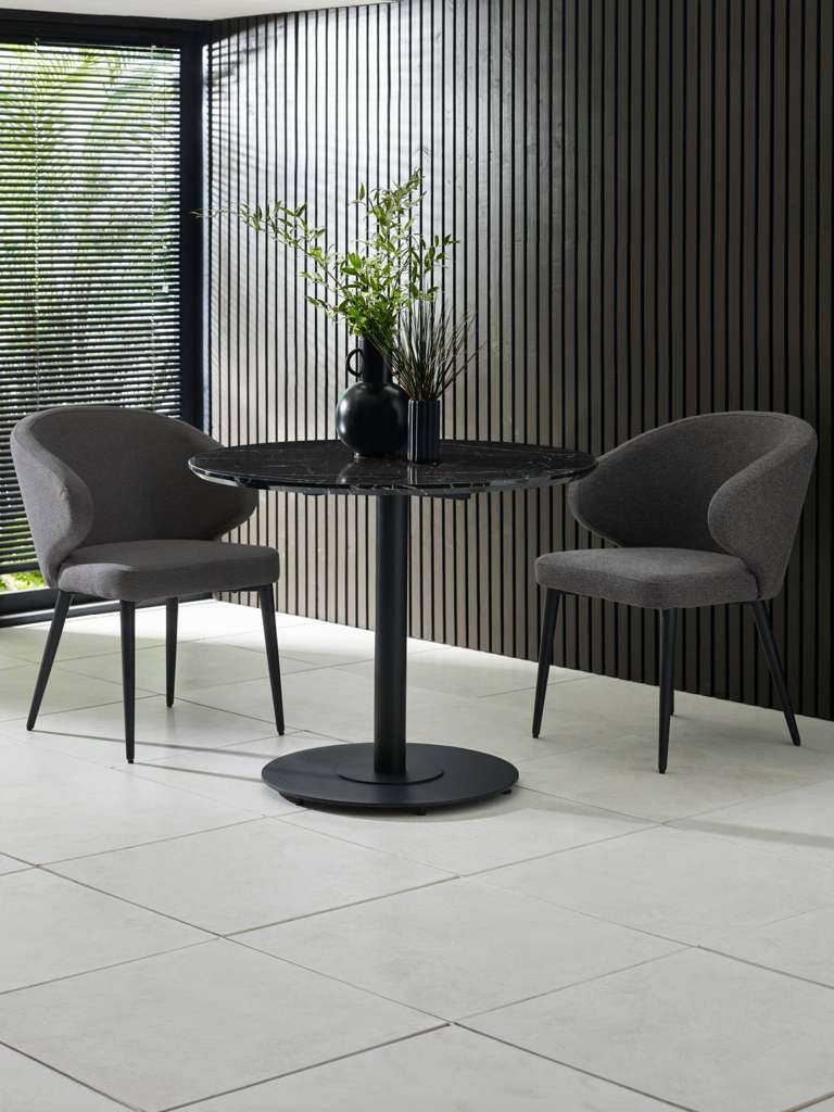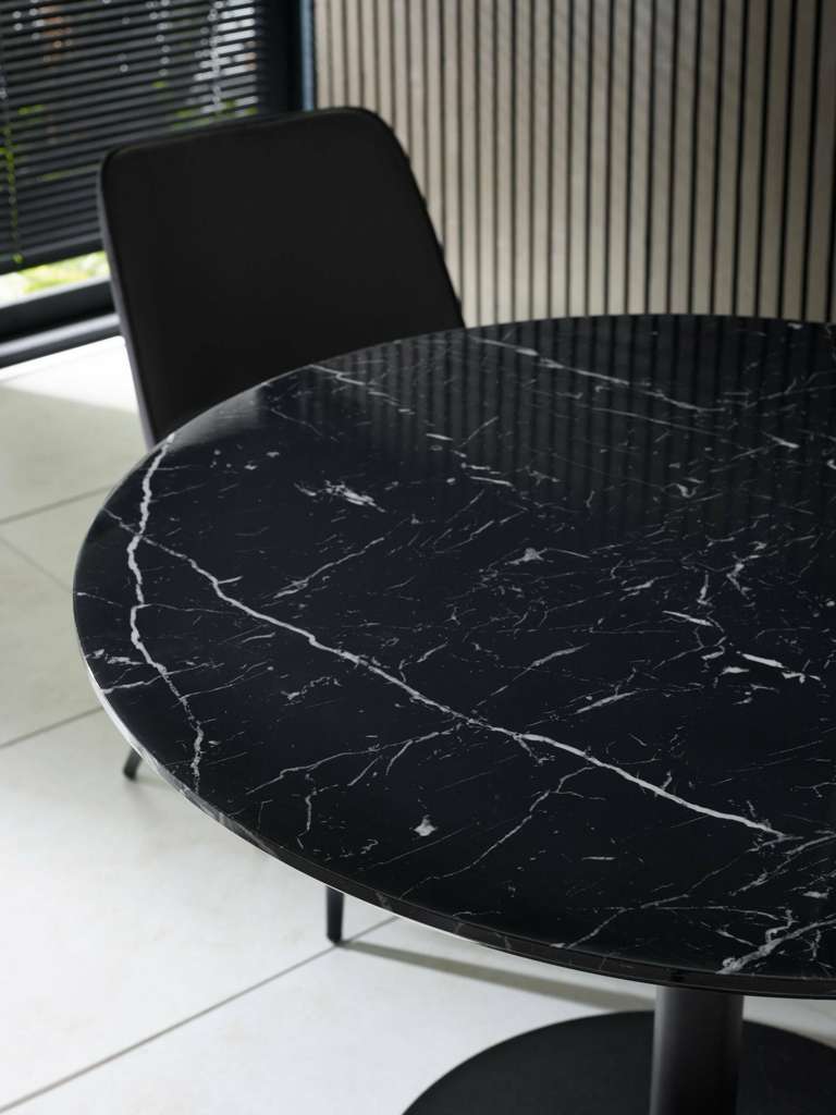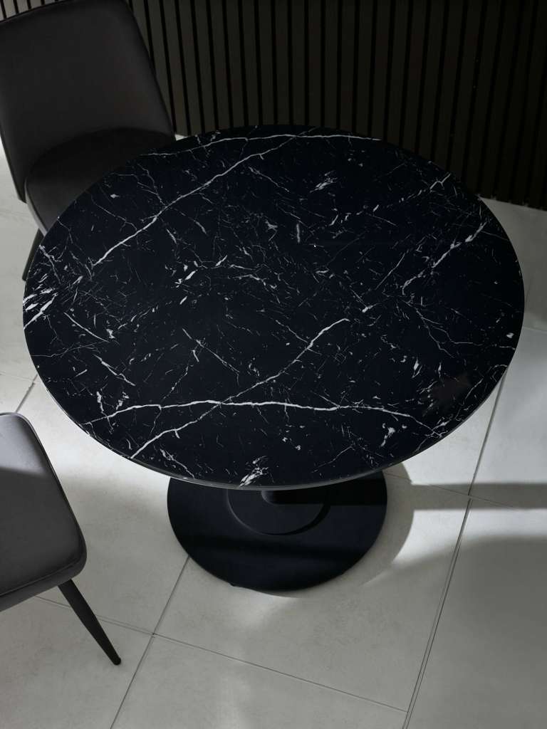 Bring sleek sophistication to your dining space with the Luca Black Marble Round Dining Table â 80 cm, designed for modern living and perfect for compact areas. The striking black marble-effect finish paired with a sleek black pedestal base creates a bold yet elegant centerpiece. Its refined design enhances any décor, offering a stylish and inviting setting for casual meals and intimate gatherings. With easy assembly and timeless appeal, this table seamlessly combines practicality with contemporary charm.