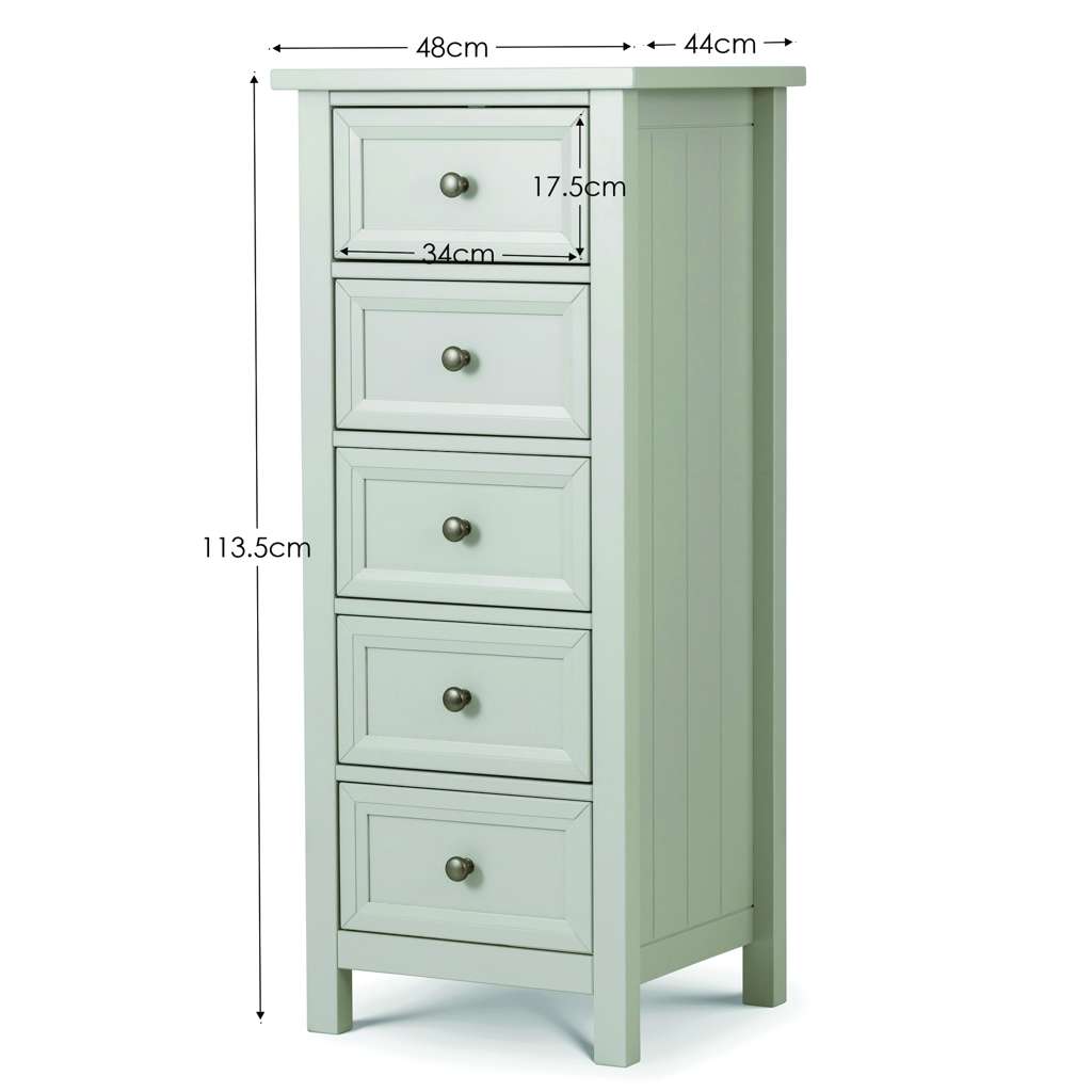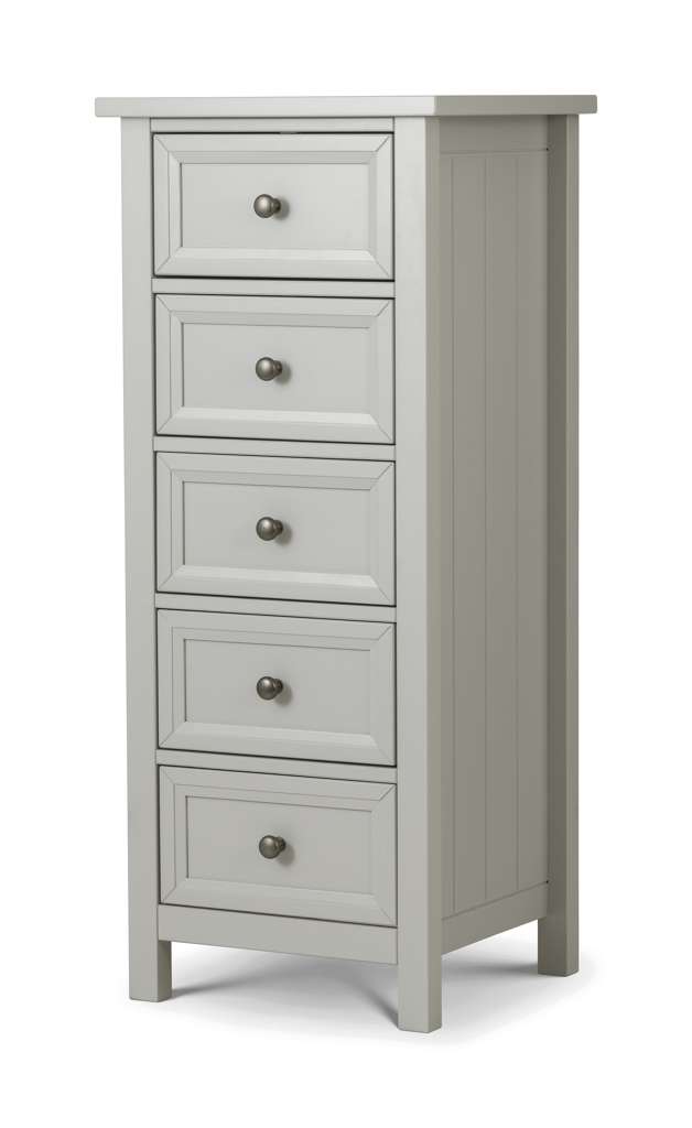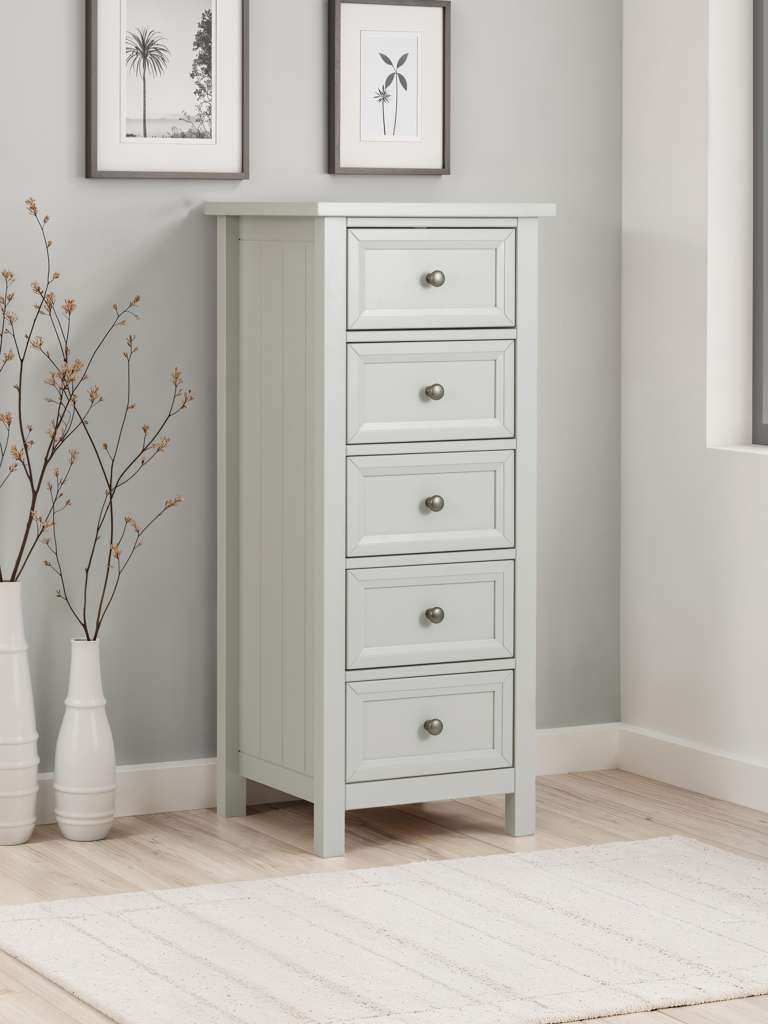 Maine is an elegant New England style range of bedroom furniture. The combination of exquisite dove grey lacquered finish with characteristic side panelling and detailed chamfered cabinetry makes for a soothing and refined aesthetic with timeless appeal, while delicate pewter handles add the perfect finishing touch. The Maine 5 drawer tall chest's compact footprint makes it a great storage solution for smaller bedrooms