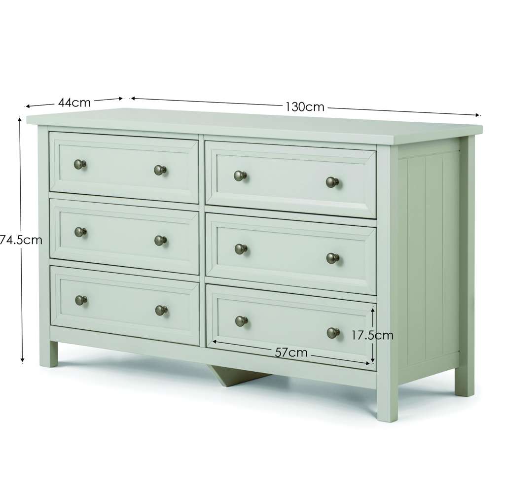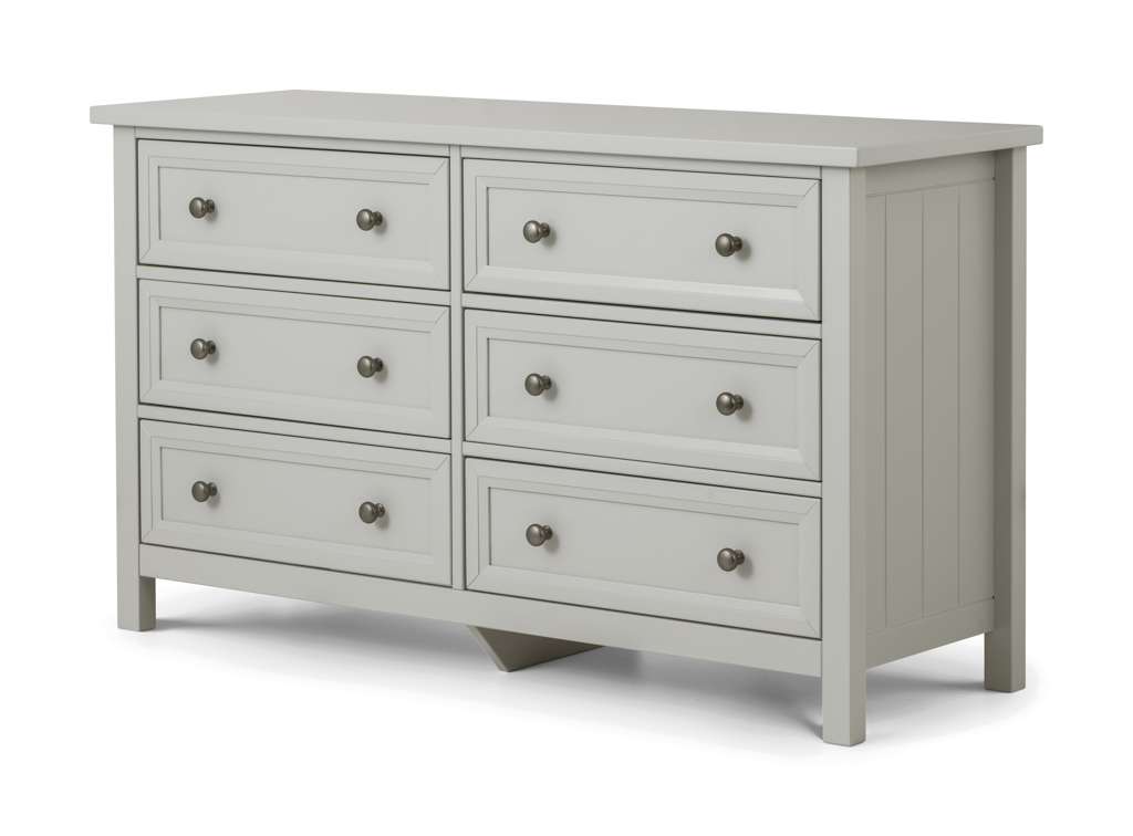 Maine is an elegant New England style range of bedroom furniture. The combination of exquisite dove grey lacquered finish with characteristic side panelling and detailed chamfered cabinetry makes for a soothing and refined aesthetic with timeless appeal, while delicate pewter handles add the perfect finishing touch. The Maine 6 drawer wide chest offers copious amounts of storage and can also be used as a dressing table