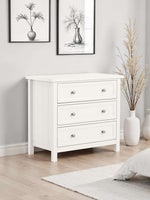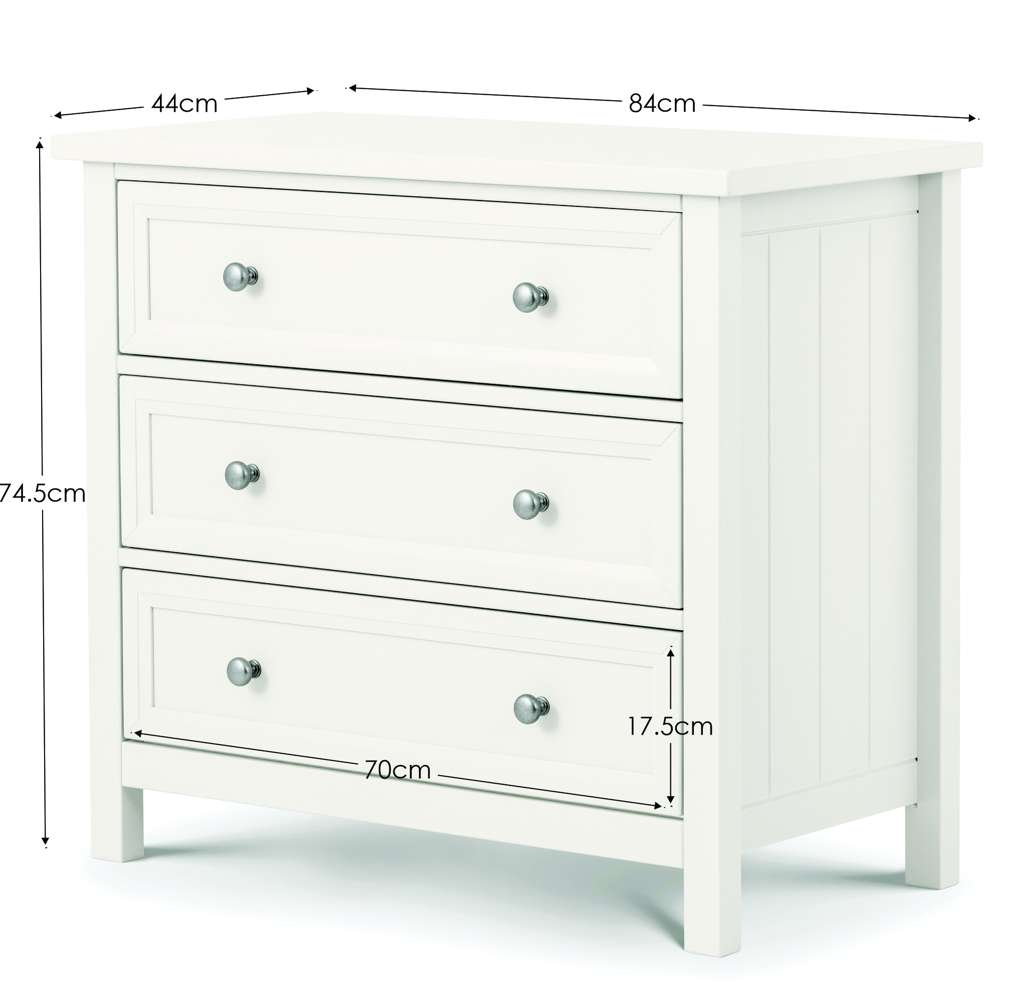 Maine is an elegant New England style range of bedroom furniture. The combination of exquisite surf white lacquered finish with characteristic side panelling and detailed chamfered cabinetry makes for a soothing and refined aesthetic with timeless appeal, while delicate pewter handles add the perfect finishing touch. The Maine 3 drawer chest offers three large storage drawers.