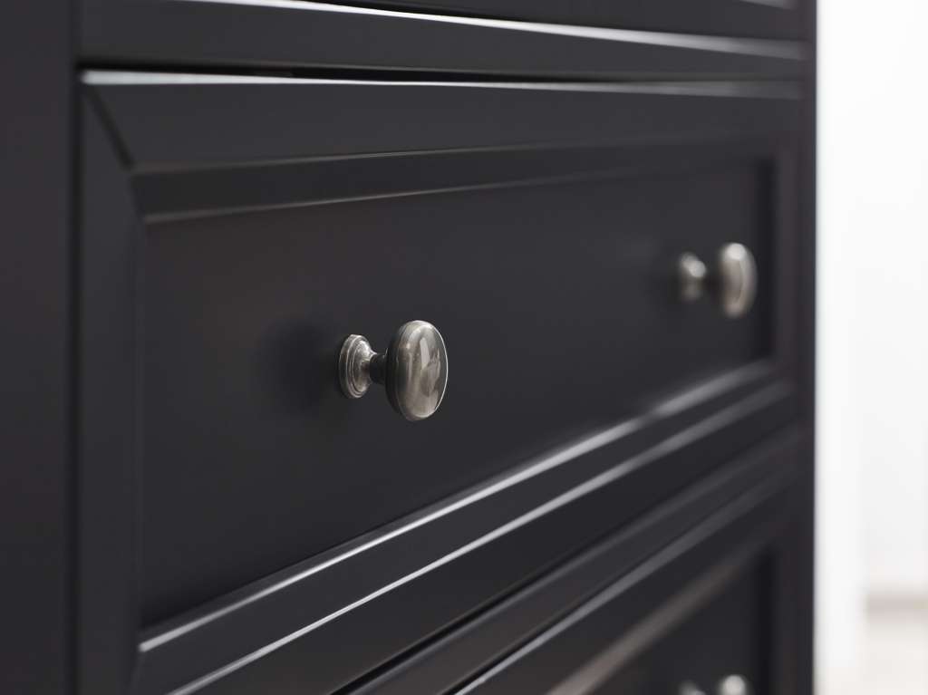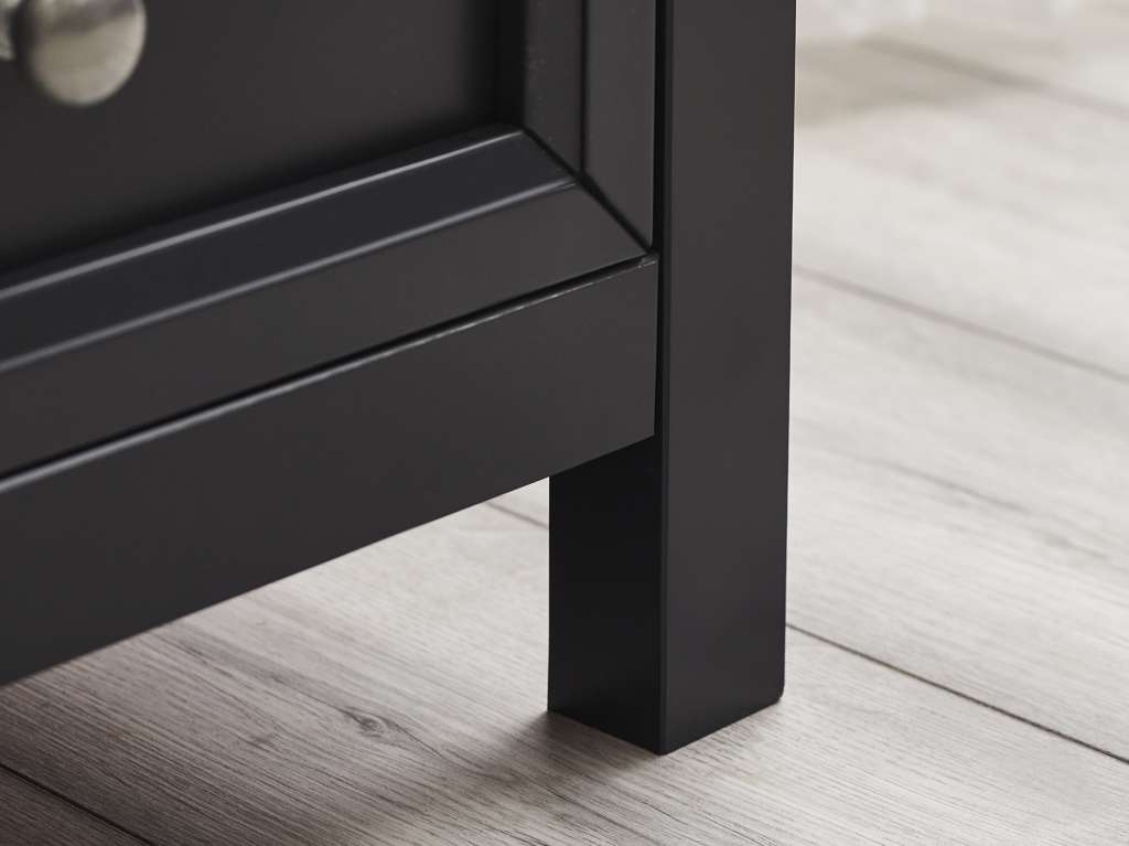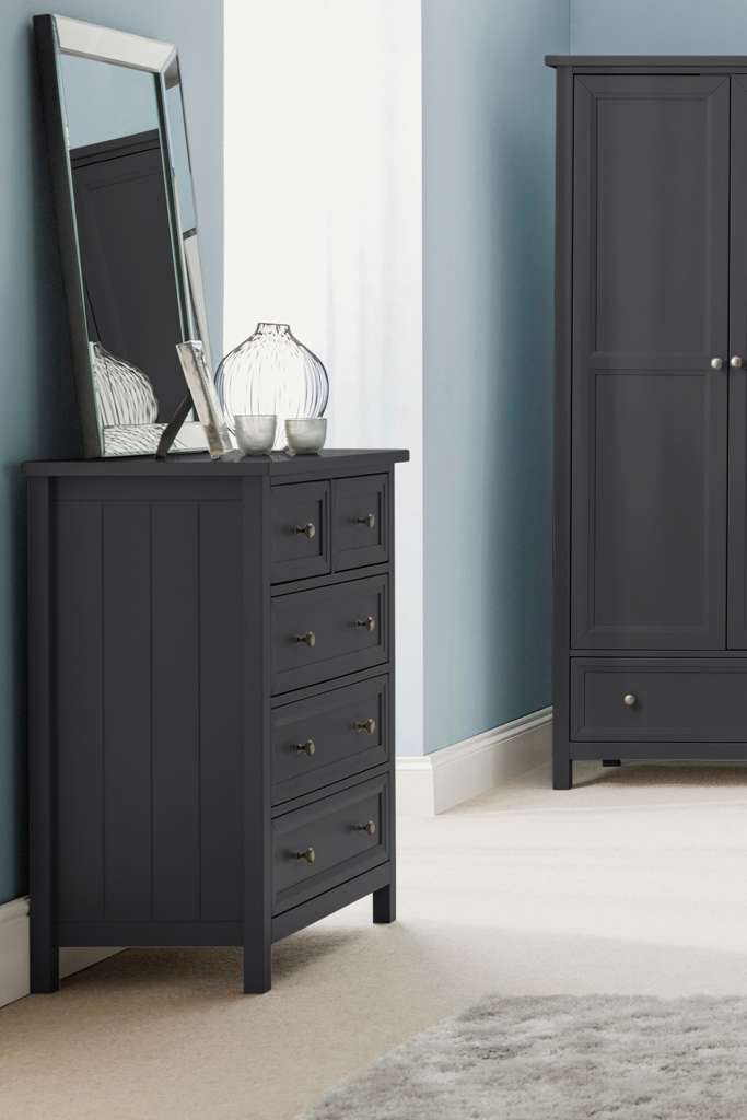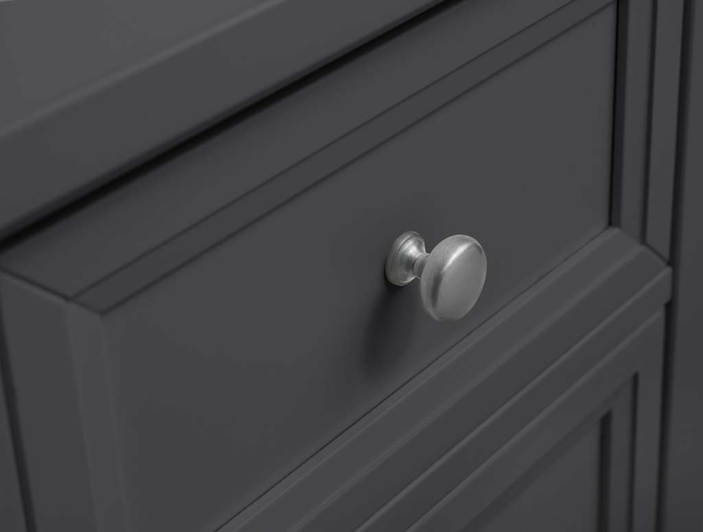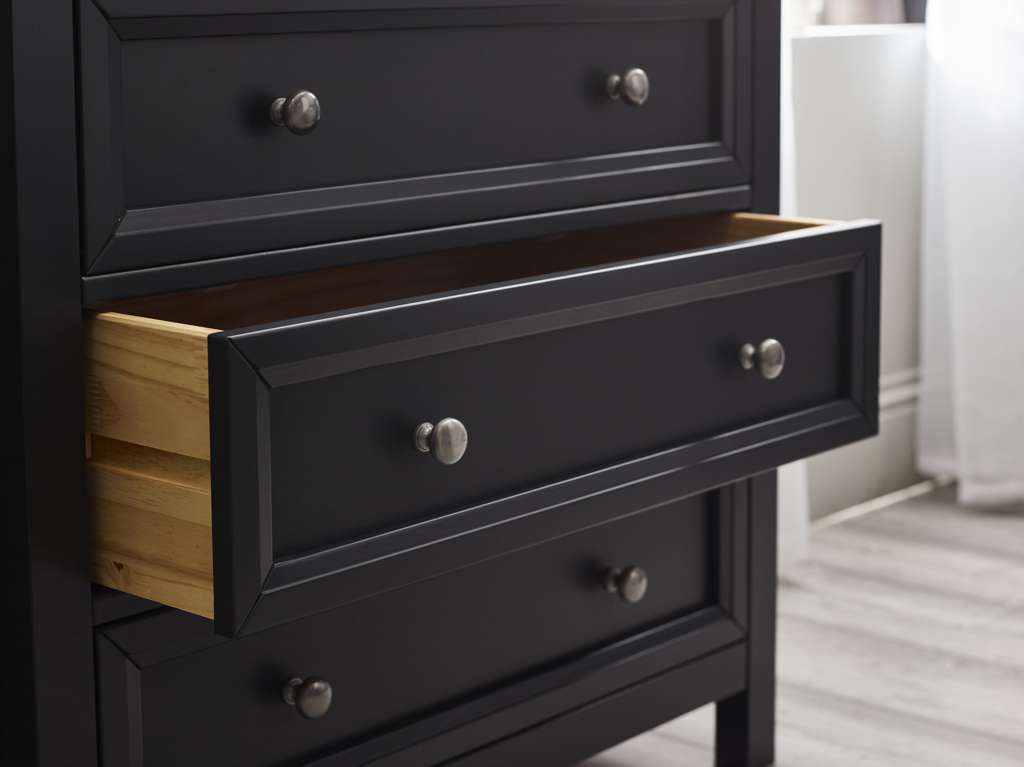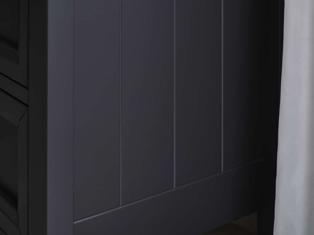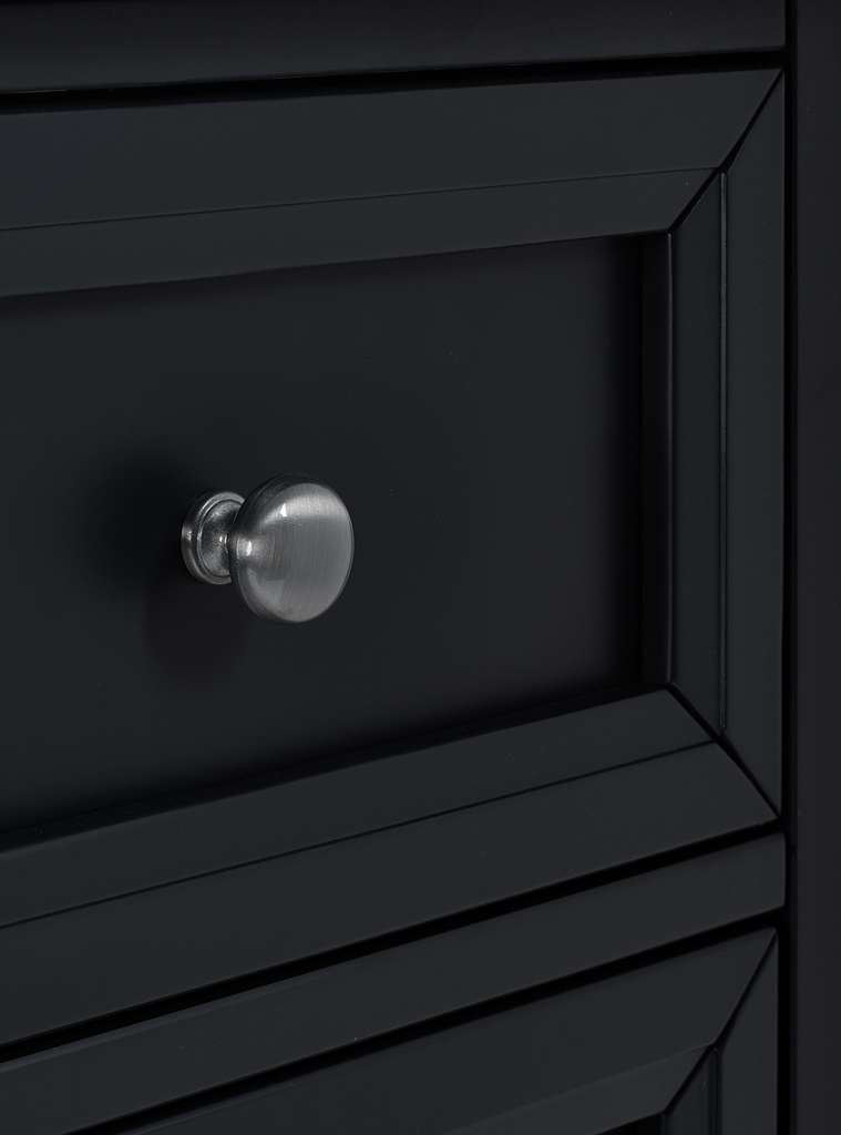 Maine is an elegant New England style range of bedroom furniture. The combination of exquisite anthracite lacquered finish with characteristic side panelling and detailed chamfered cabinetry makes for a soothing and refined aesthetic with timeless appeal, while delicate pewter handles add the perfect finishing touch. The Maine 3+2 drawer chest offers great storage with three large drawers topped with two smaller drawers.
