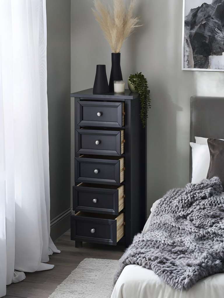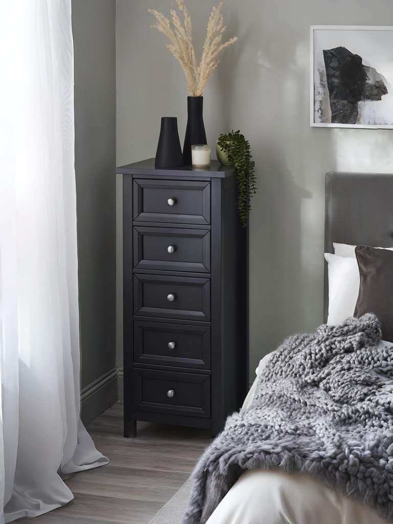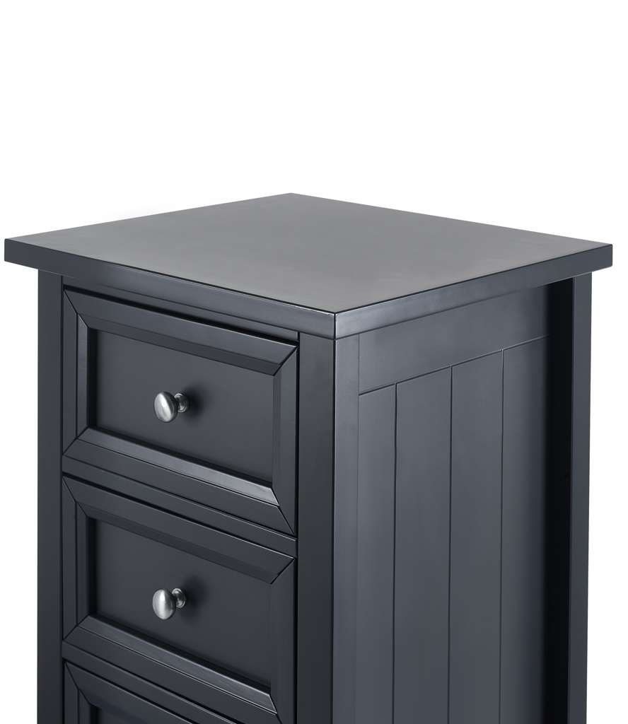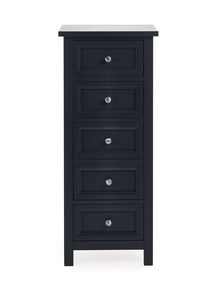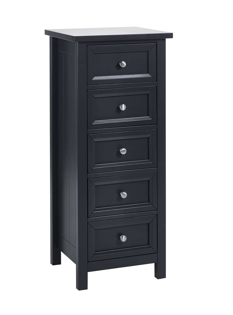 Maine is an elegant New England style range of bedroom furniture. The combination of exquisite anthracite lacquered finish with characteristic side panelling and detailed chamfered cabinetry makes for a soothing and refined aesthetic with timeless appeal, while delicate pewter handles add the perfect finishing touch. The Maine 5 drawer tall chest's compact footprint makes it a great storage solution for smaller bedrooms