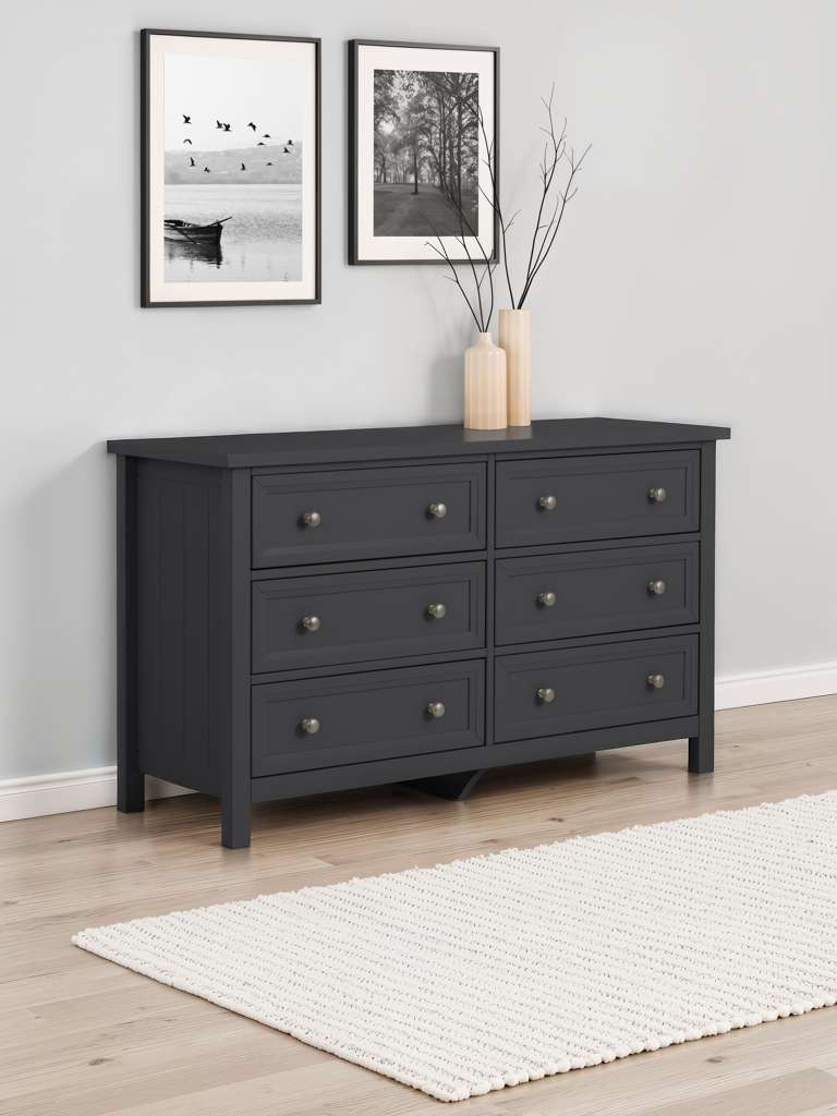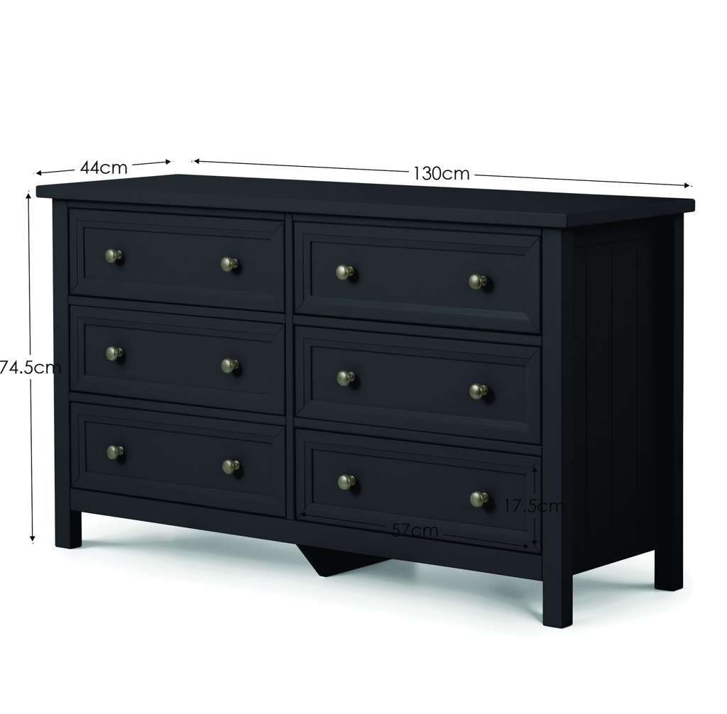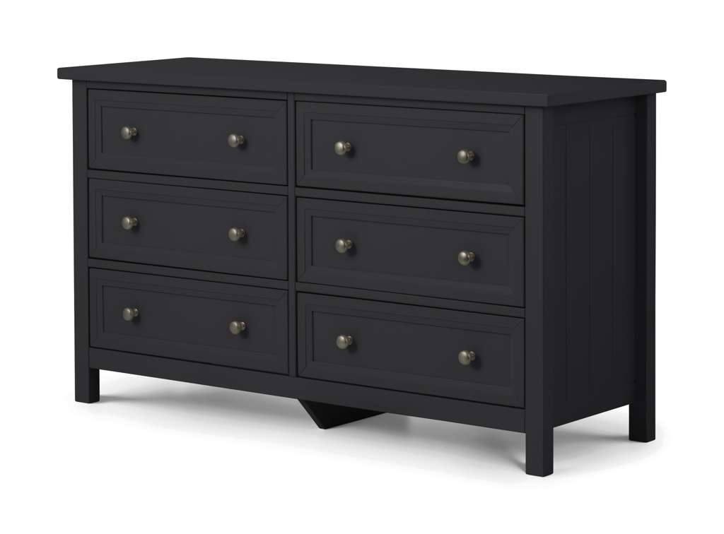 Maine is an elegant New England style range of bedroom furniture. The combination of exquisite anthracite lacquered finish with characteristic side panelling and detailed chamfered cabinetry makes for a soothing and refined aesthetic with timeless appeal, while delicate pewter handles add the perfect finishing touch. The Maine 6 drawer wide chest offers copious amounts of storage and can also be used as a dressing table
