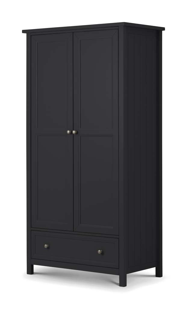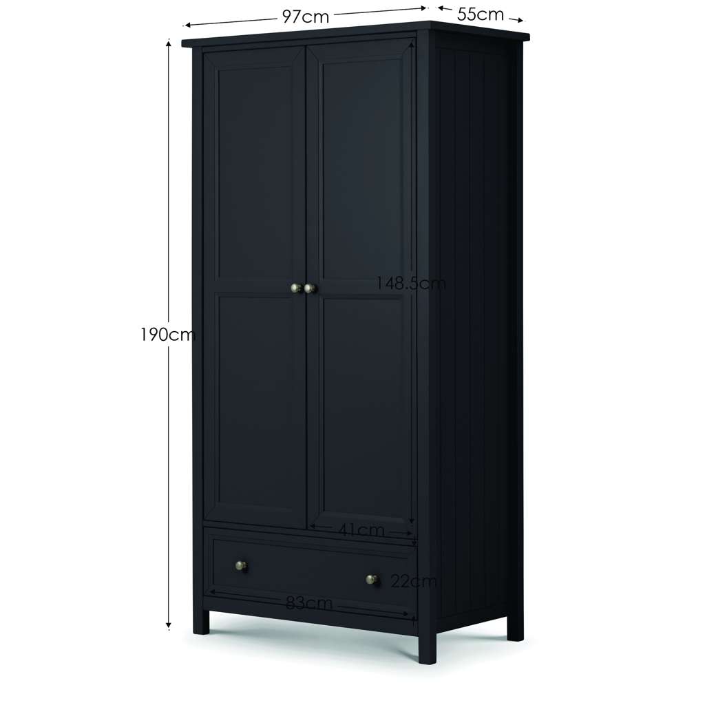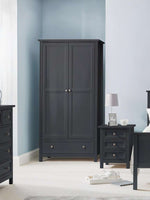 An elegant New England style wardrobe with two doors and one drawer. The combination of exquisite anthracite lacquered finish with characteristic side panelling and detailed chamfered cabinetry makes for a soothing and refined aesthetic with timeless appeal, while delicate pewter handles add the perfect finishing touch.
