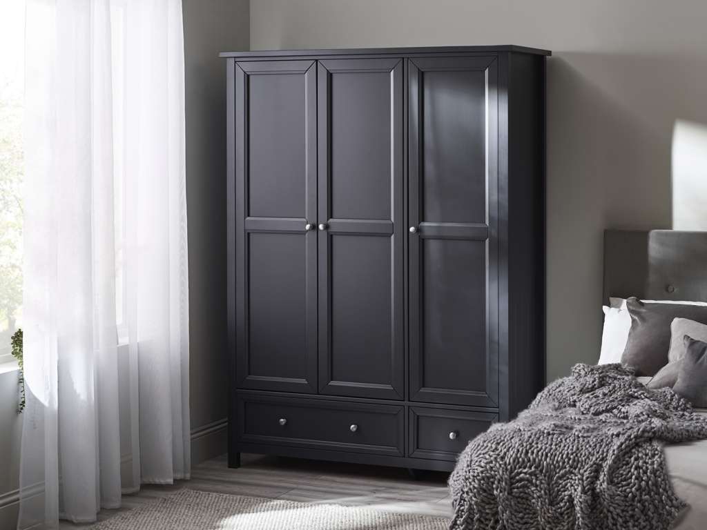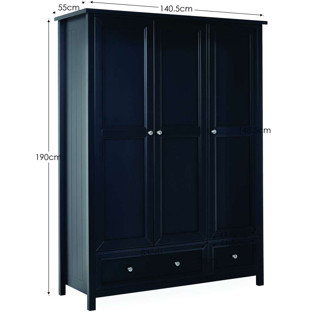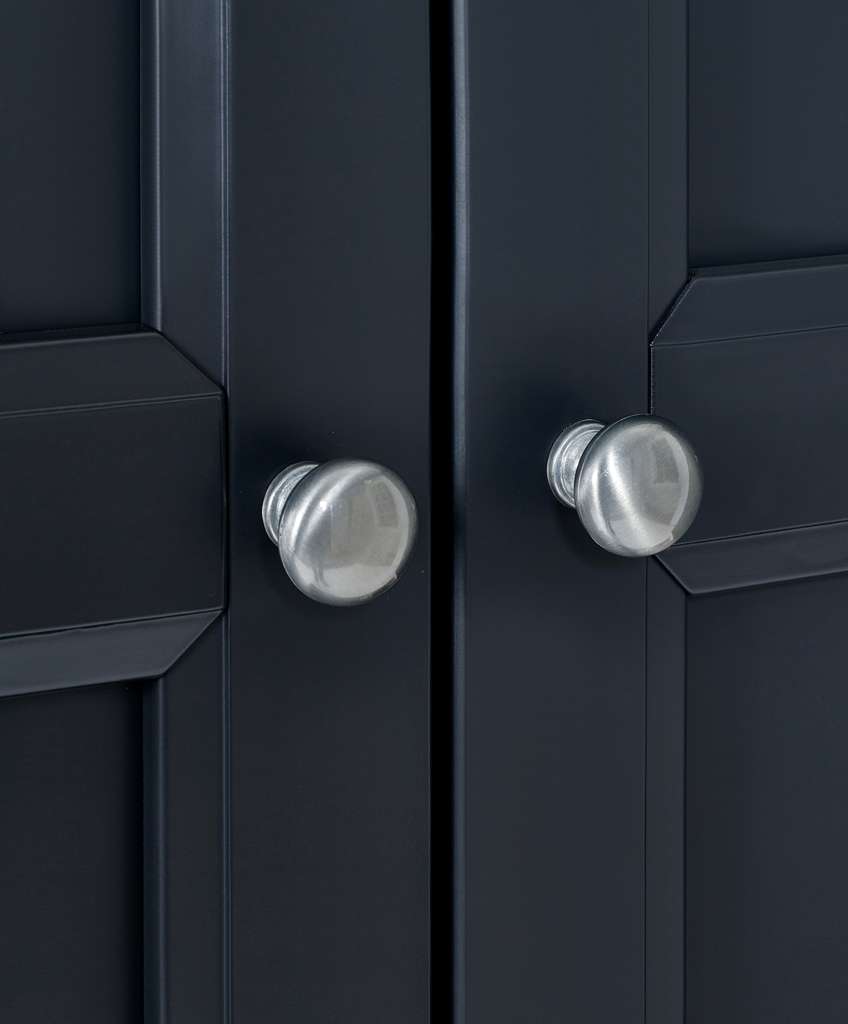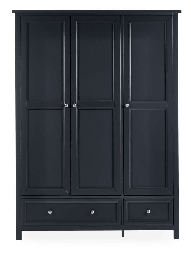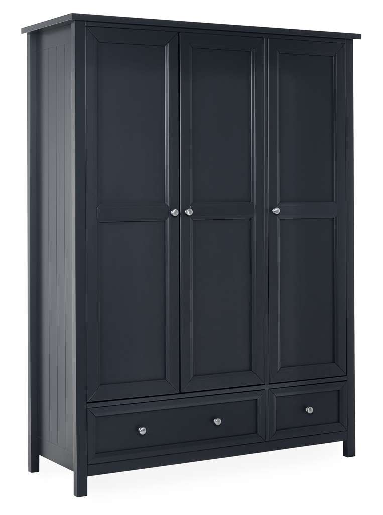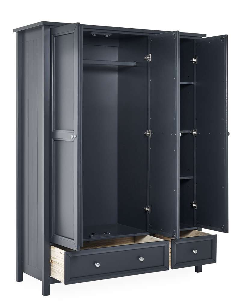 An elegant New England style wardrobe with three doors and two drawers. The combination of exquisite anthracite lacquered finish with characteristic side panelling and detailed chamfered cabinetry makes for a soothing and refined aesthetic with timeless appeal, while delicate pewter handles add the perfect finishing touch.
