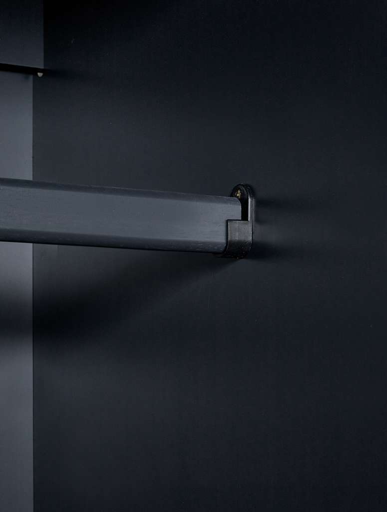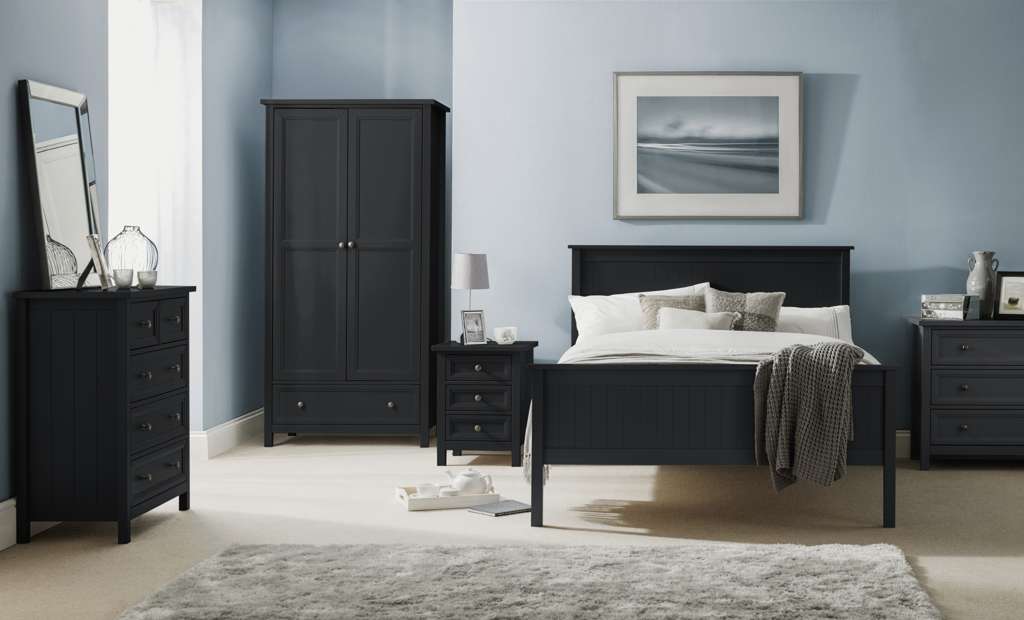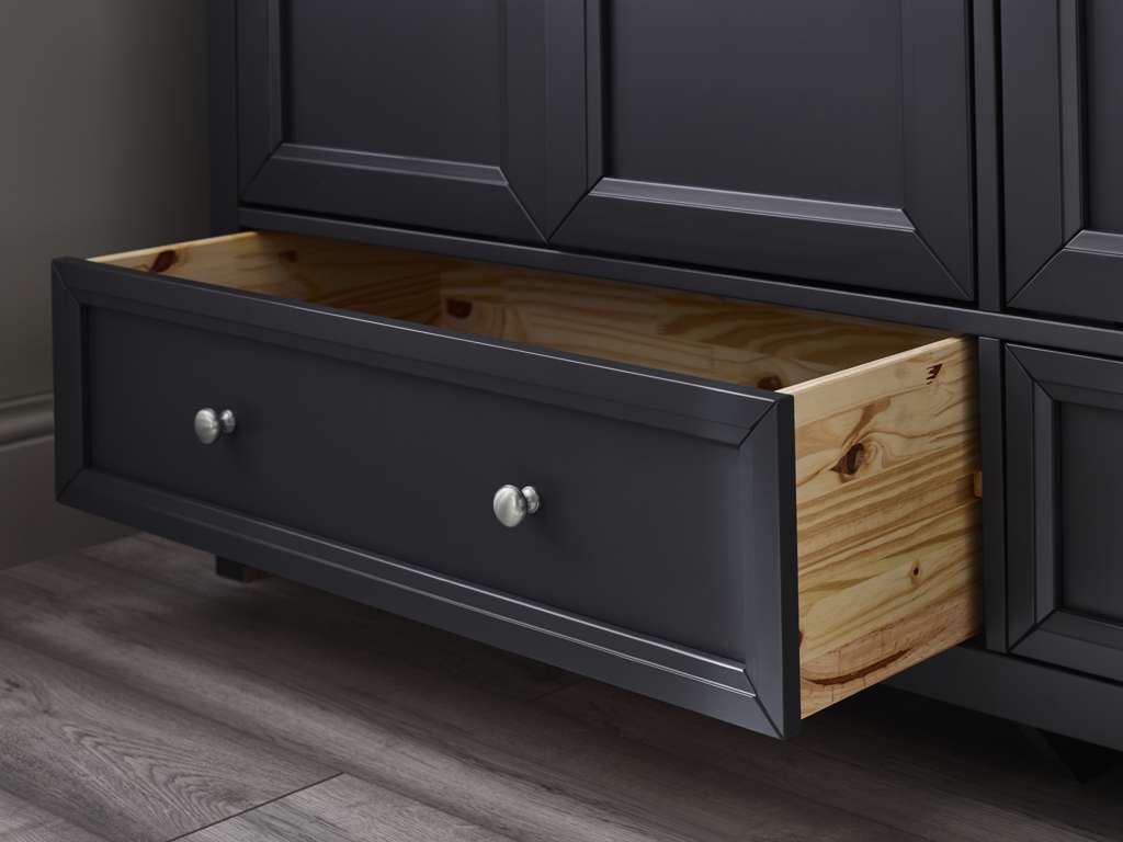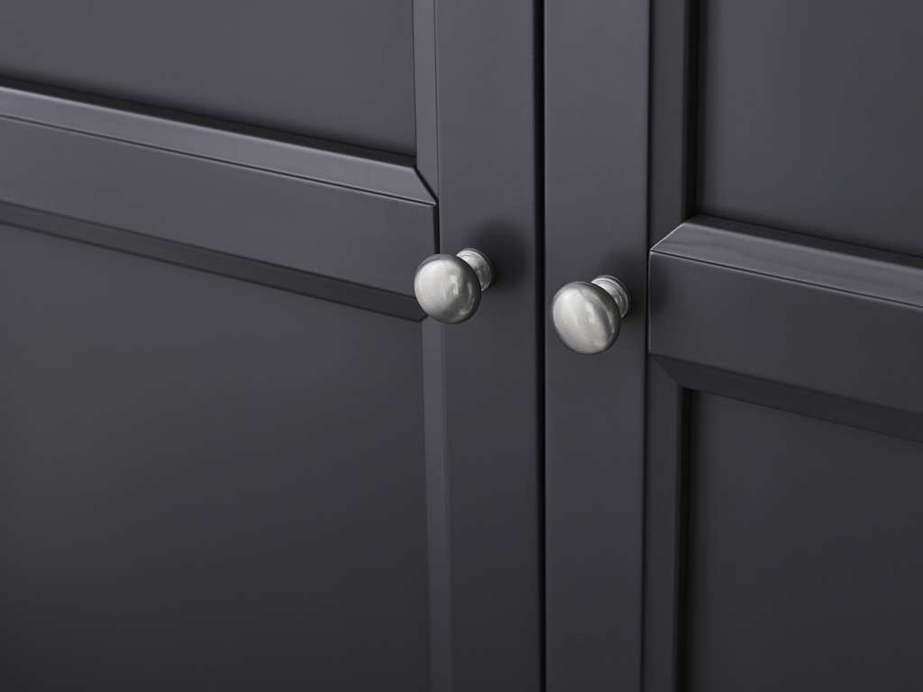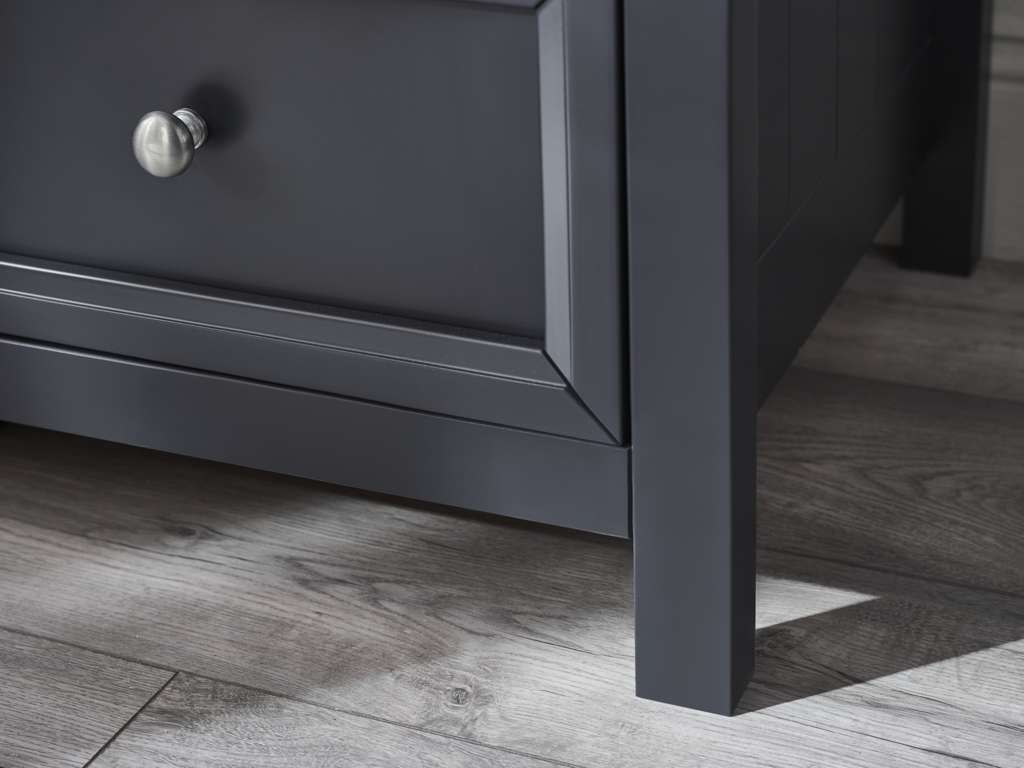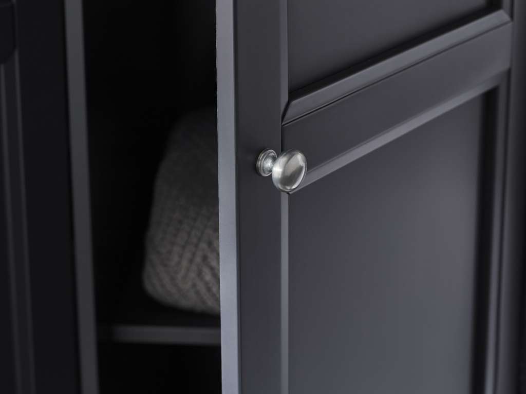 An elegant New England style wardrobe with three doors and two drawers. The combination of exquisite anthracite lacquered finish with characteristic side panelling and detailed chamfered cabinetry makes for a soothing and refined aesthetic with timeless appeal, while delicate pewter handles add the perfect finishing touch.