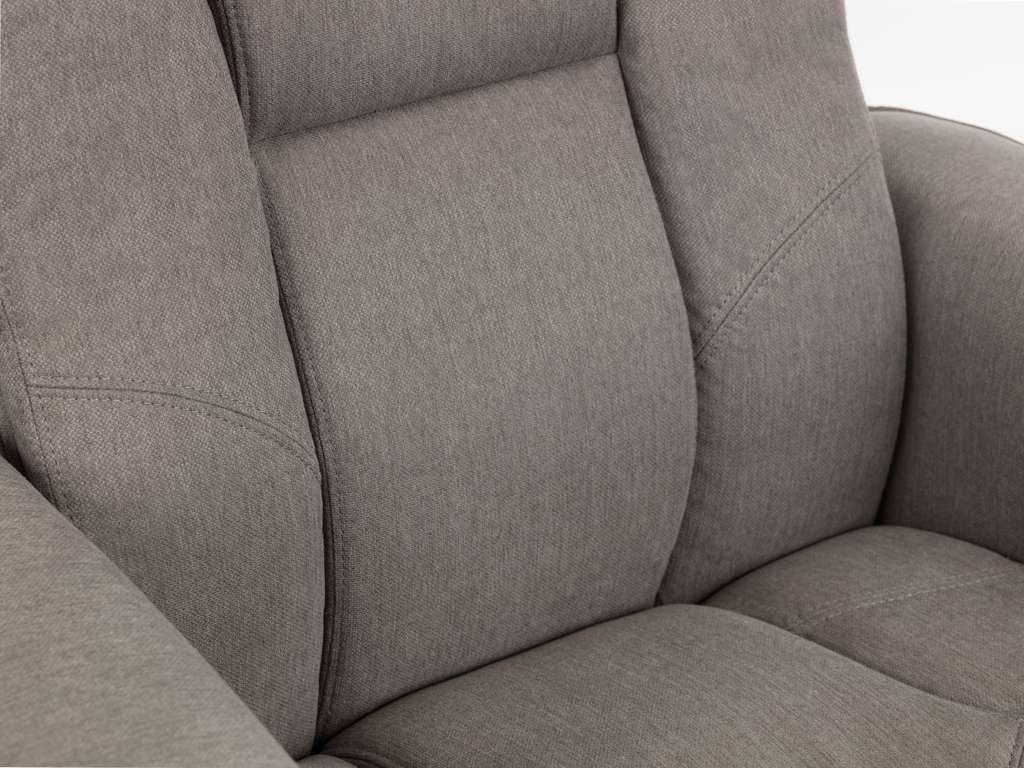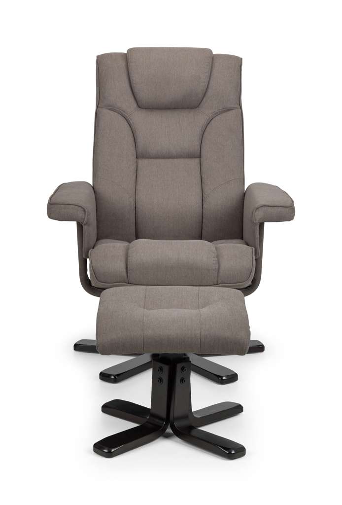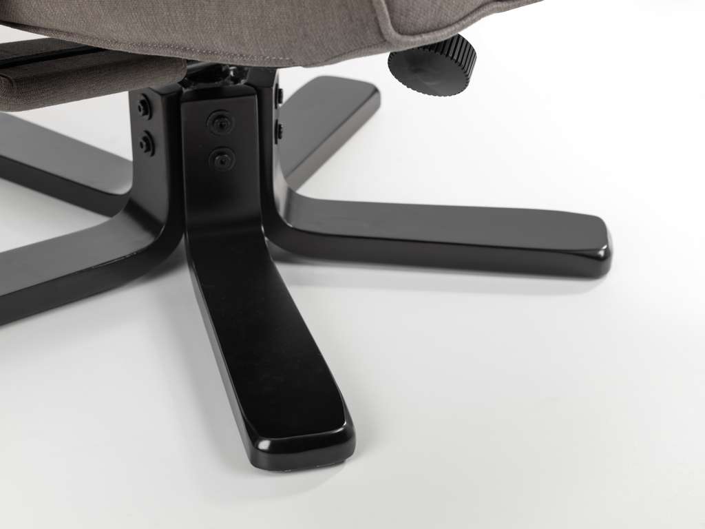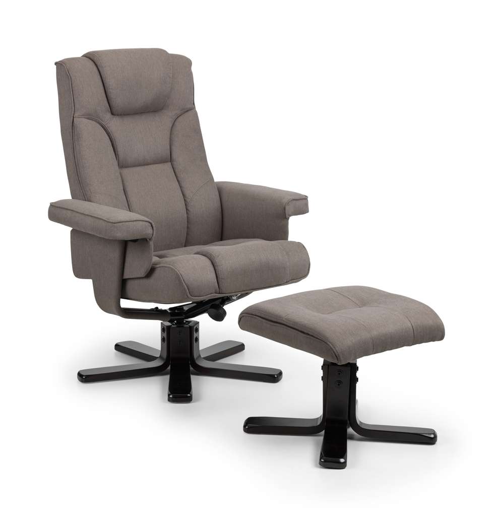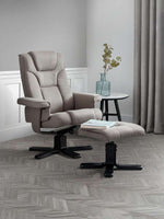 The Malmo reclining swivel chair and stool is upholstered in a grey linen fabric with a black colour laminated base. This chairs offers the ultimate in complete sitting comfort and relaxation.