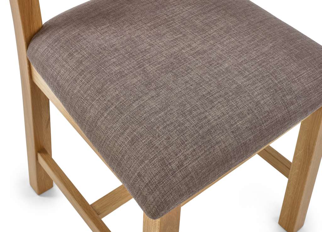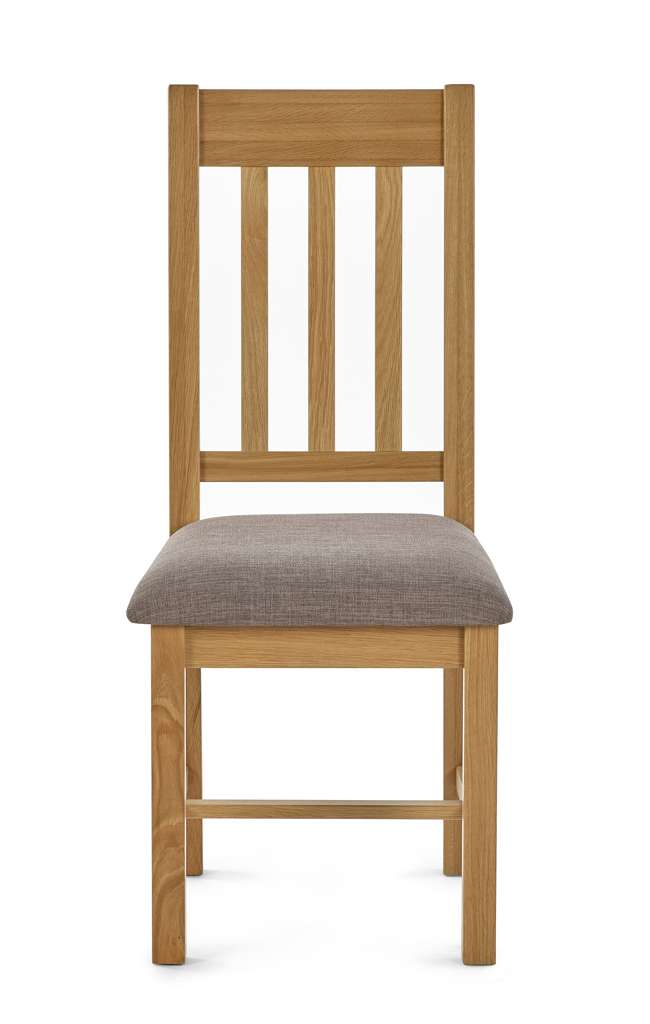 The Mallory Dining Chair features a slatted back that is angled for support allowing for comfort and durability. Crafted from solid oak and oak veneers with a grey seat pad, this dining chair combines a simple and stylish design. Perfect match for the Mallory Extending Dining Table.