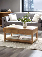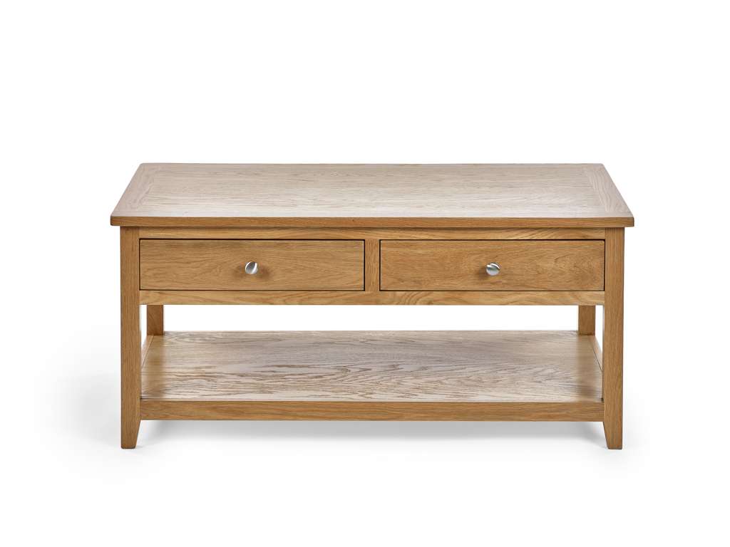 Crafted from solid oak and oak veneers, the Mallory Coffee Table features 2 drawers and a spacious shelf for added storage space. The simple and stylish design with beautiful silver knobs is the ideal focal point for any living room.